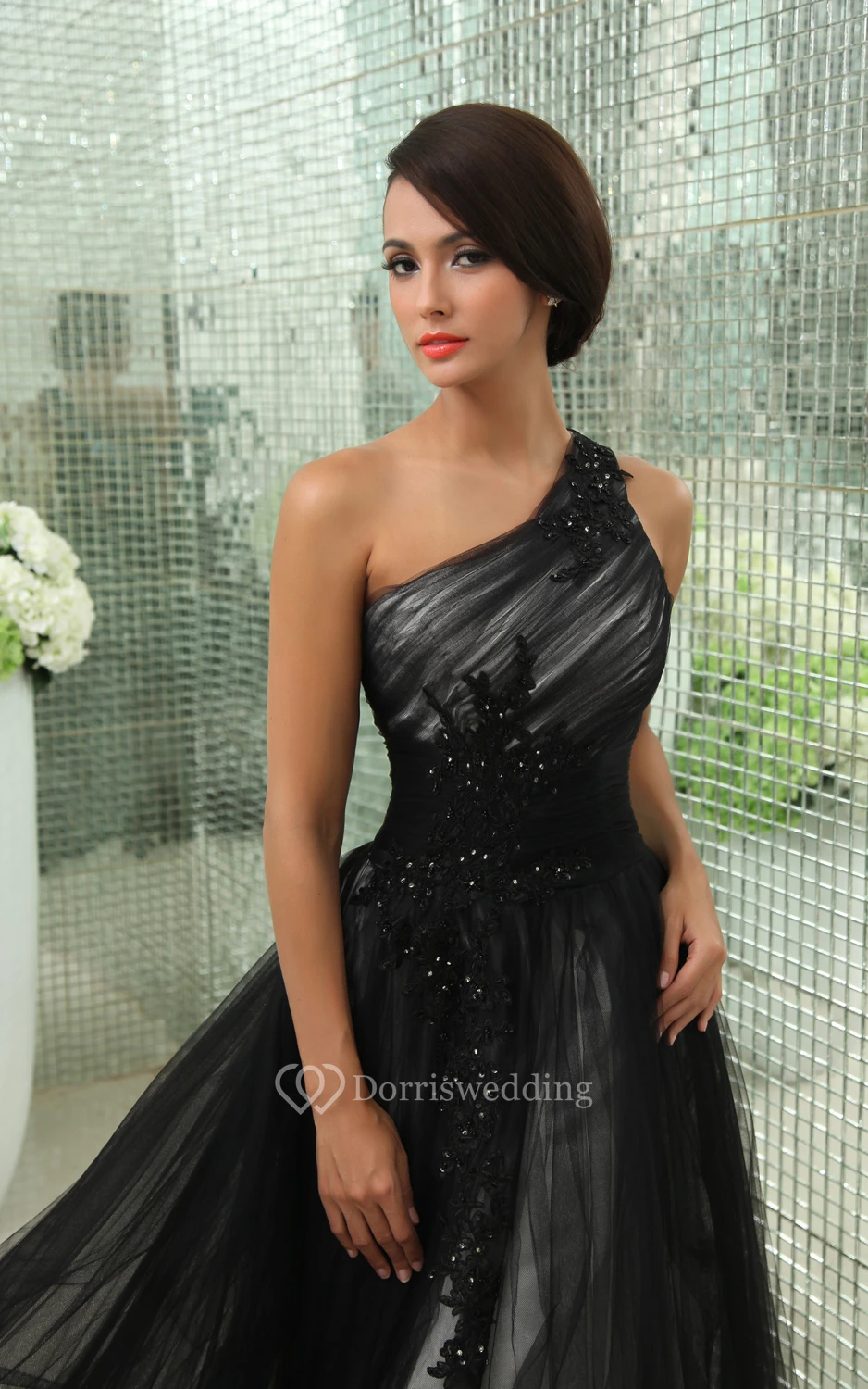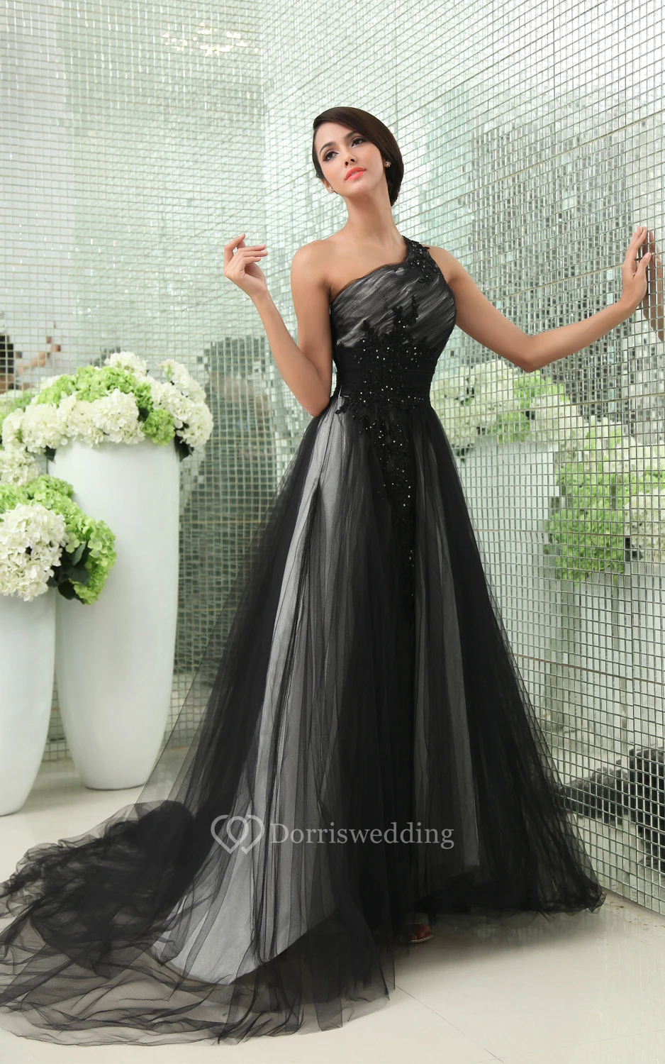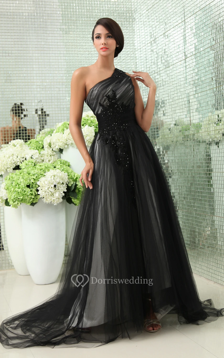 Graceful One-Shoulder Layered Tulle Gown With Side Zipper
