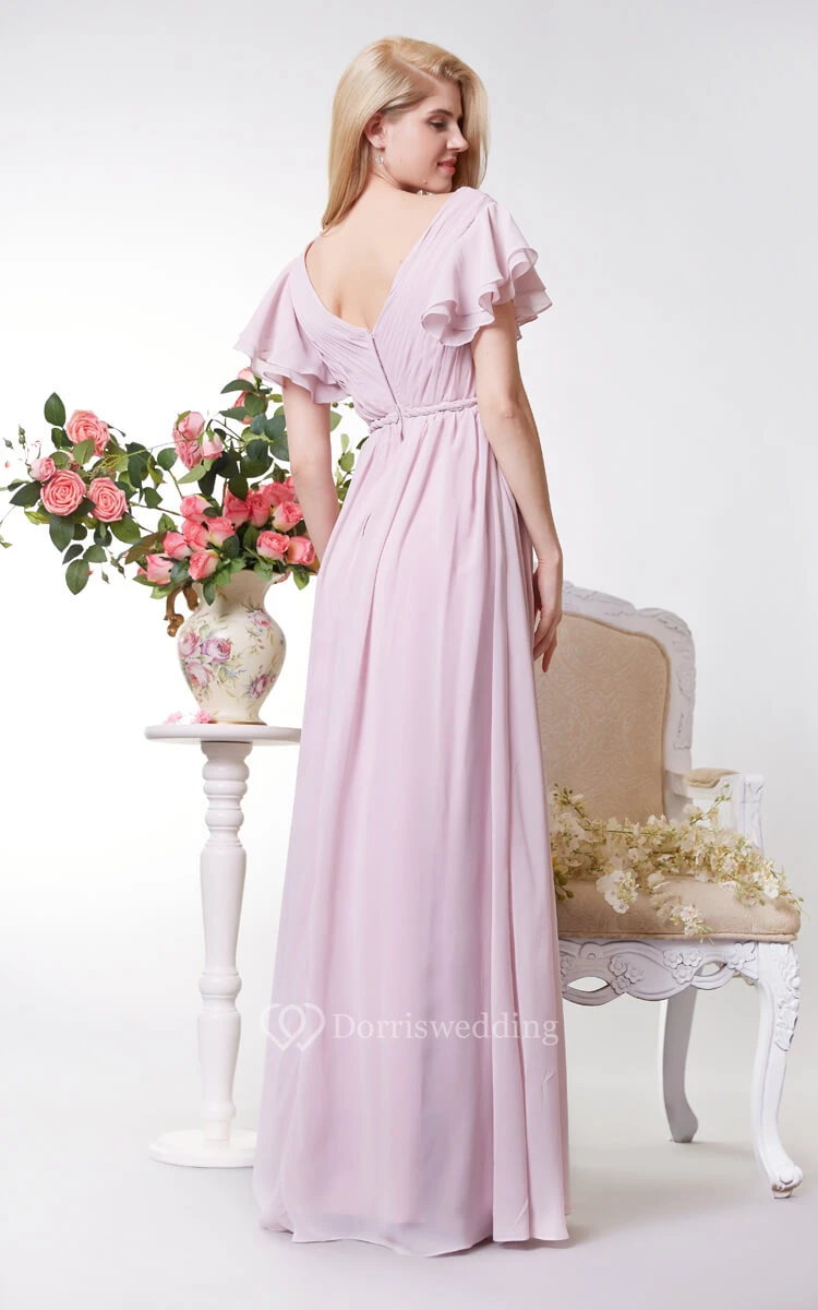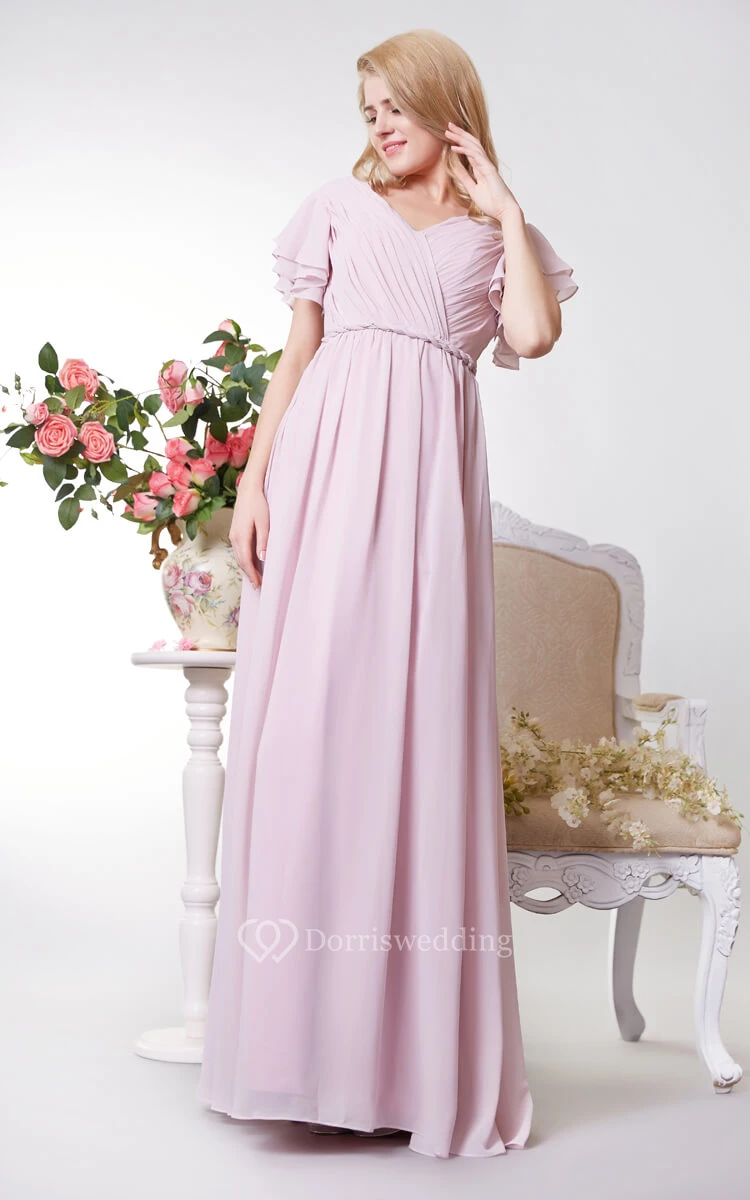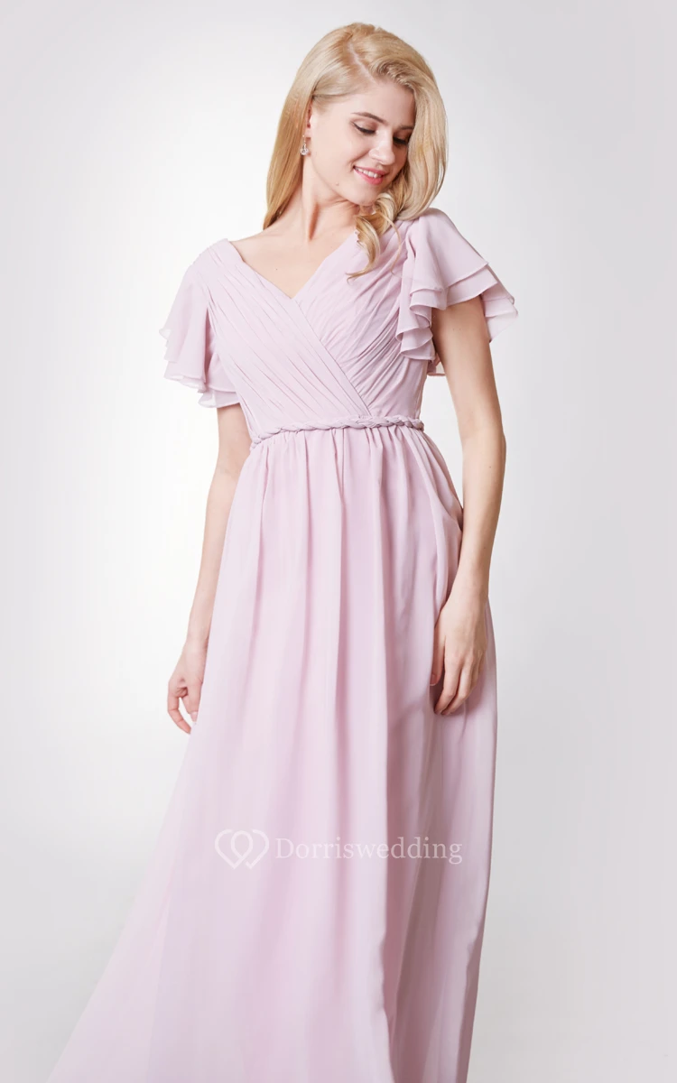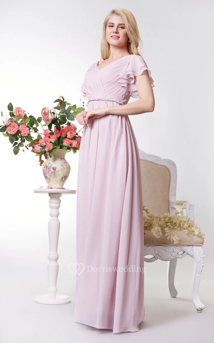 Graceful V-neck Empire Chiffon A-line Gown With Ruffled Sleeves