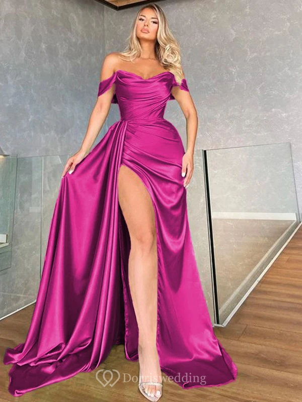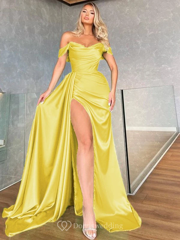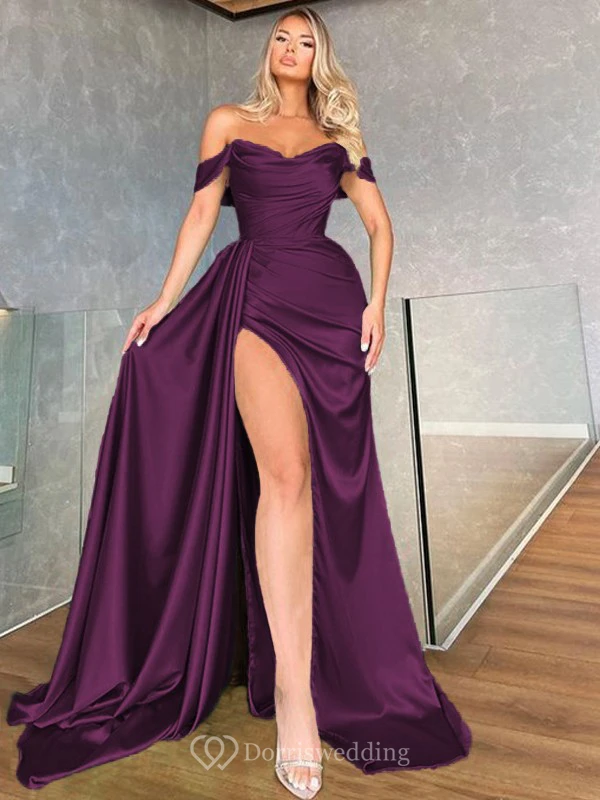Green Off-the-shoulder Sexy Front Split Simple Ruched Evening Prom Dress