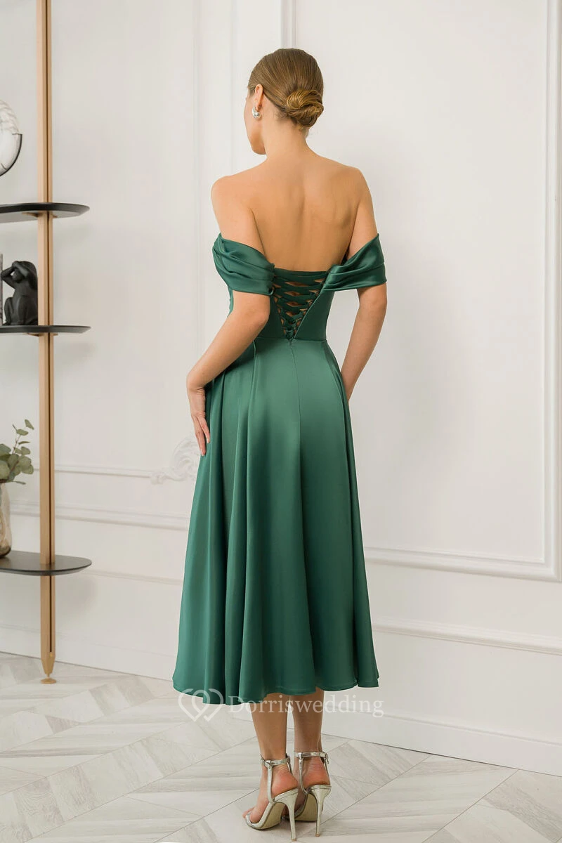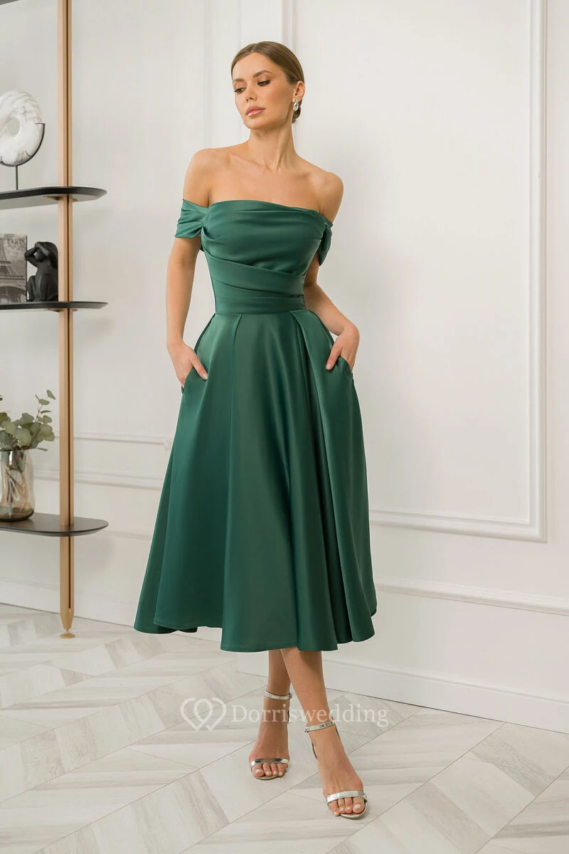 Green Ruched Off-the-shoulder Tea-length Satin Elegant Dress