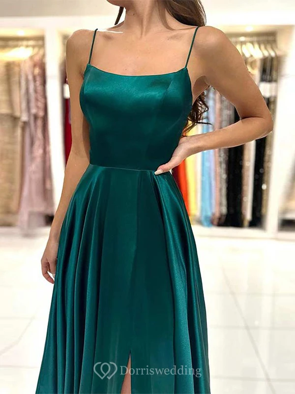 Green Spaghetti A-line Front Split Simple Satin Prom Dress
