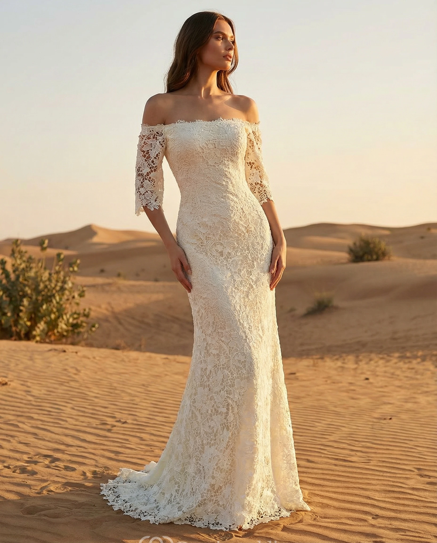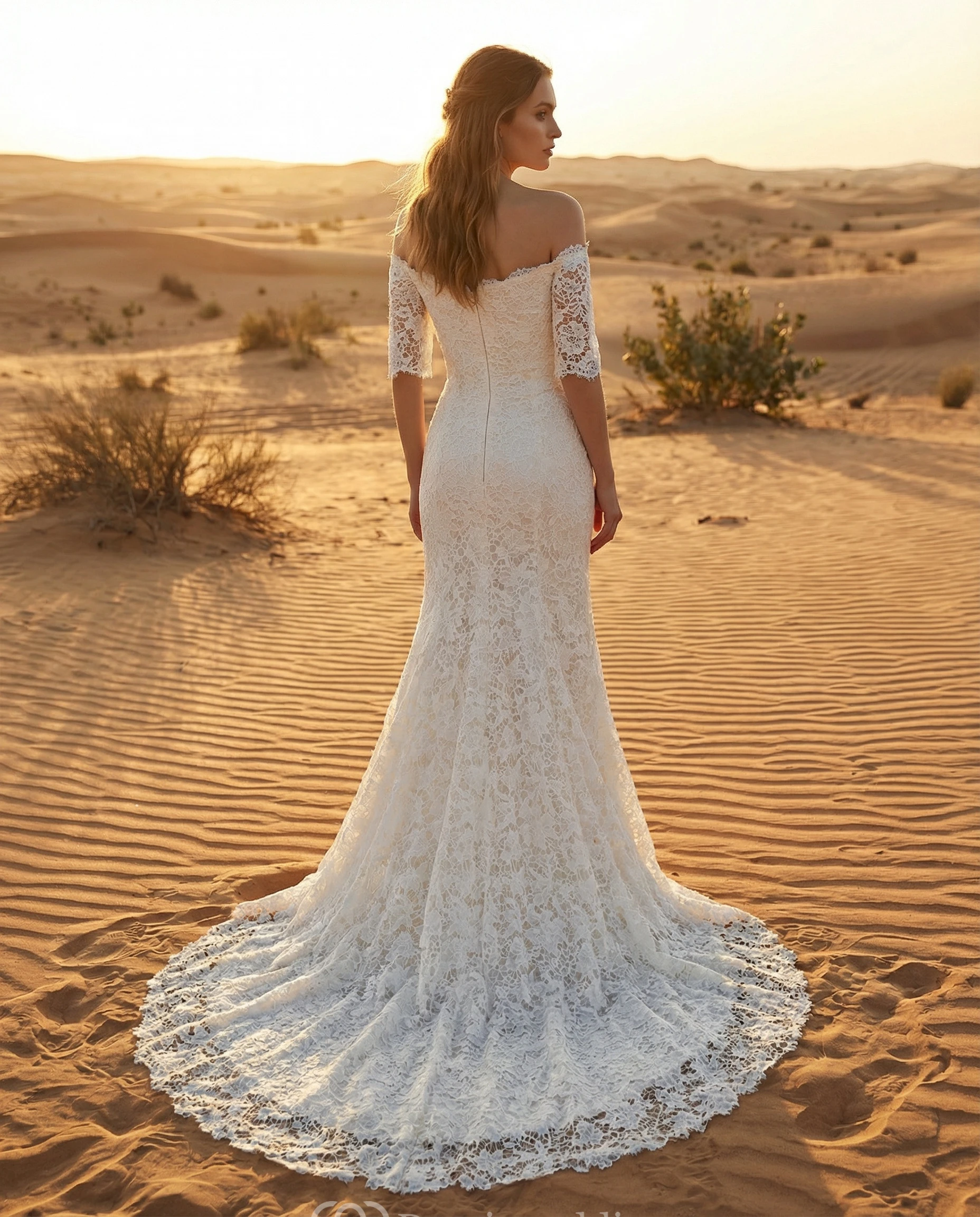 Half Long Sleeve Lace Bohemian Bridal Gown