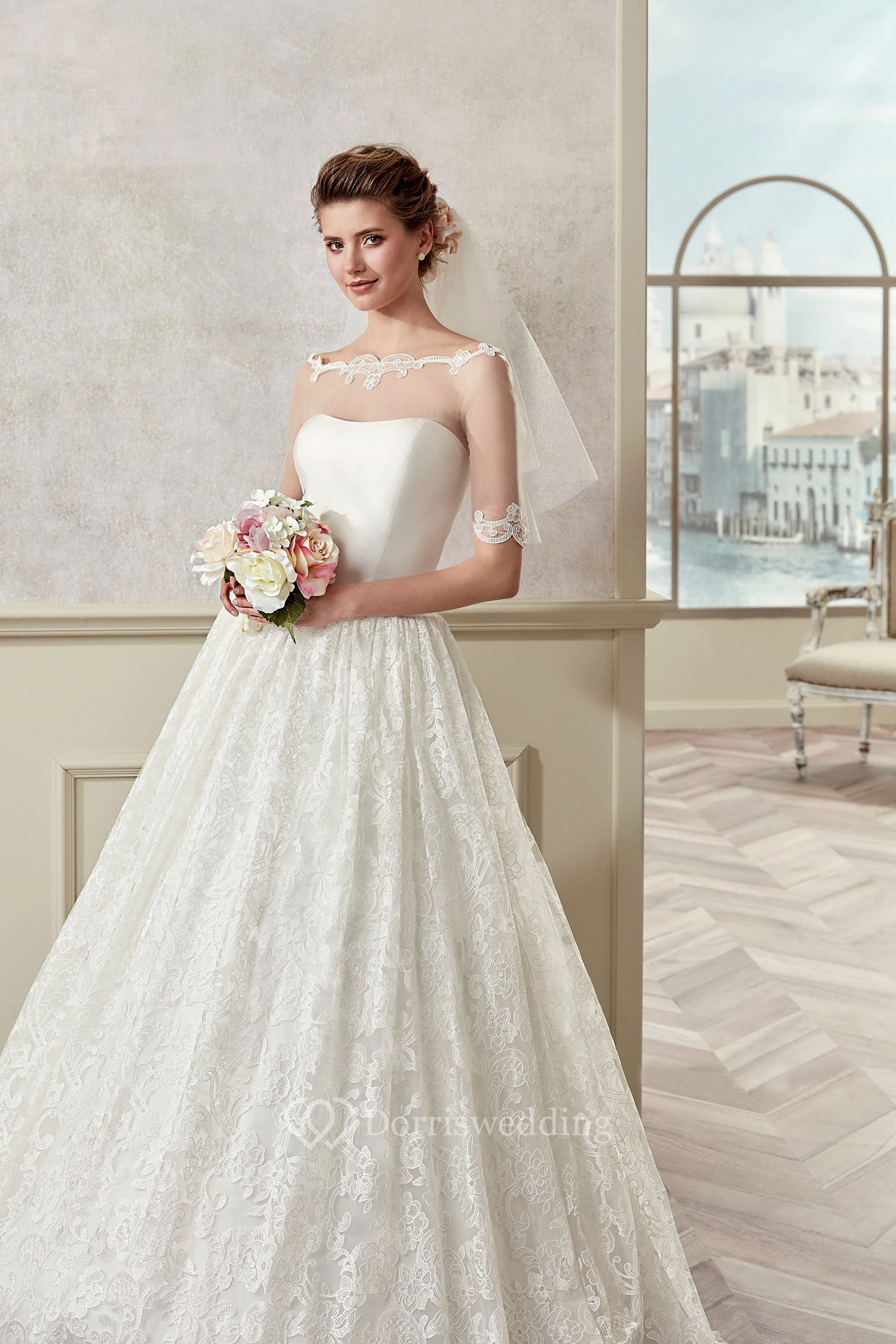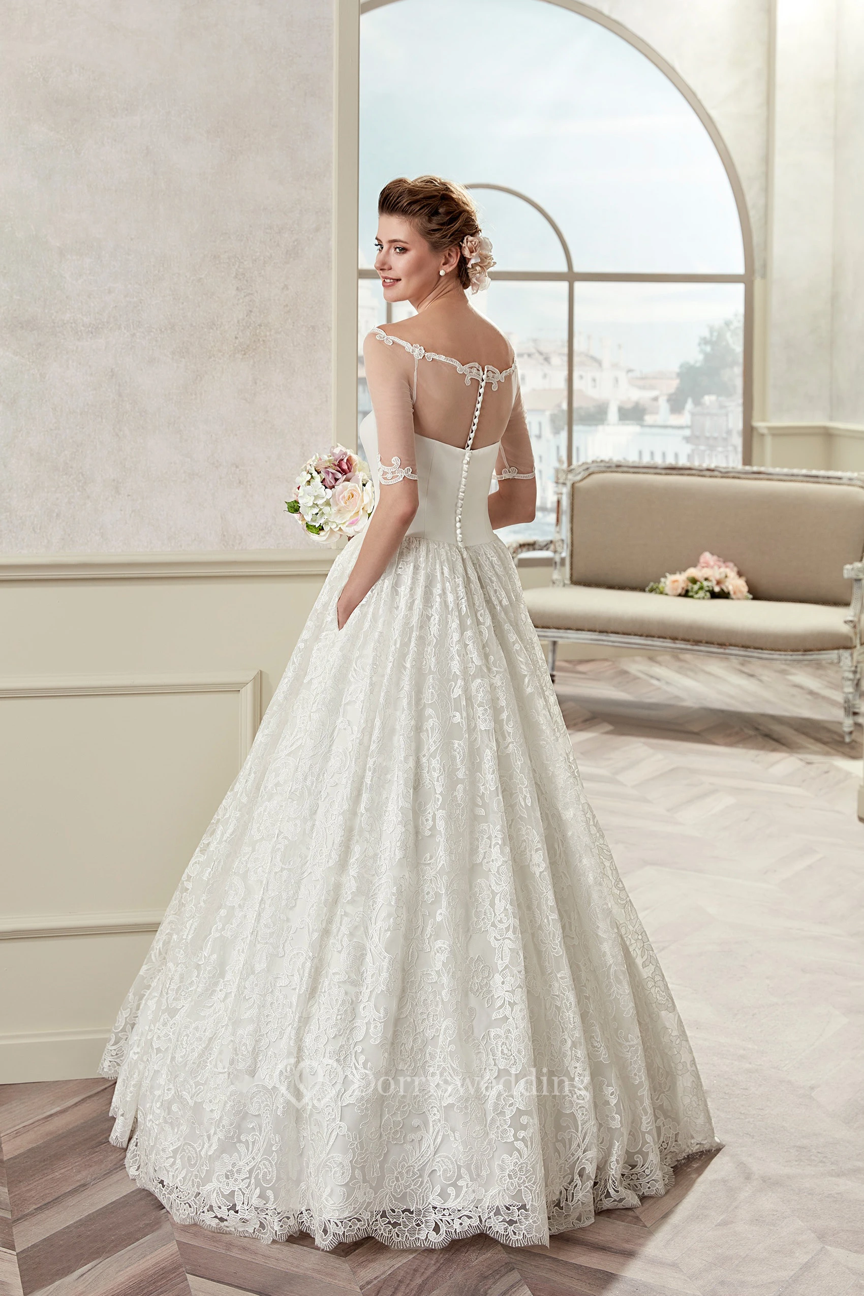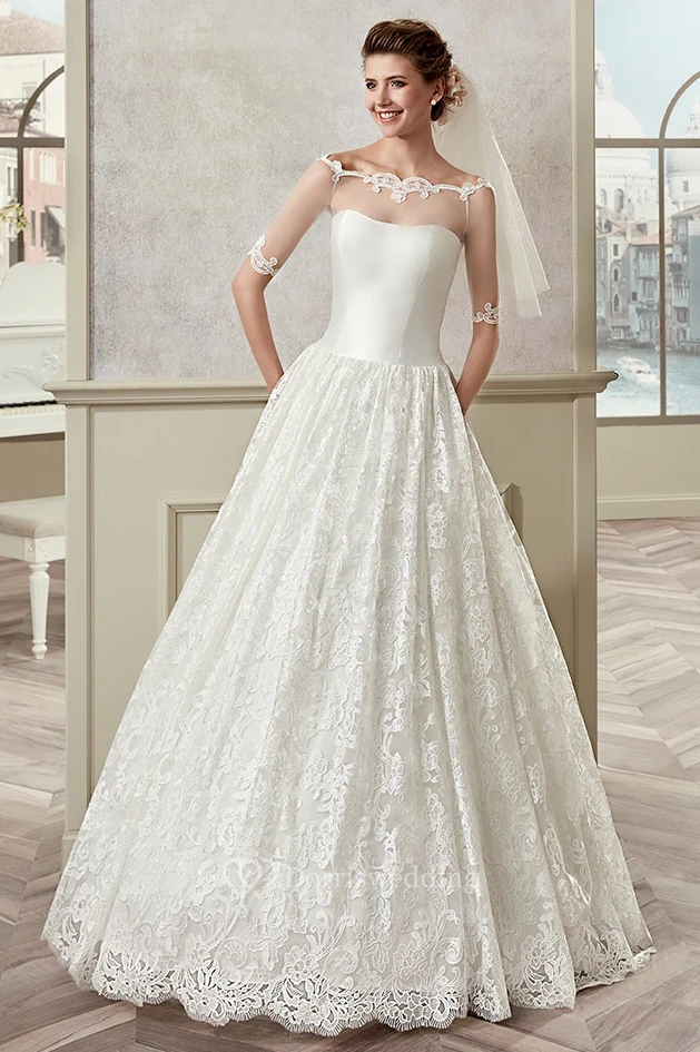 Half-Sleeve A-Line Bridal Gown With Off Shoulder And Illusive Design