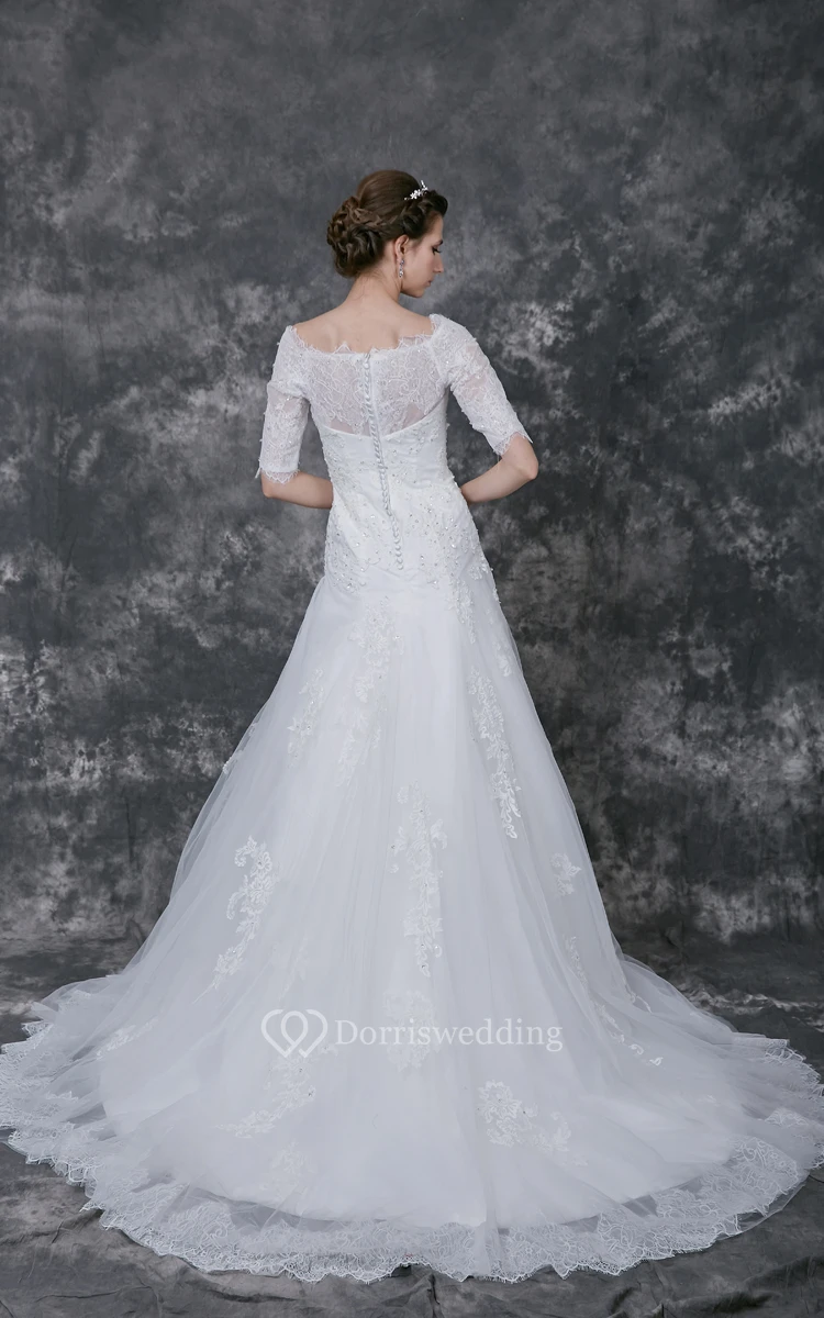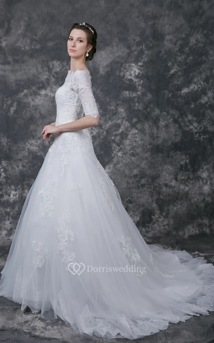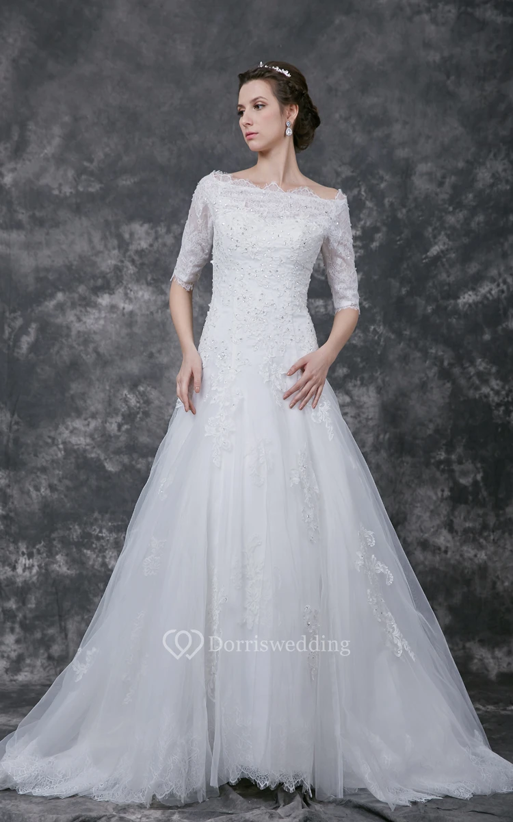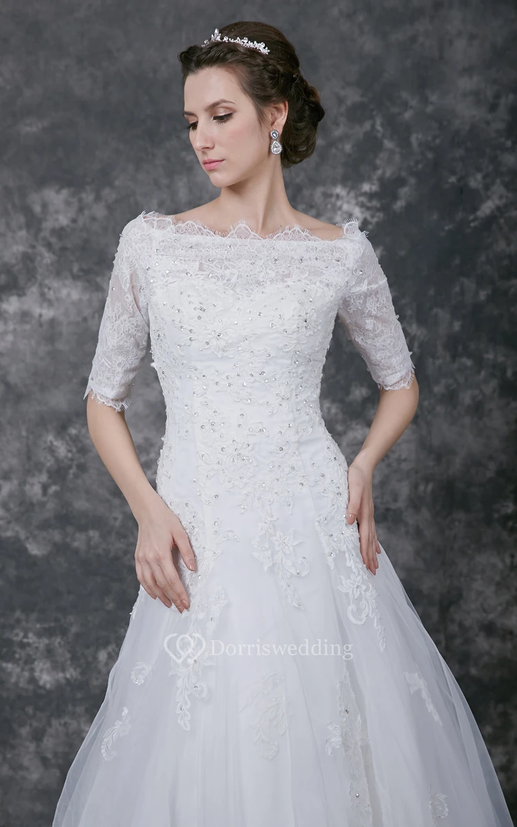 Half Sleeve Bateau Neck A-line Lace Gown With Beading