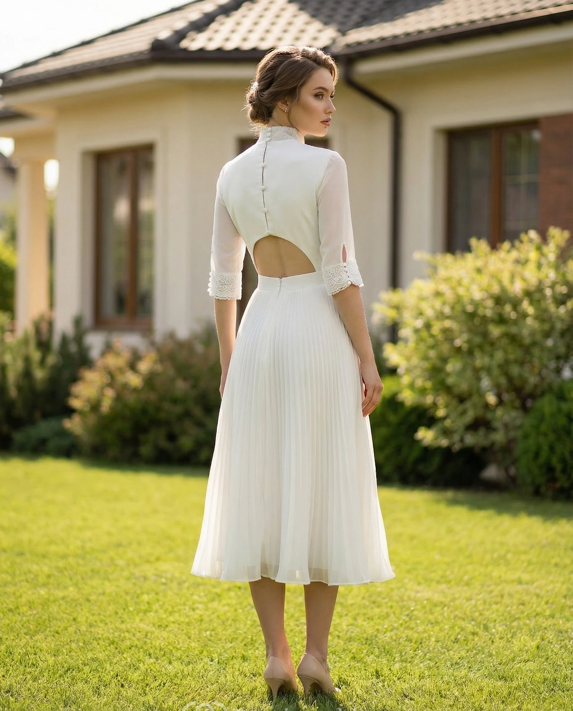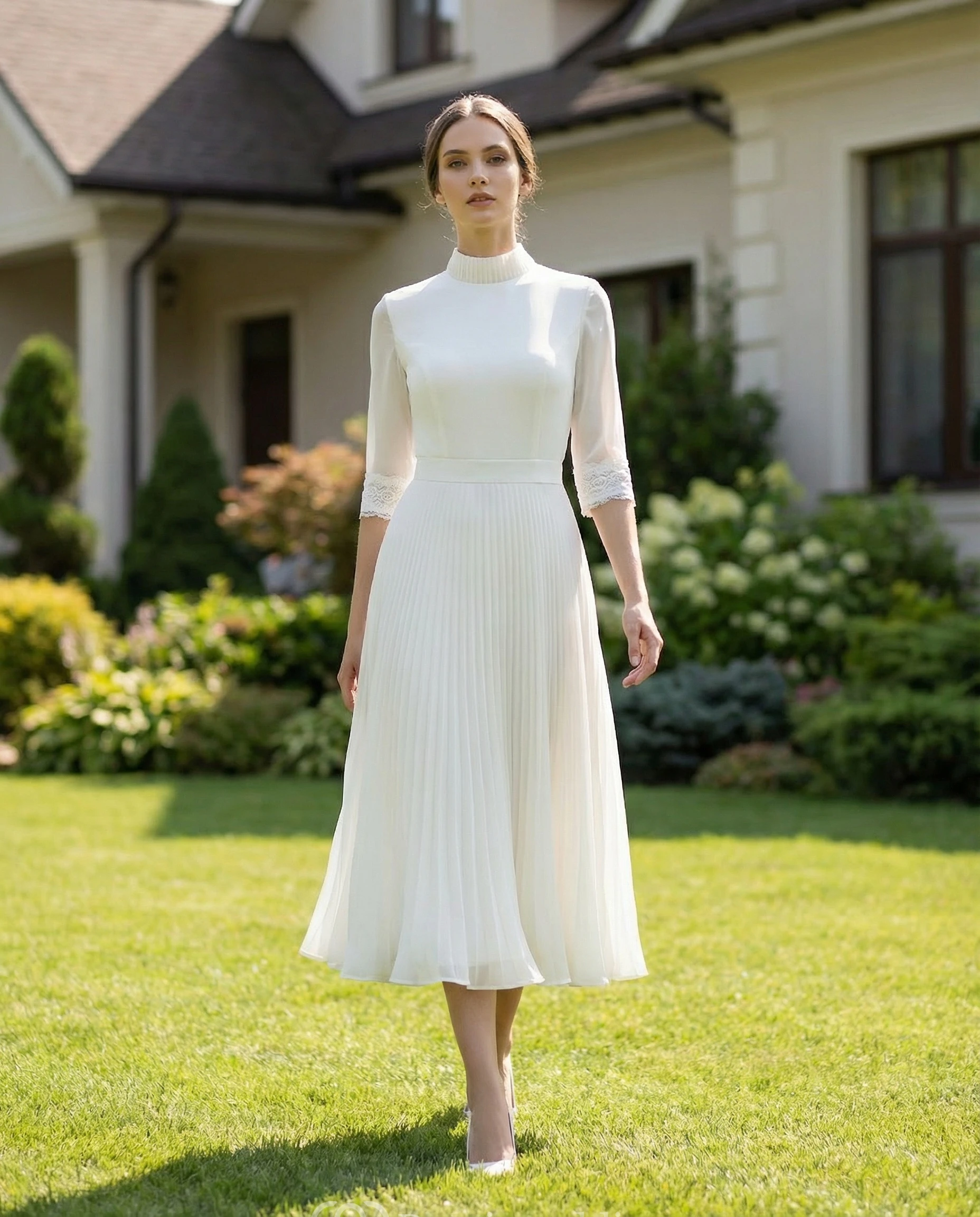 Half-Sleeve Jewel Neck Pleated Chiffon Wedding Dress