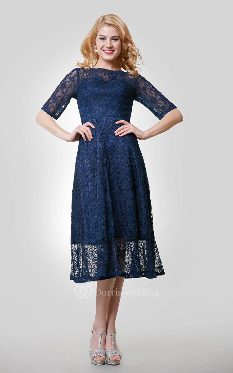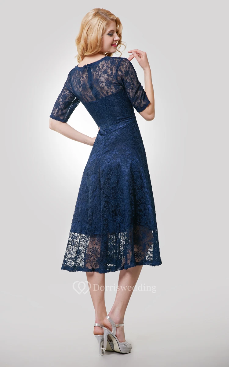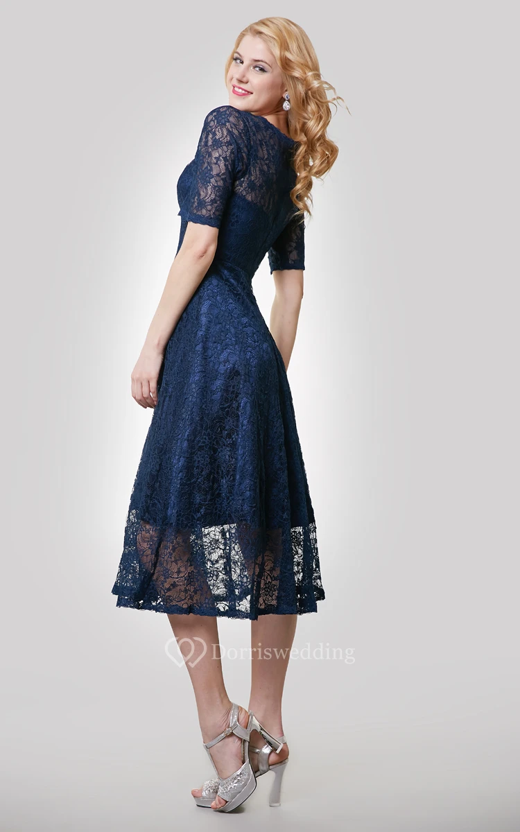 Half Sleeve Lace Tea Length Dress With Jewel Neckline