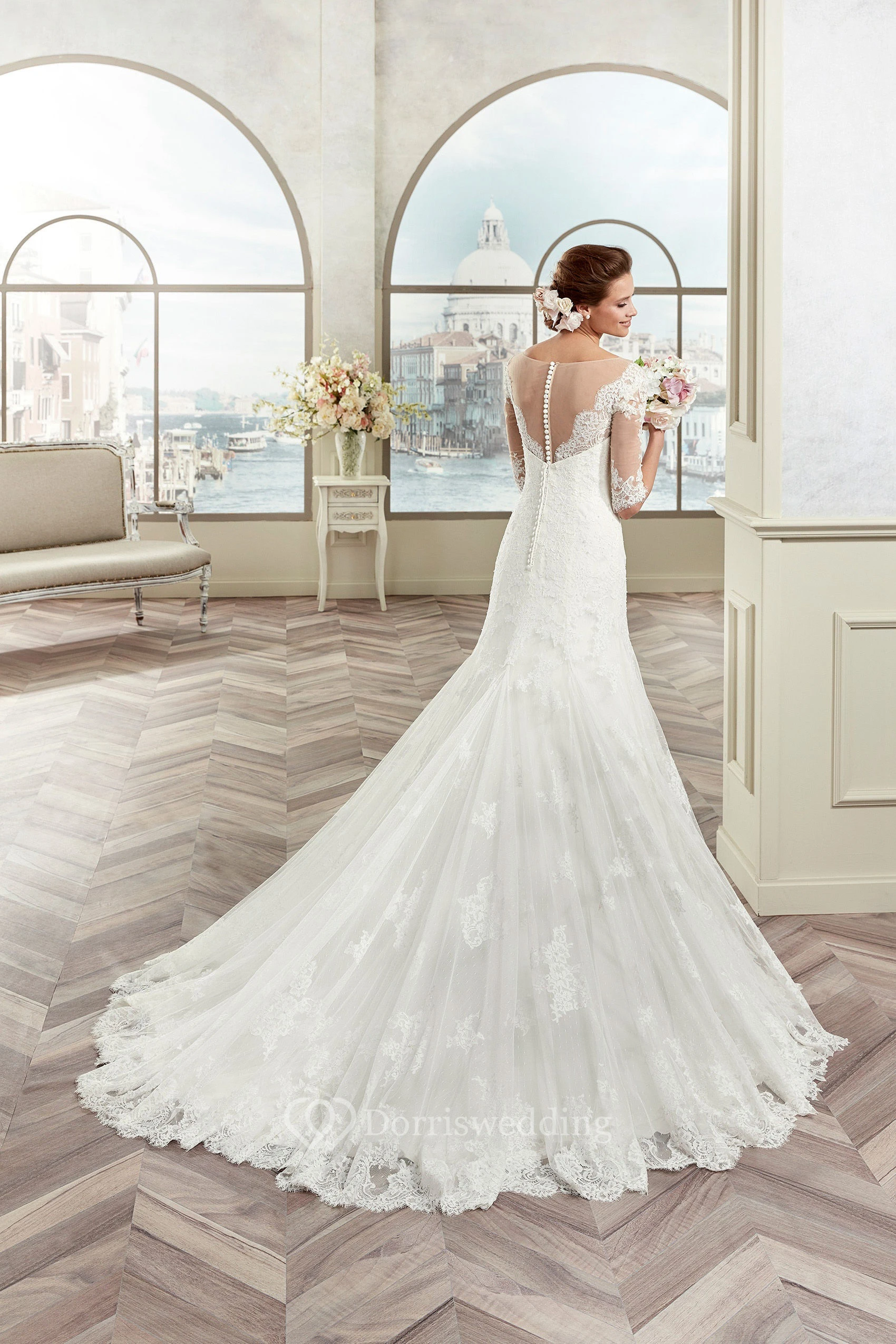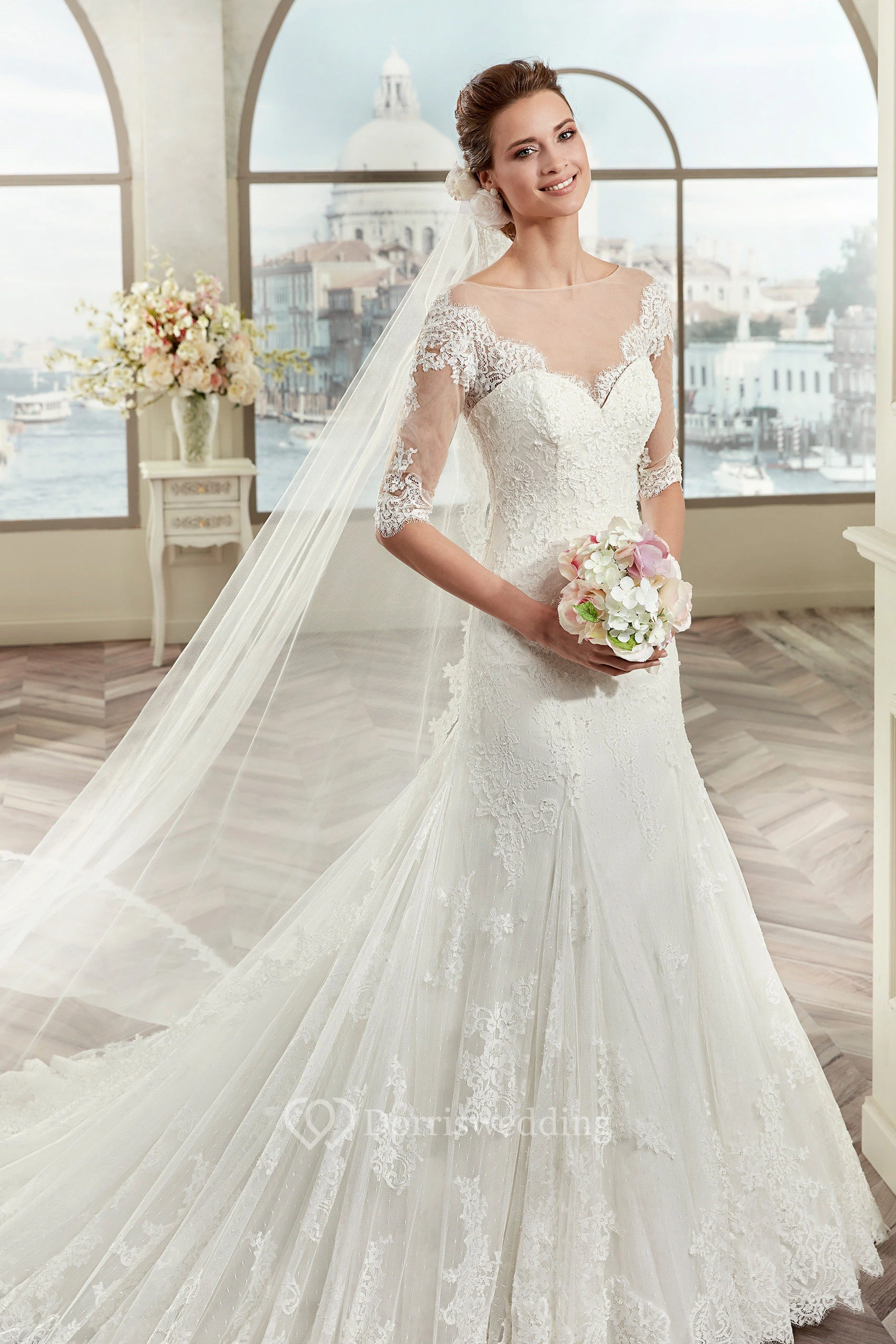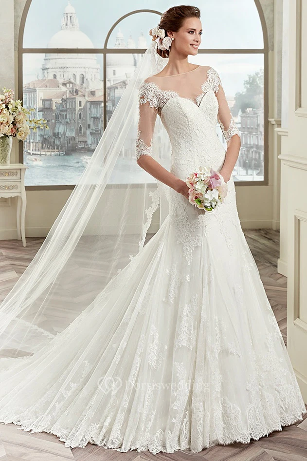 Half-sleeve Lace Wedding Dress with Illusive Design and Brush Train