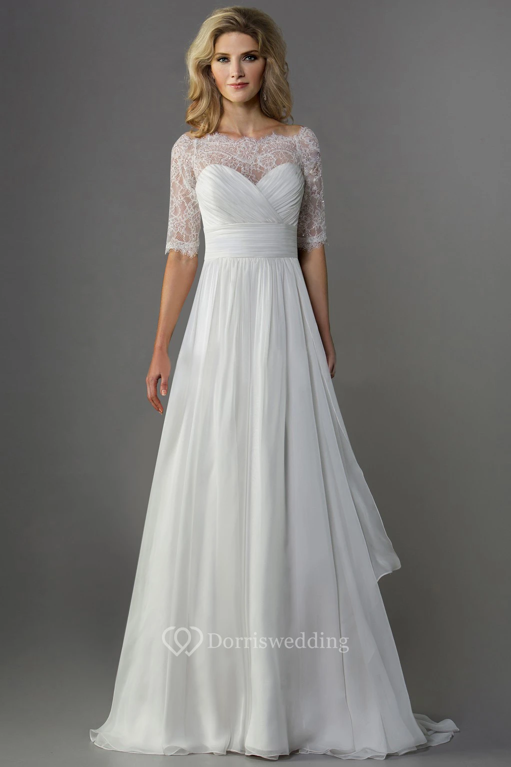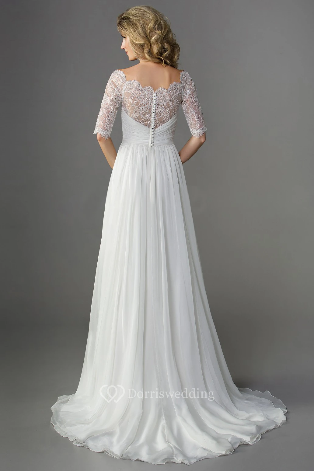 Half-Sleeved A-Line Chiffon Wedding Dress With Illusion Lace Detail