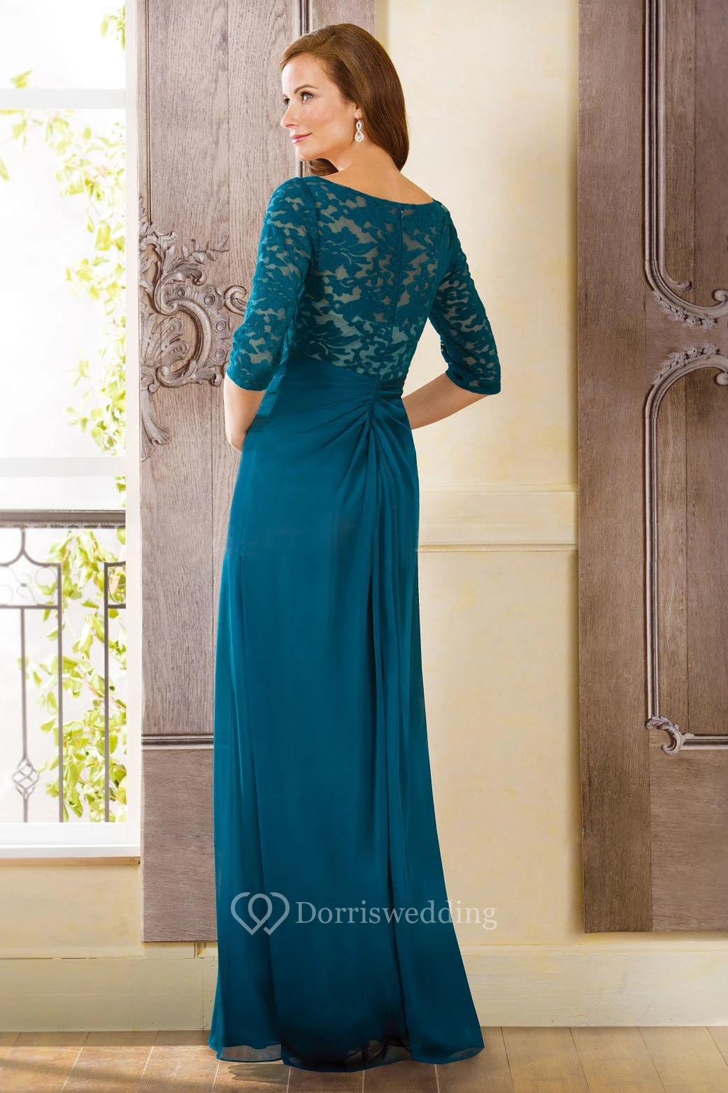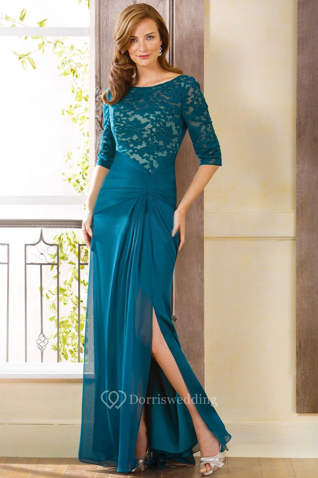 Half-Sleeved Bateau-Neck Long Gown With Side Slit And Lace