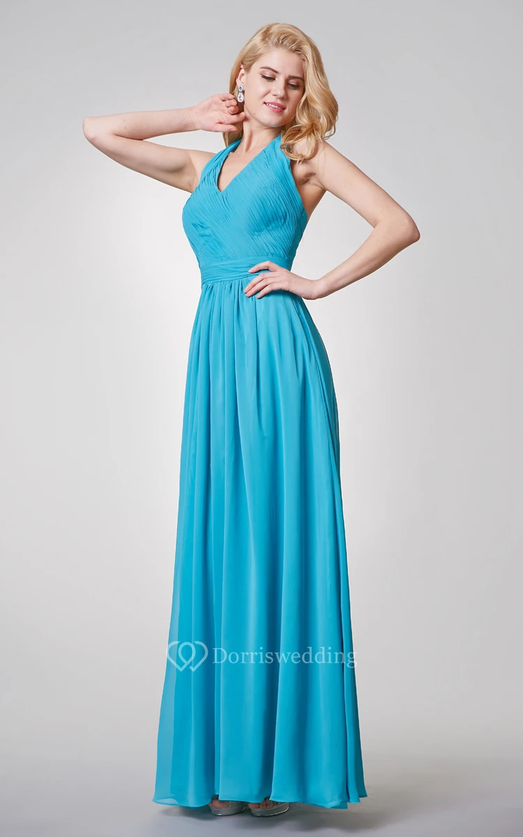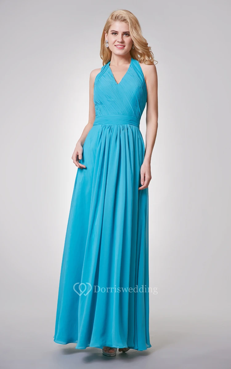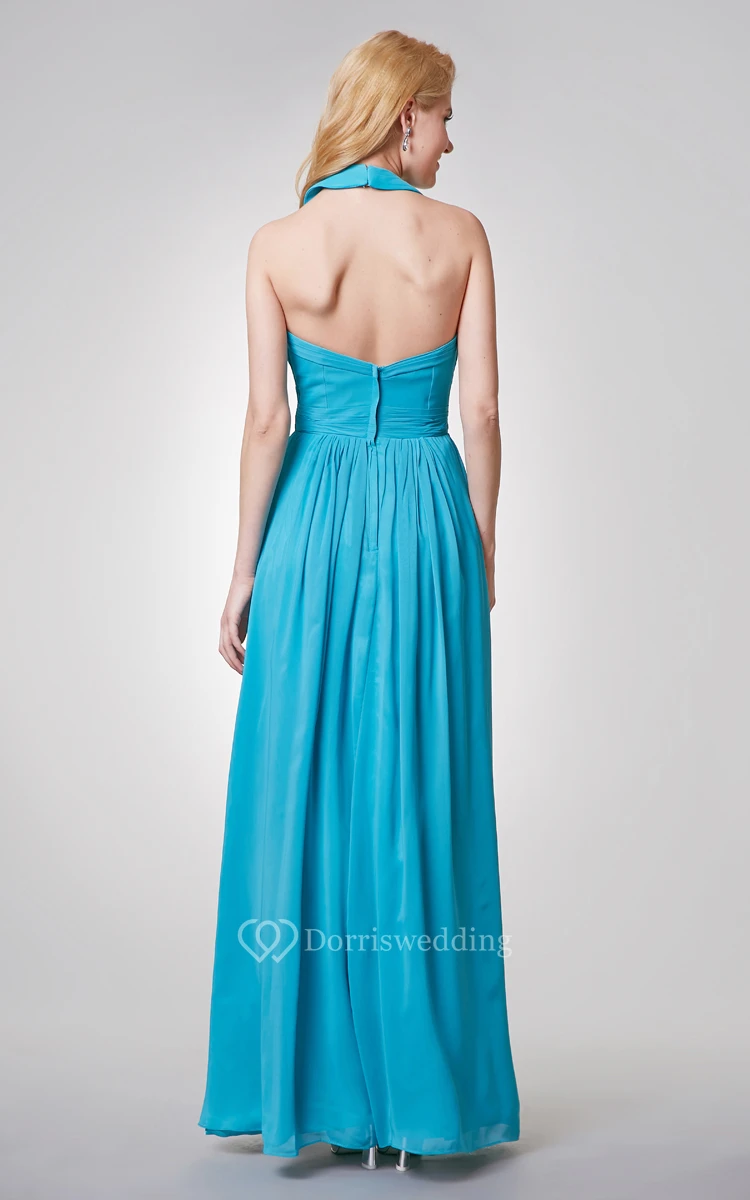Halter A-line Long Chiffon Dress With Ruched Top