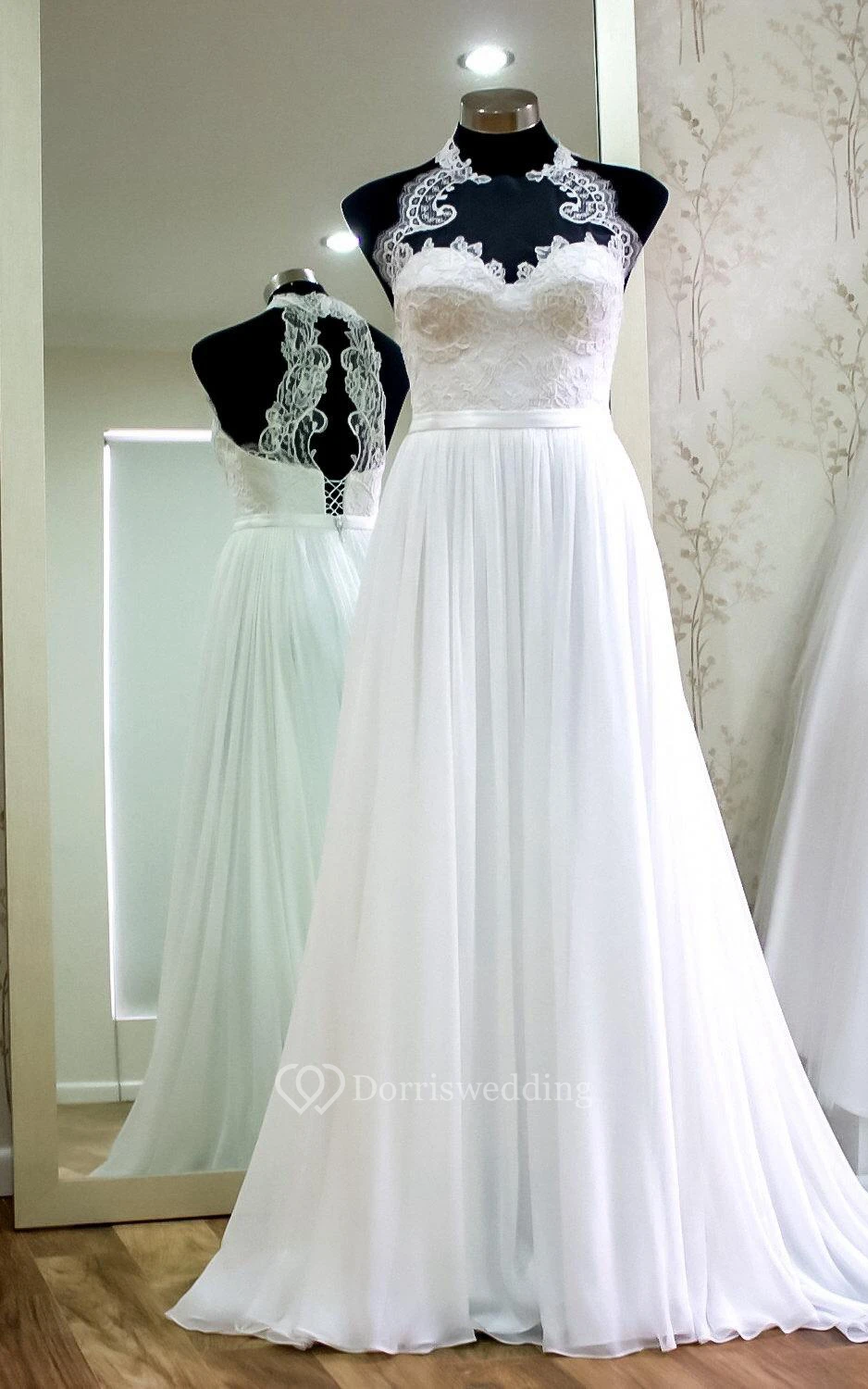 Halter Chiffon A-Line Dress With Lace Bodice and Pleats