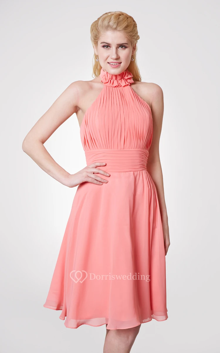 This feminine and flirty halter floral neckline a-line knee length chiffon dress is the perfect choice for any fashionable bridal party. A flattering classic halter neckline is accented by dazzling floral rosettes across the collar and delicate ruching throughout the bodice of the gown. A ruched bandage style waistline slims the figure and complements the flowy knee-length chiffon skirt beautifully.