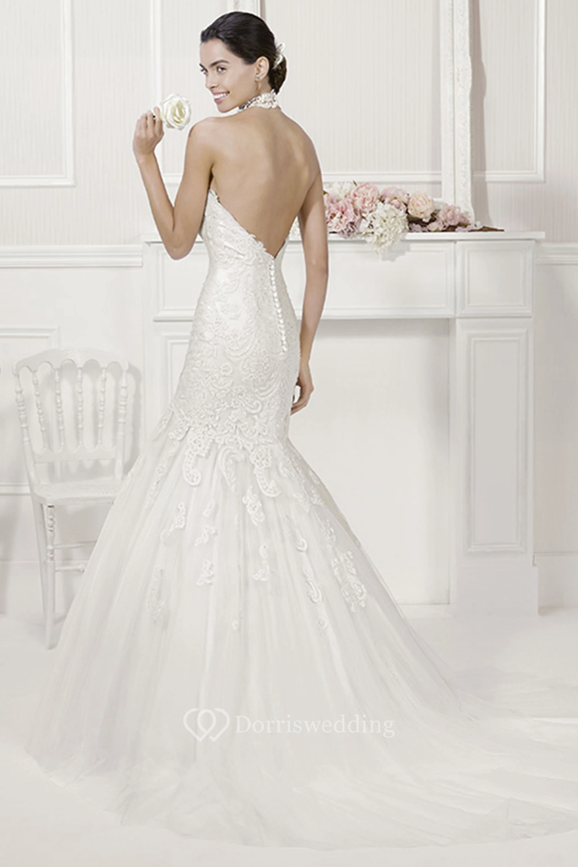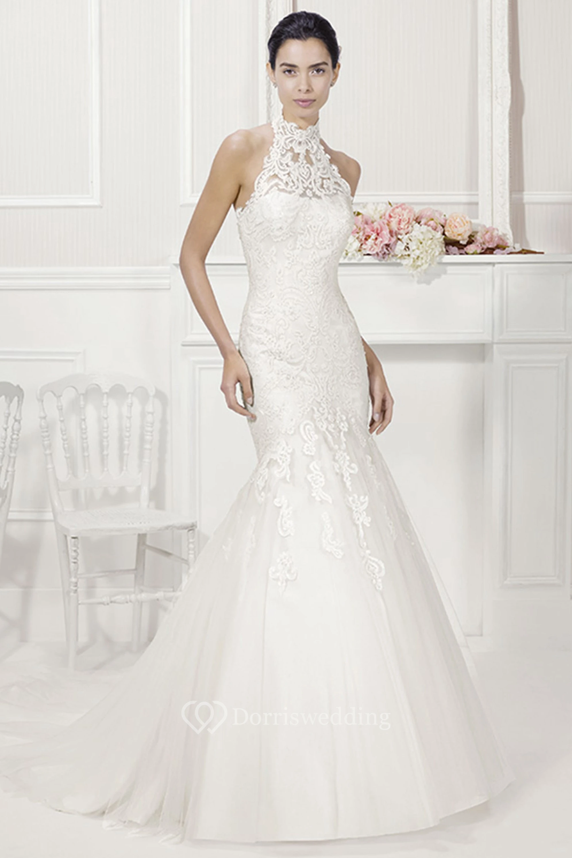Halter Lace Mermaid Bridal Gown With Tulle Skirt