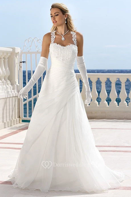 Halter Maxi Appliqued Tulle Wedding Dress With Draping And Keyhole