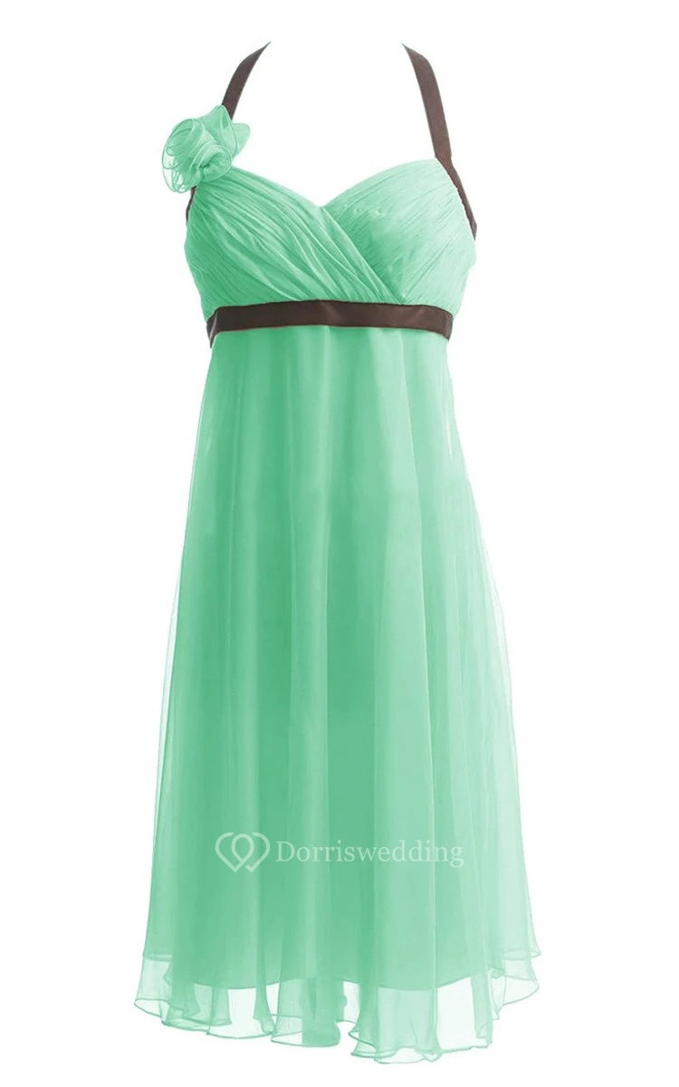 Halter Ruched Empire Gown With Flower and Bow