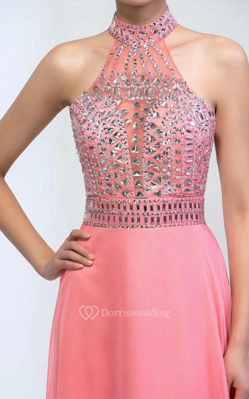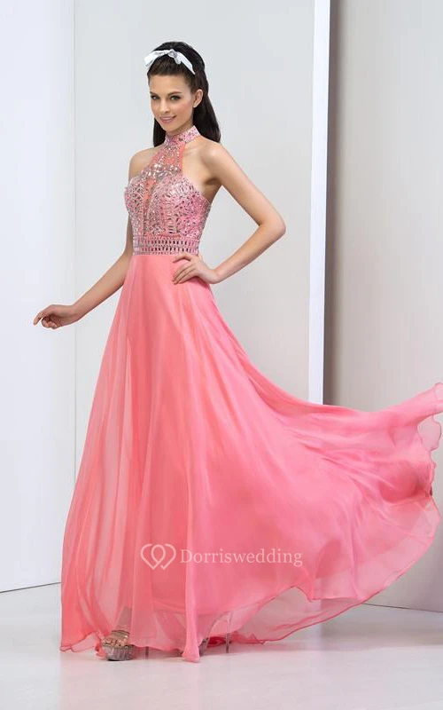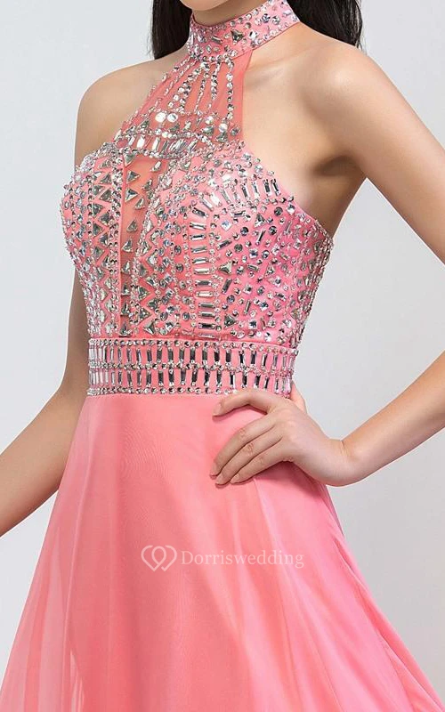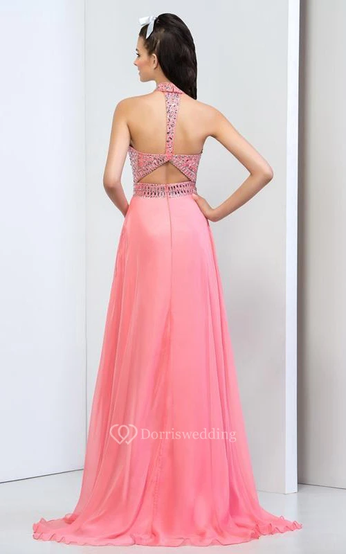 Halter Ruffles Beaded Sweep Train Prom Dress