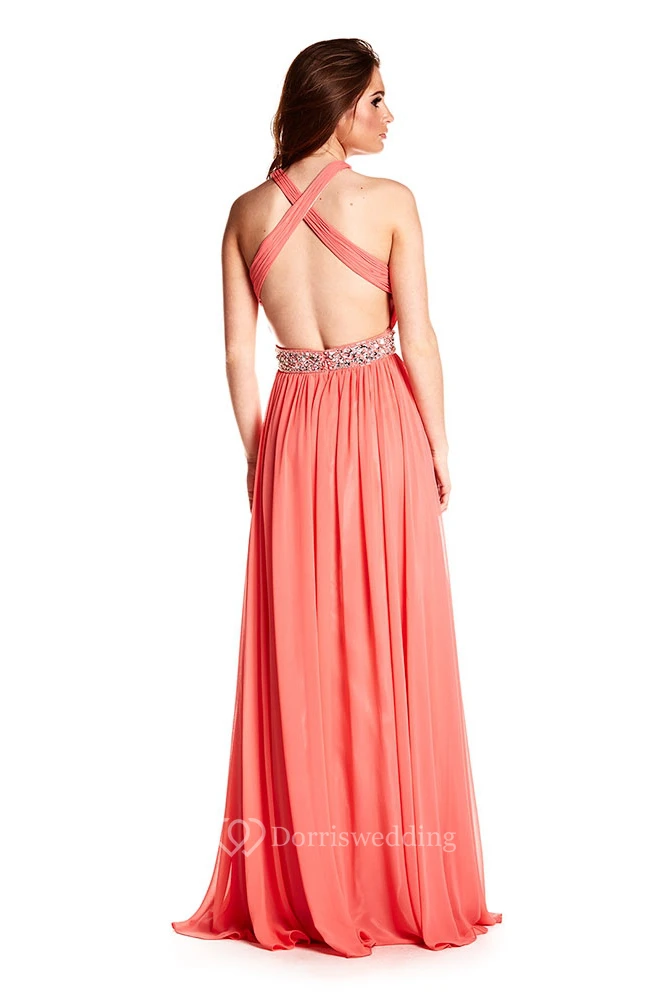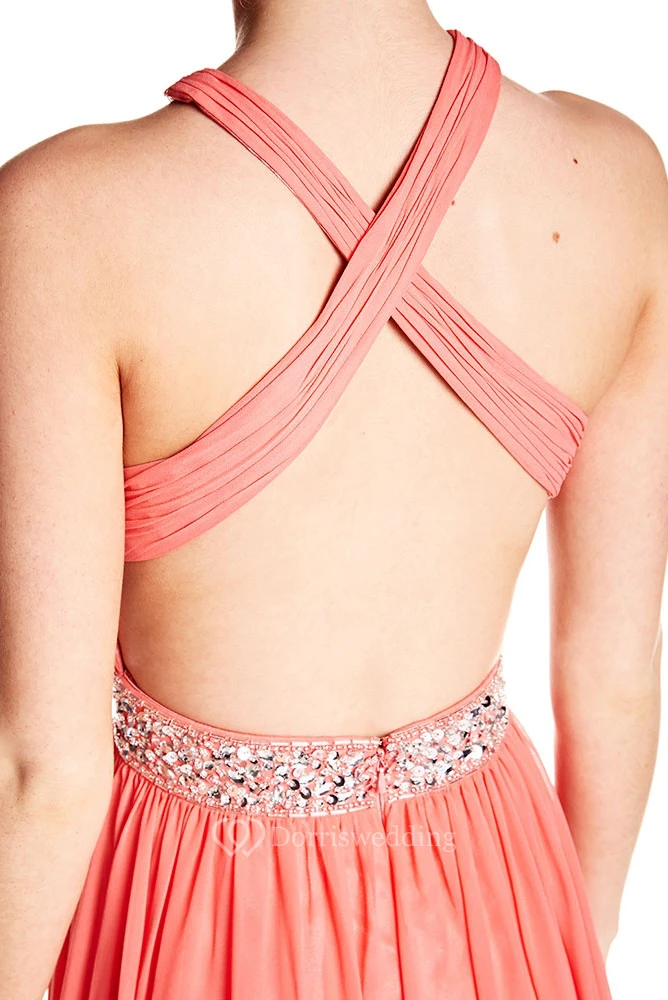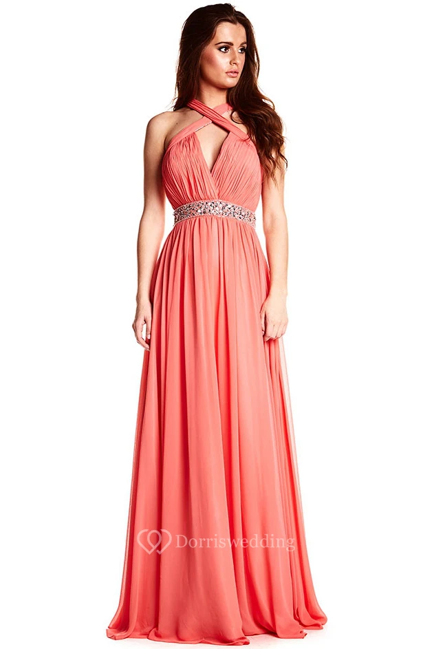 Halter Sleeveless Ruched Chiffon Prom Dress With Beading And Straps