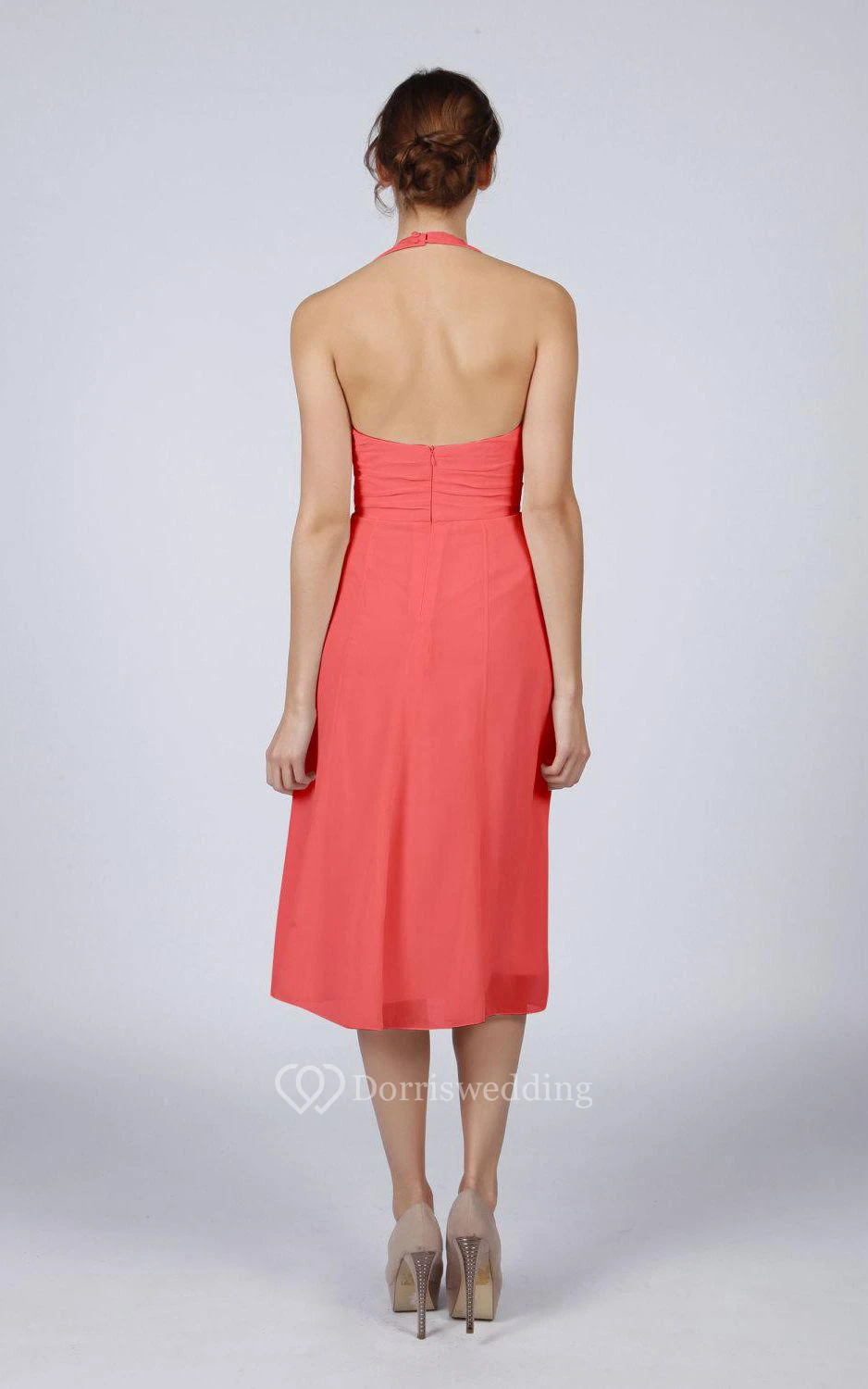 Halter V Neck A-line Chiffon Tea Length Dress Coral