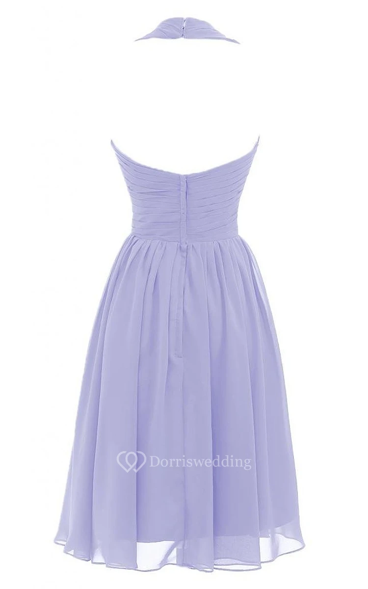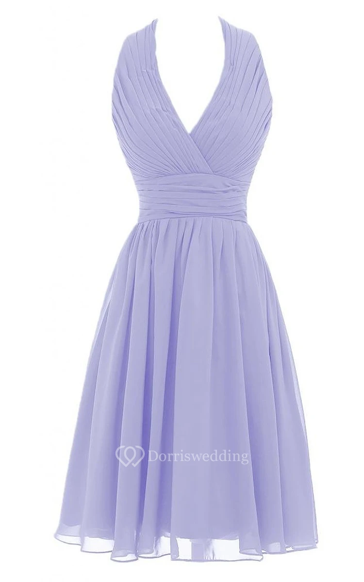 Halter V-neck Pleated Short Dress With Ruched Band