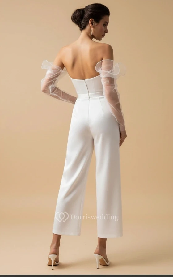 Heart Neck Transparent Sleeve Wide Leg Wedding Jumpsuit