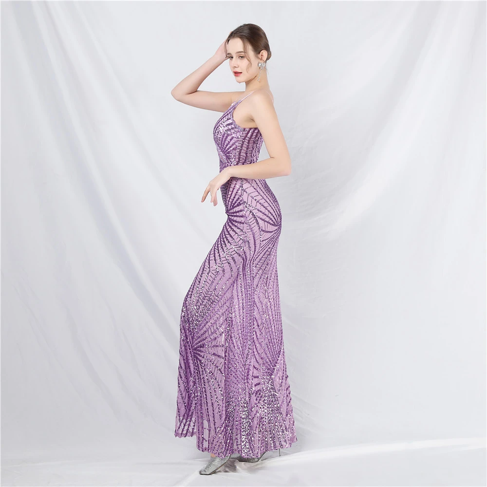 Heavy Beaded Sequined Mesh See-Through Sling Long Evening Dress