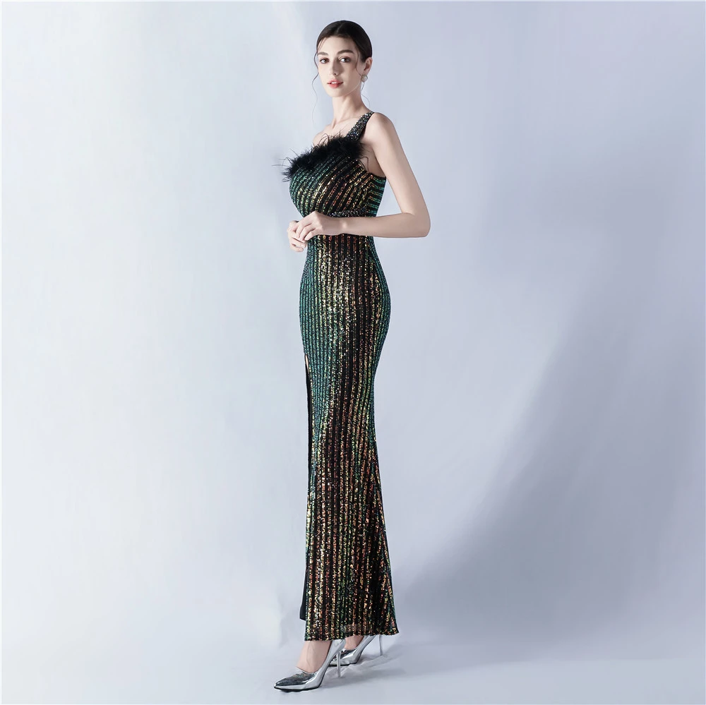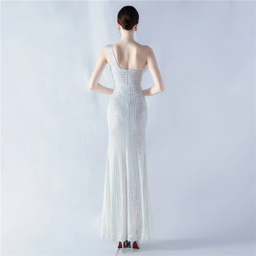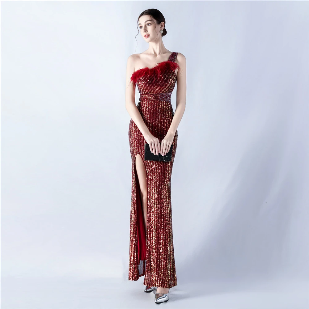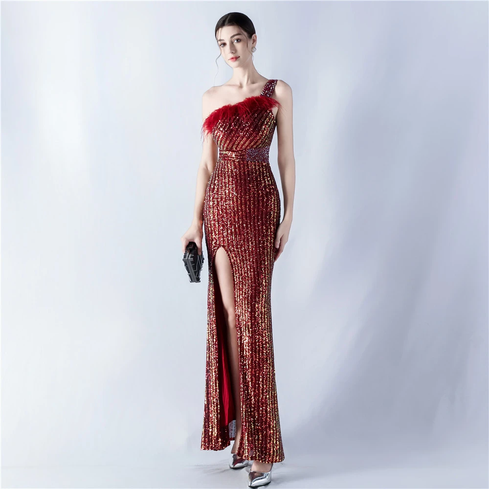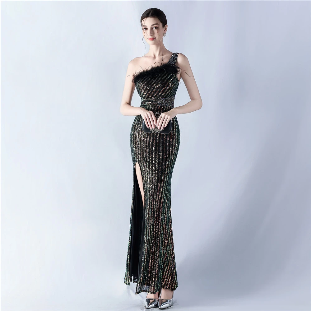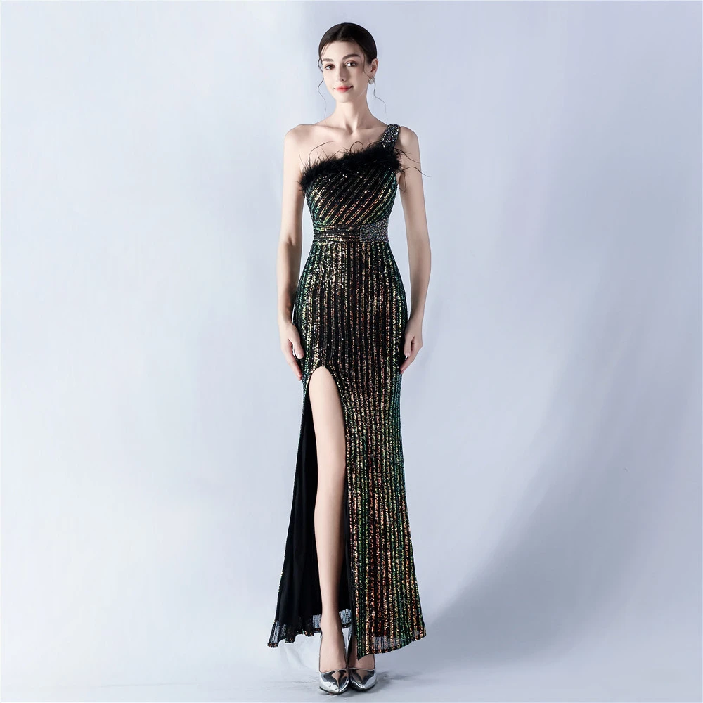 Heavy Beading And Wool One-Shoulder Oblique Collar High-Slit Sequined Evening Dress