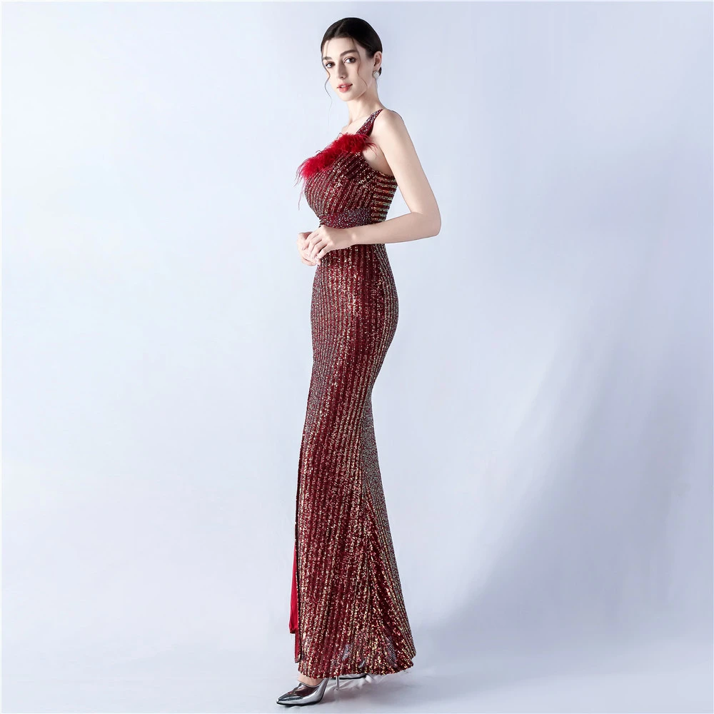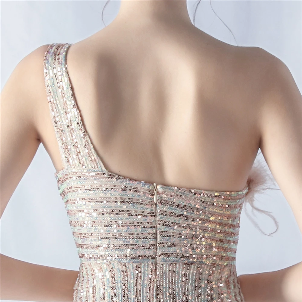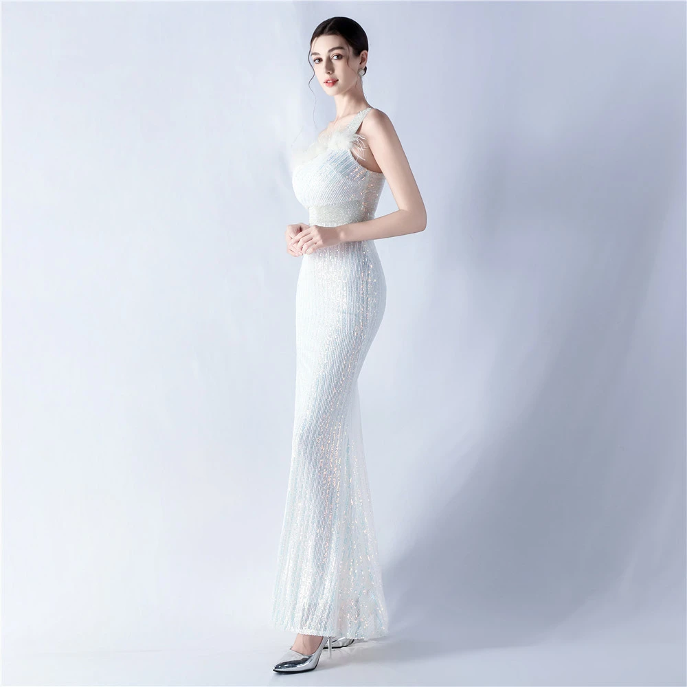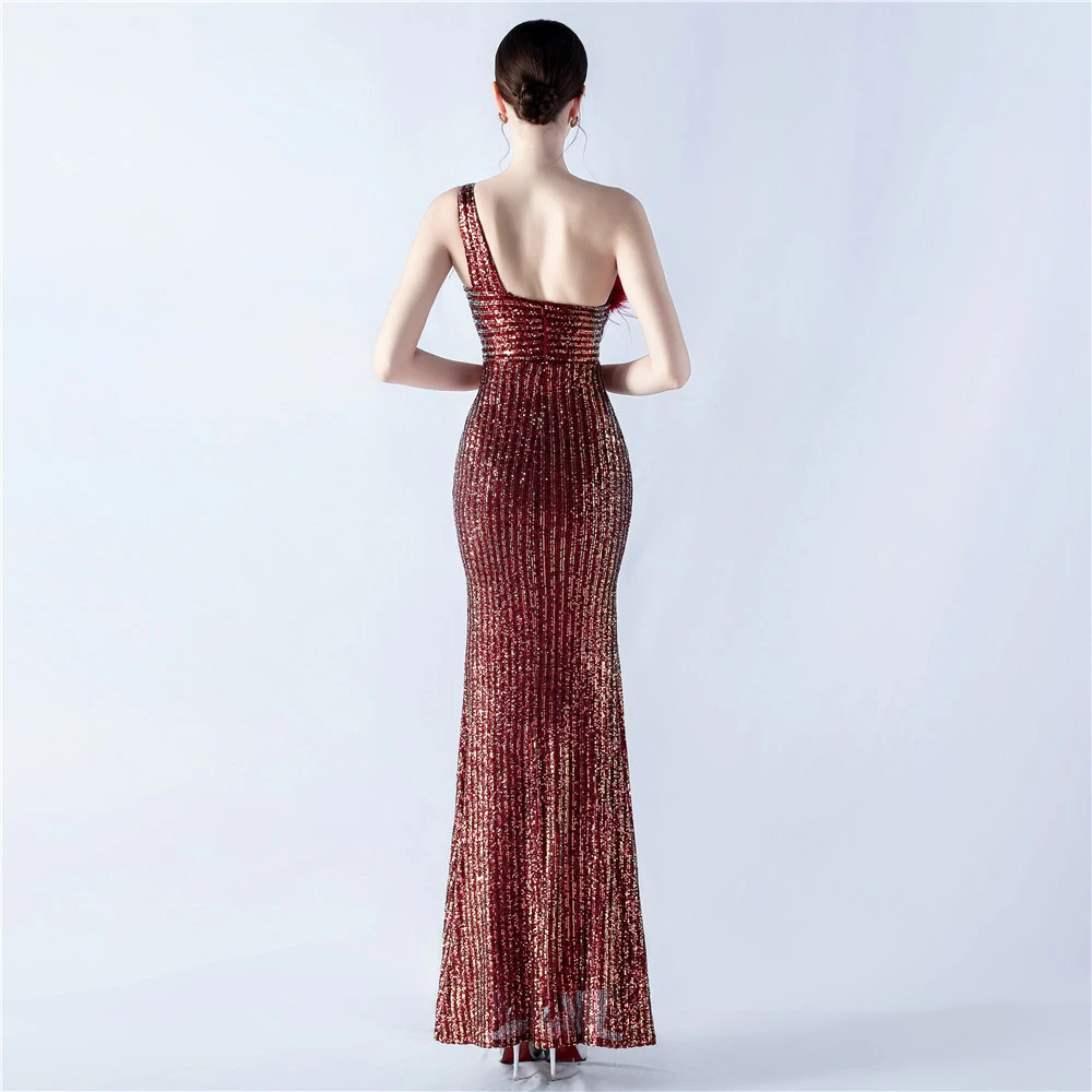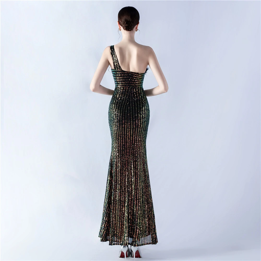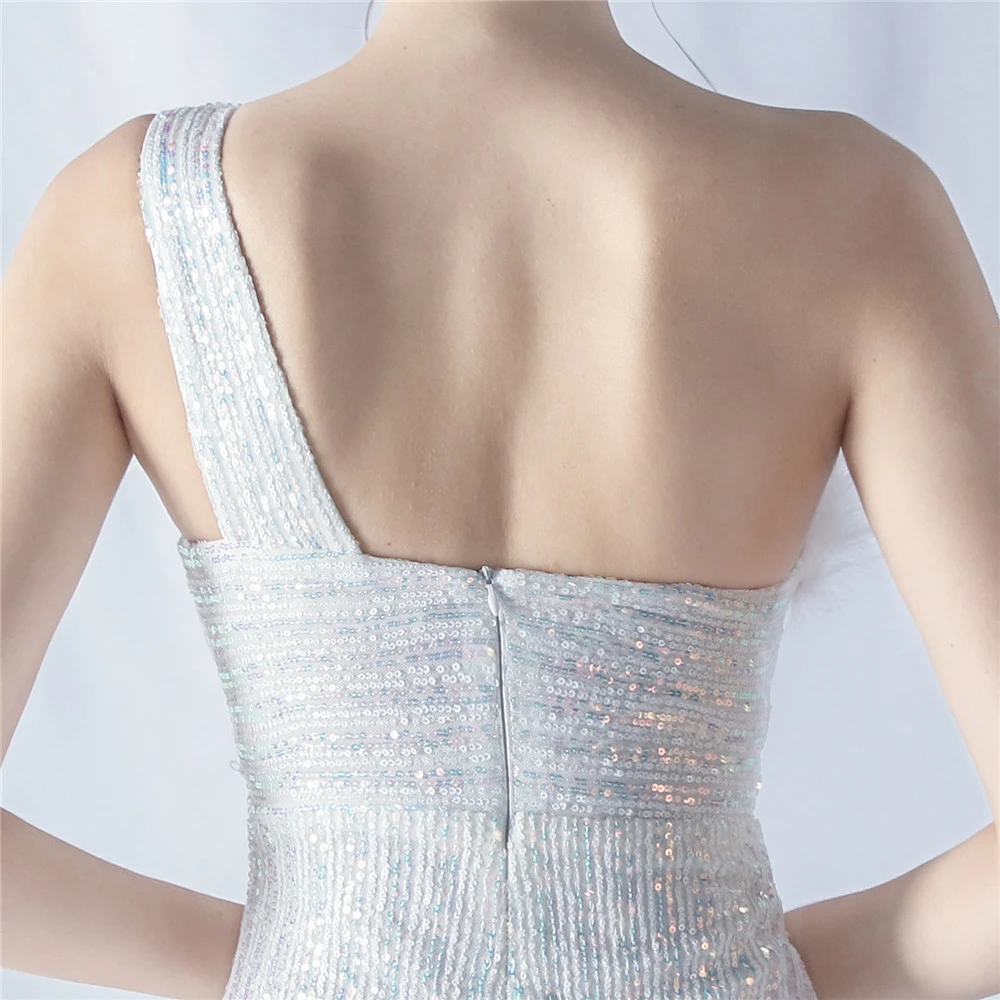 Heavy Beading And Wool One-Shoulder Oblique Collar High-Slit Sequined Evening Dress