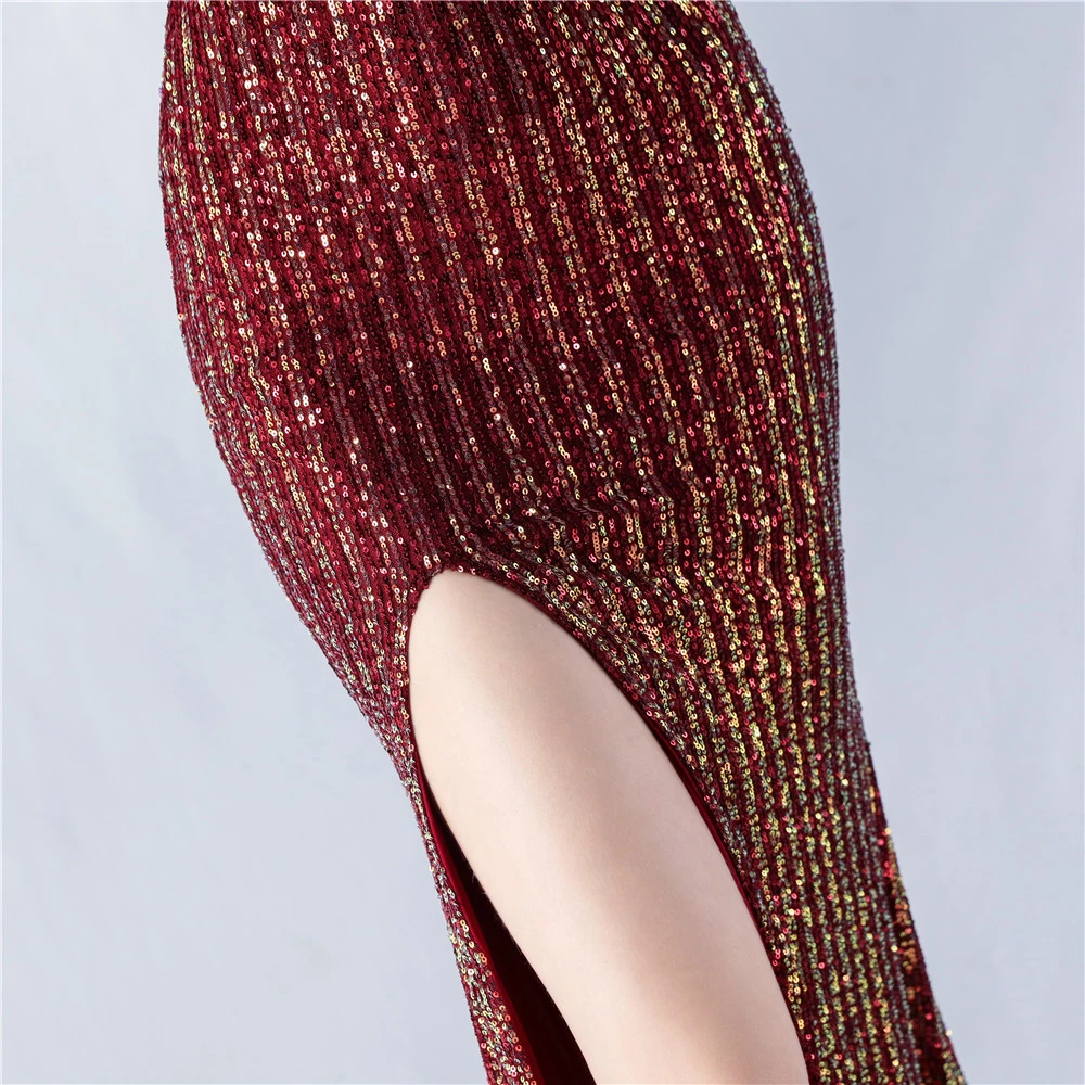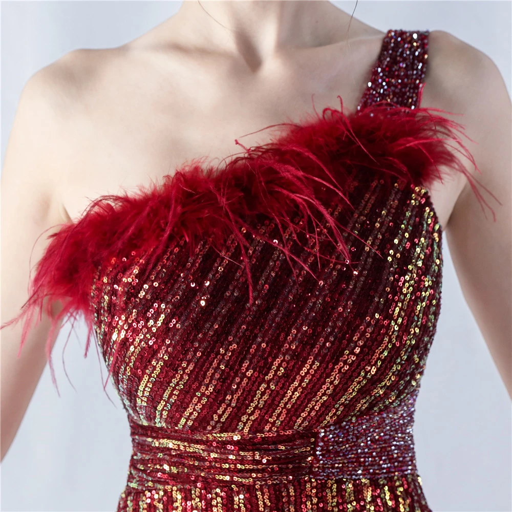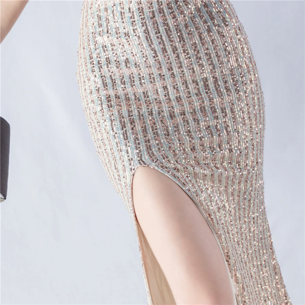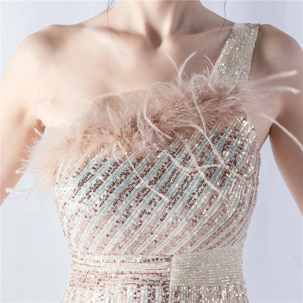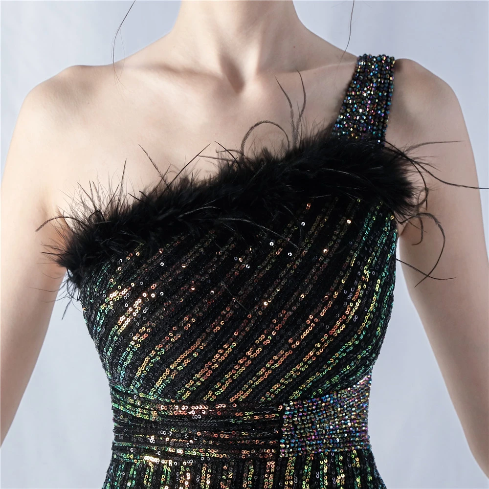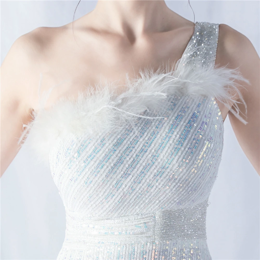 Heavy Beading And Wool One-Shoulder Oblique Collar High-Slit Sequined Evening Dress