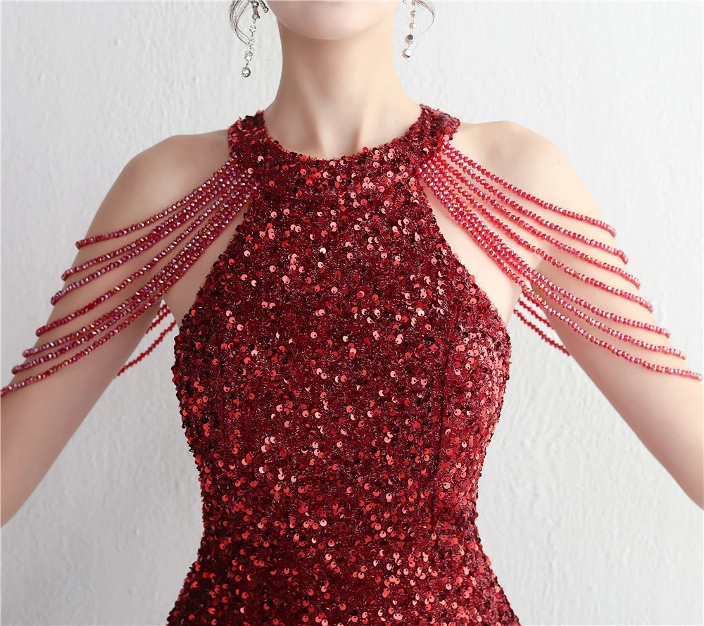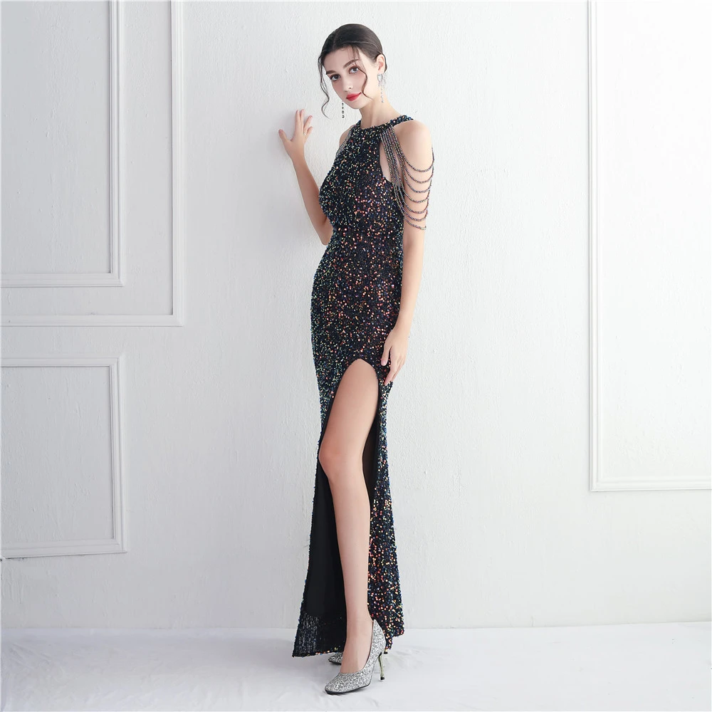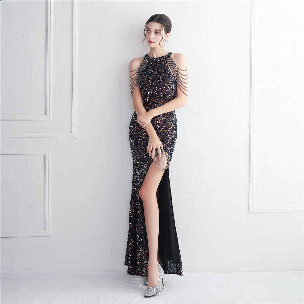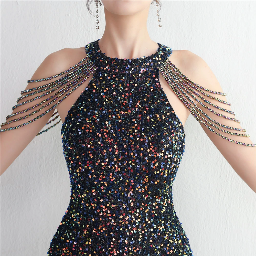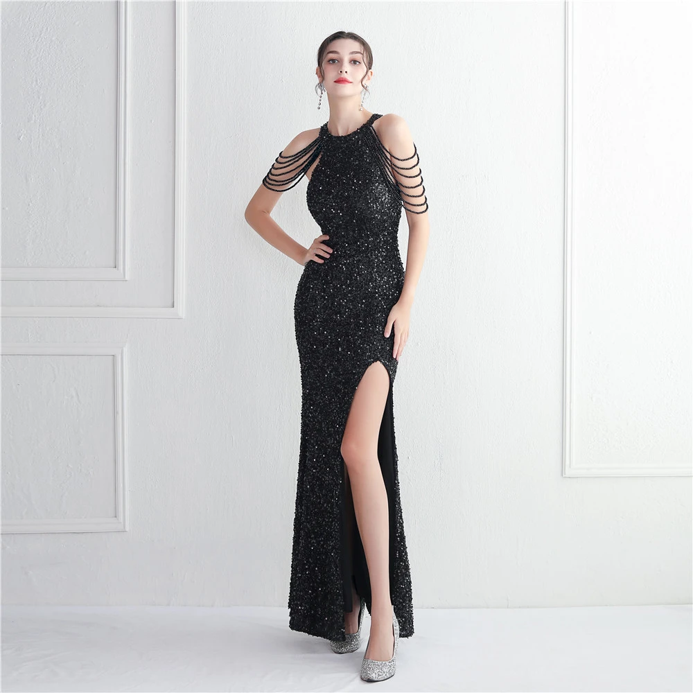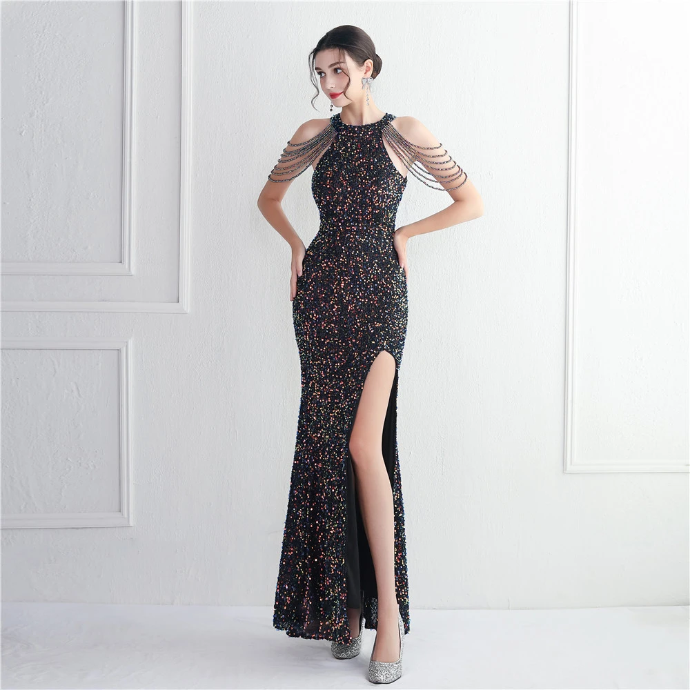 Heavy-Duty Glass Bead Craft Beaded Banquet Evening Dress Temperament Elegant Long Halter Neck Slit Sequins