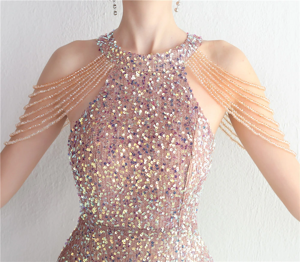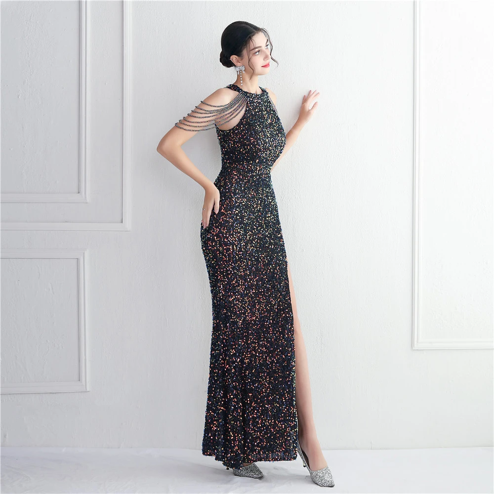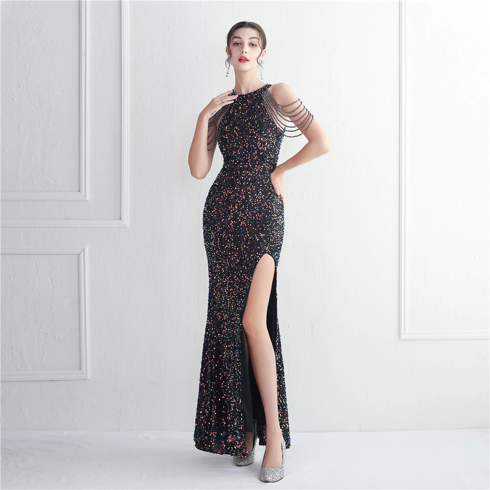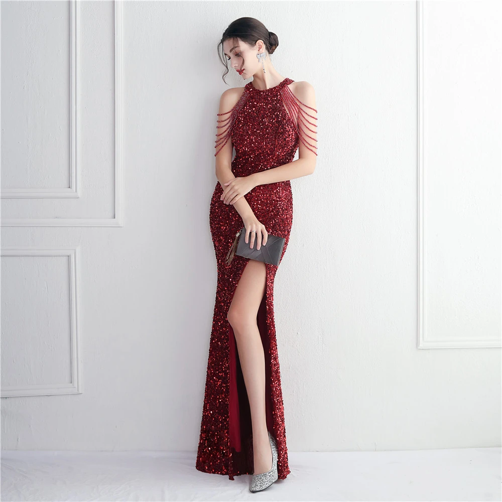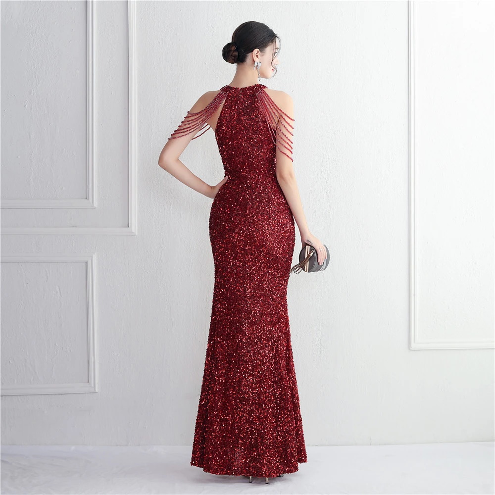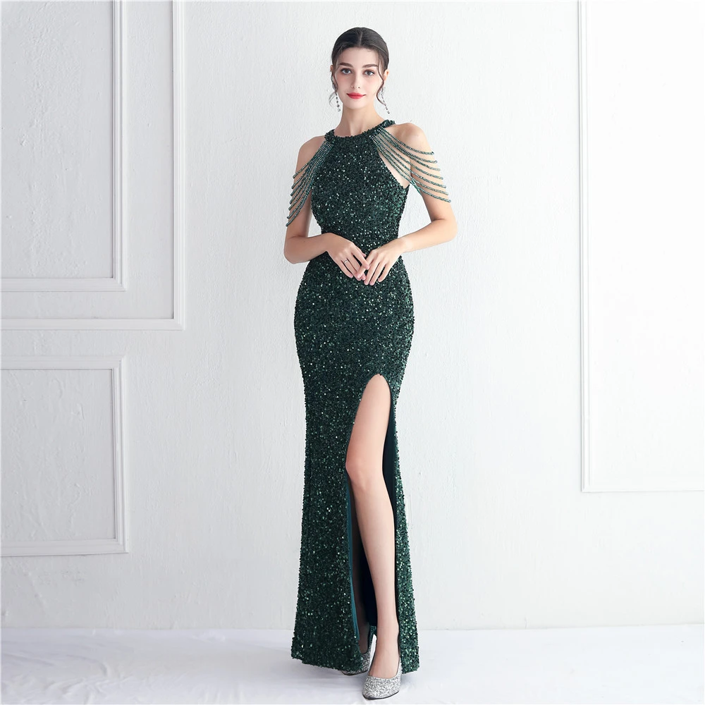 Heavy-Duty Glass Bead Craft Beaded Banquet Evening Dress Temperament Elegant Long Halter Neck Slit Sequins