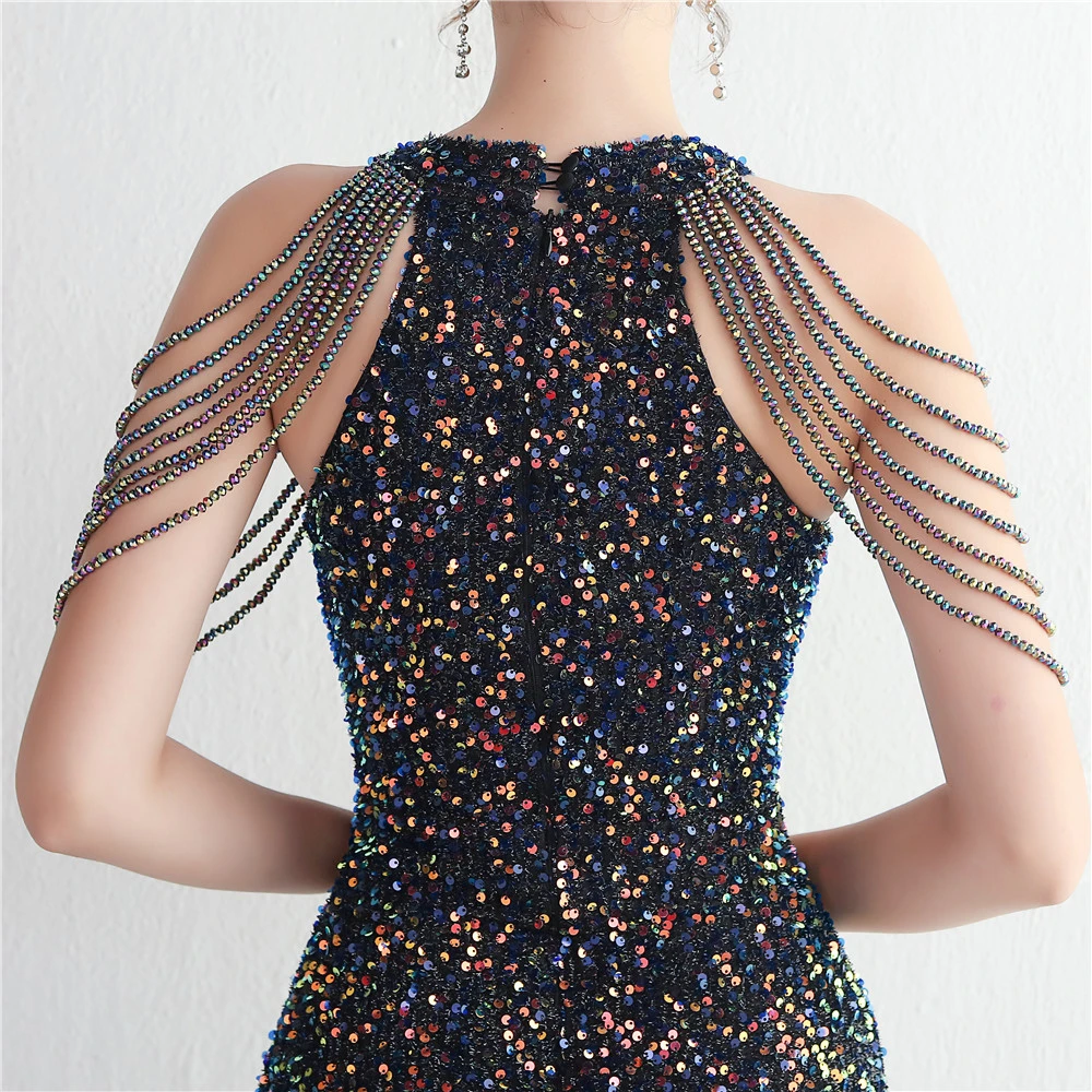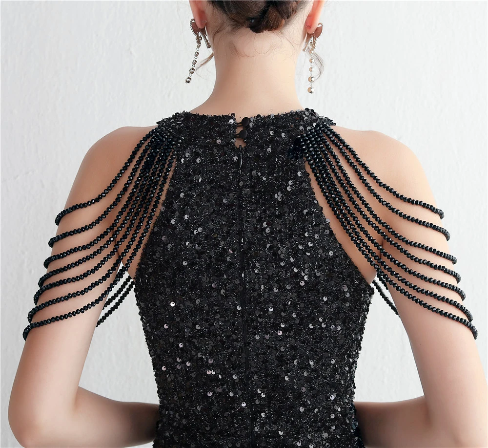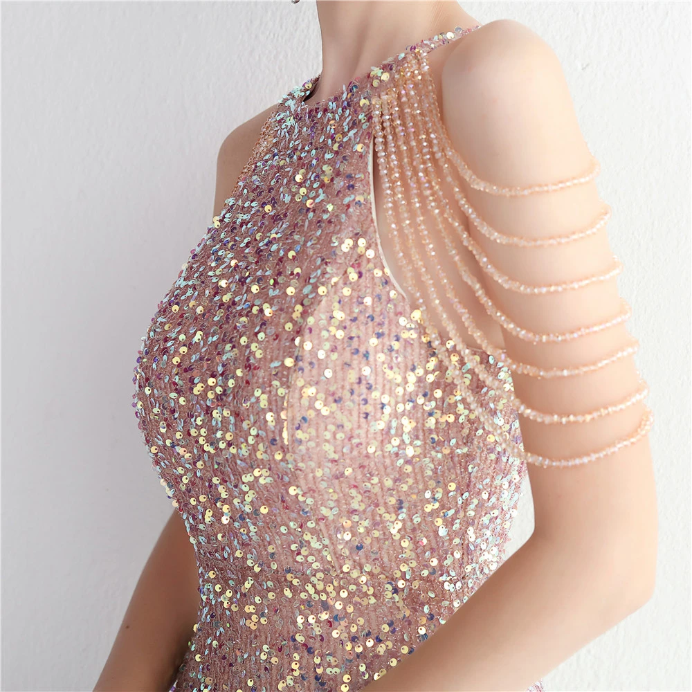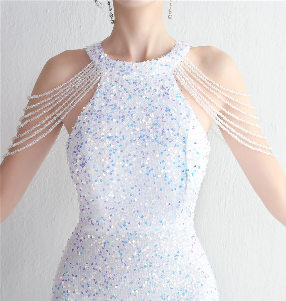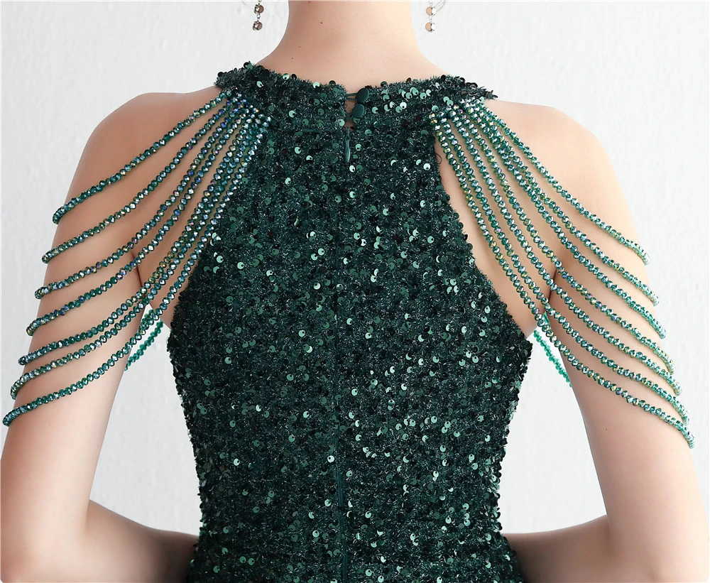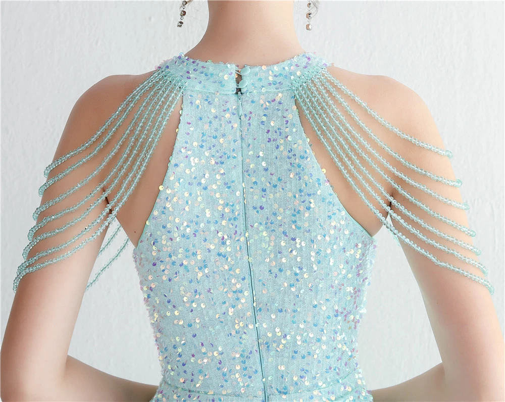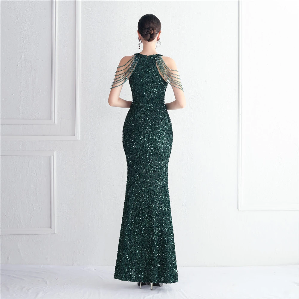 Heavy-Duty Glass Bead Craft Beaded Banquet Evening Dress Temperament Elegant Long Halter Neck Slit Sequins