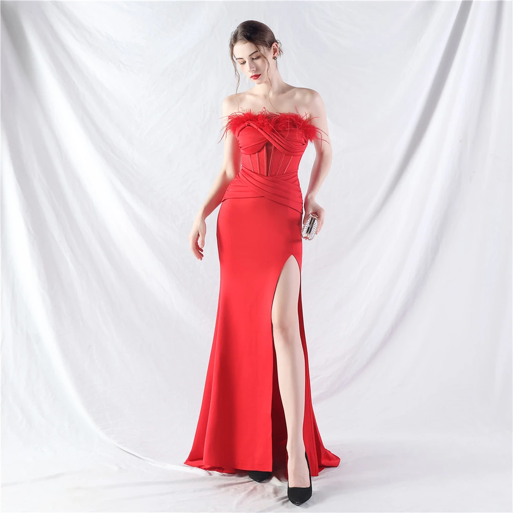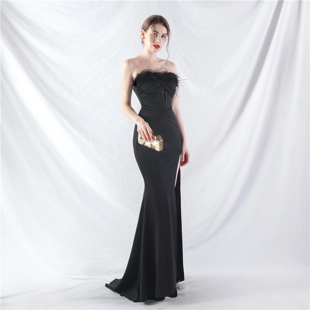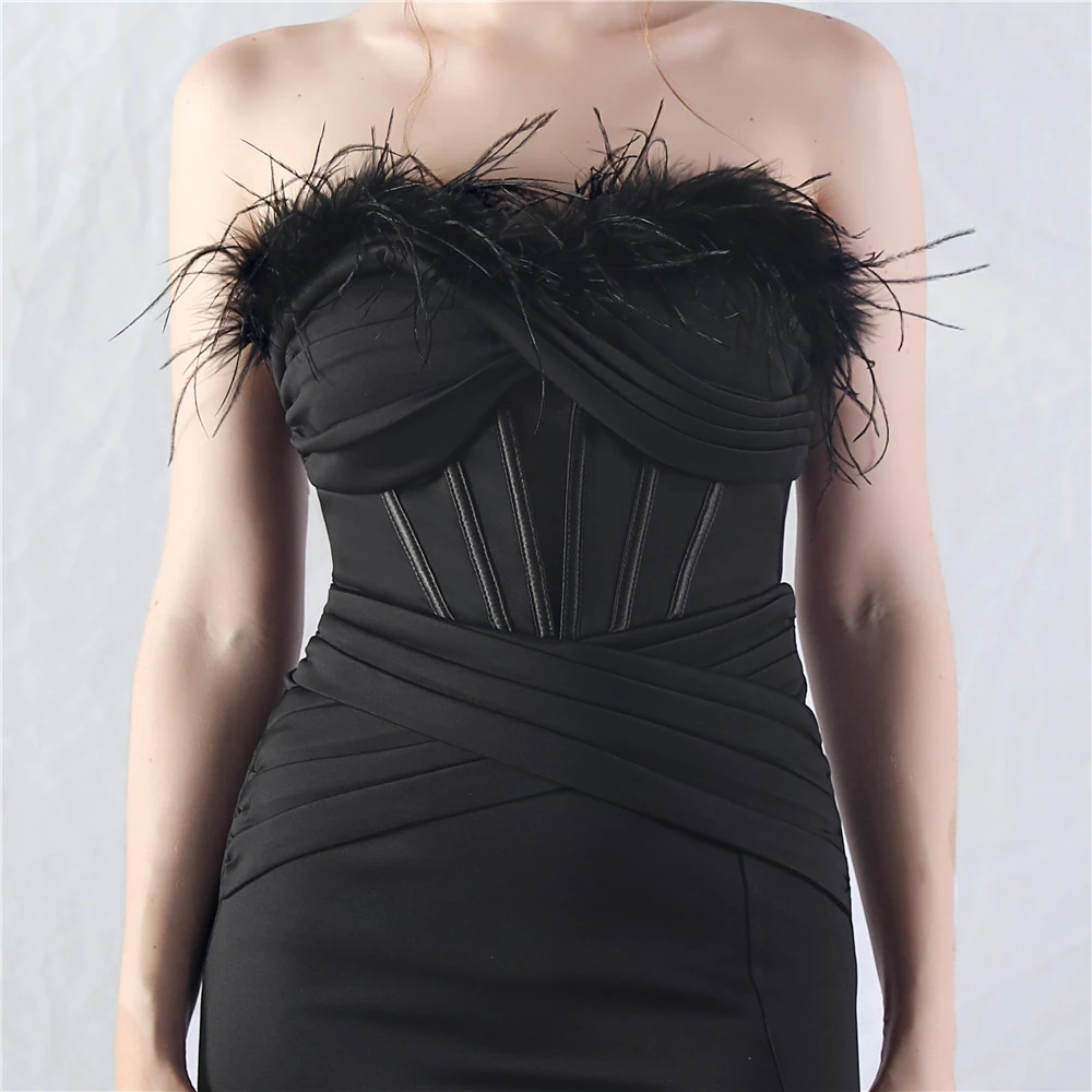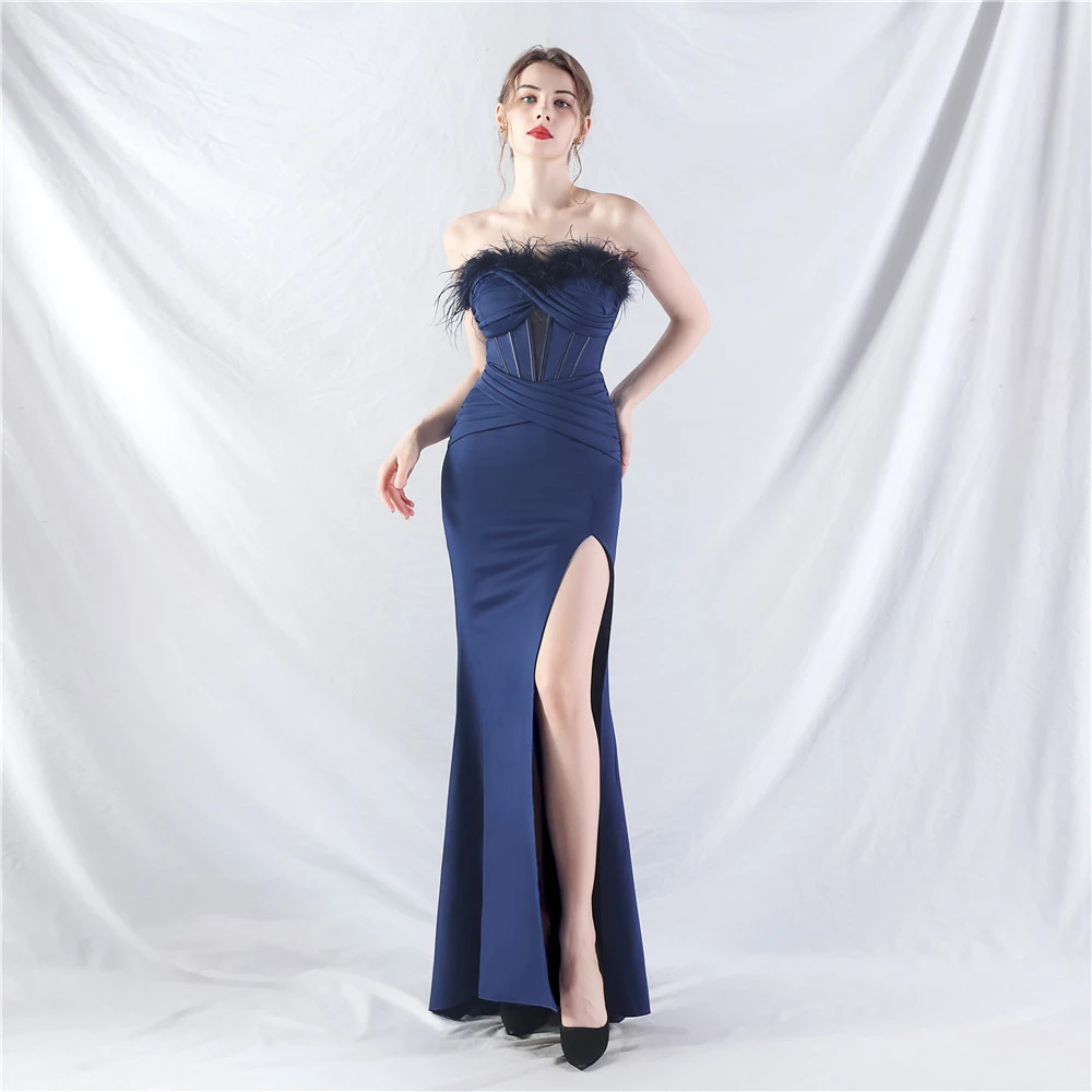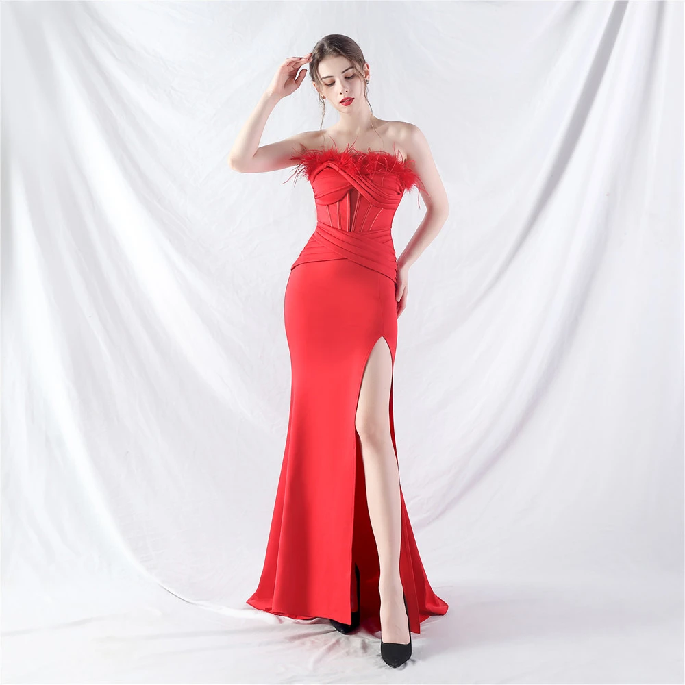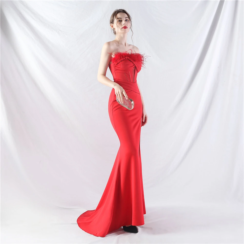 Herringbone Vest Waist-Tightening Satin Wrinkled Craft-Made Ostrich Feather High-End Evening Dress