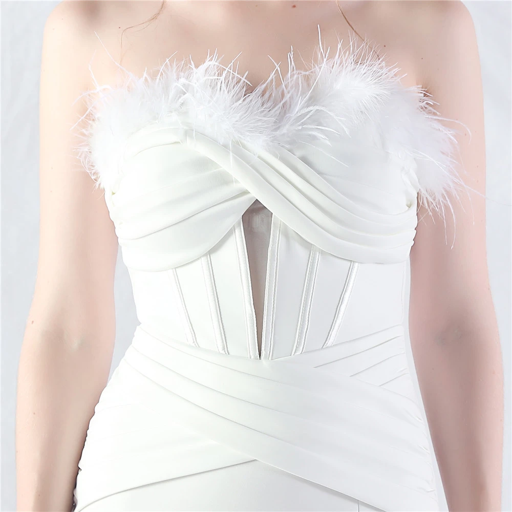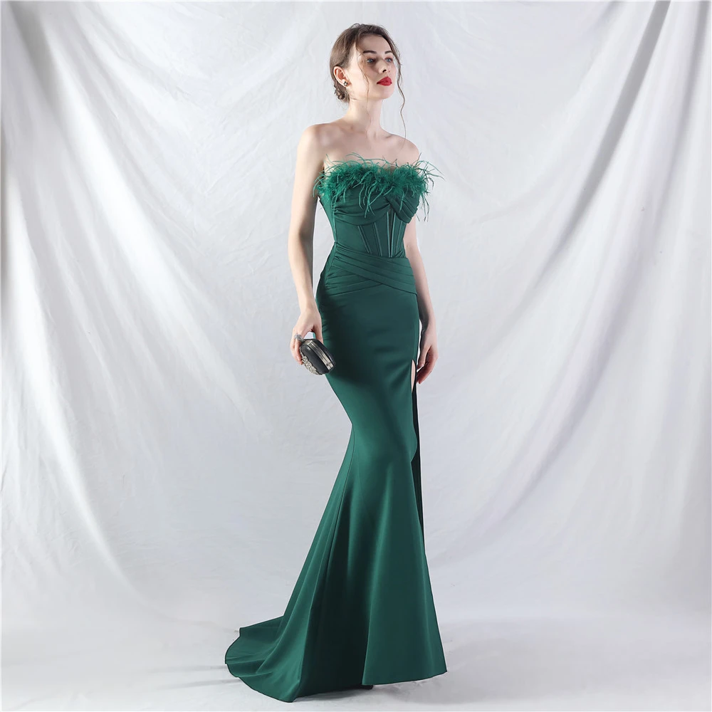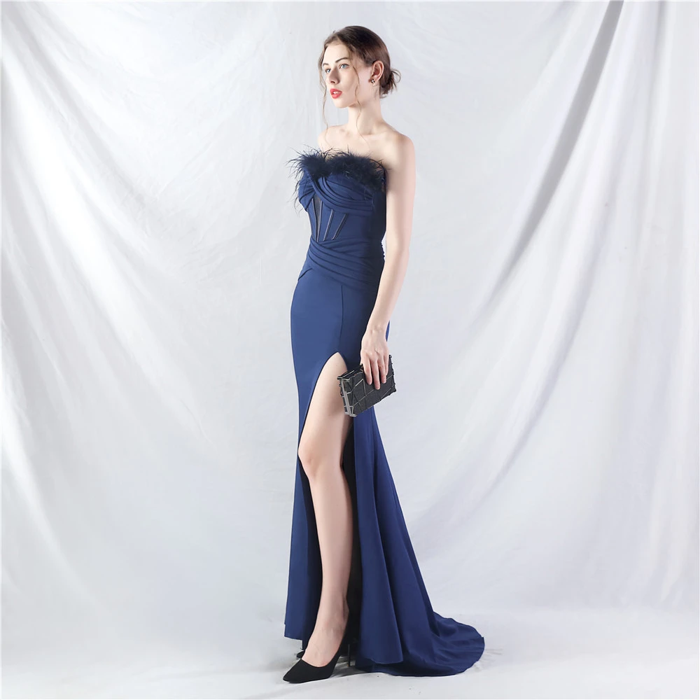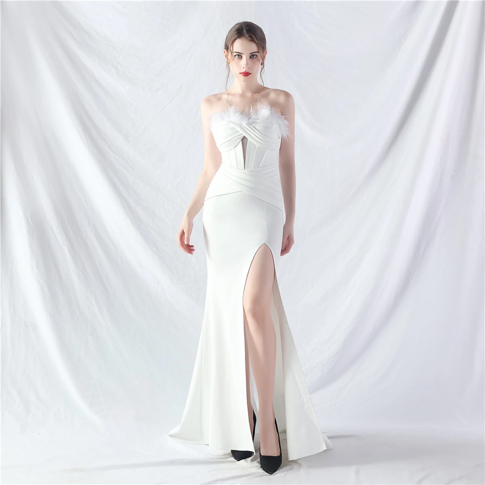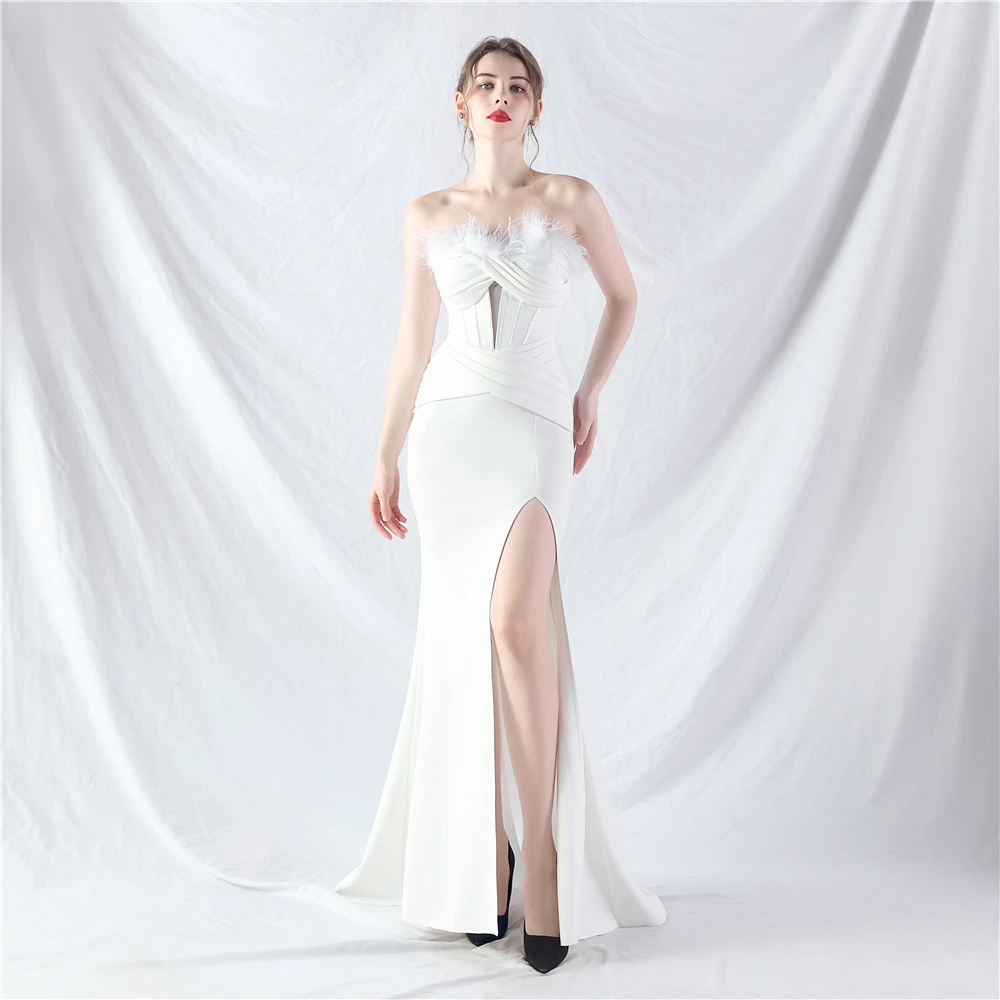 Herringbone Vest Waist-Tightening Satin Wrinkled Craft-Made Ostrich Feather High-End Evening Dress