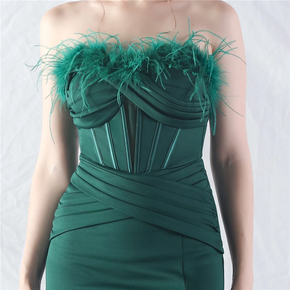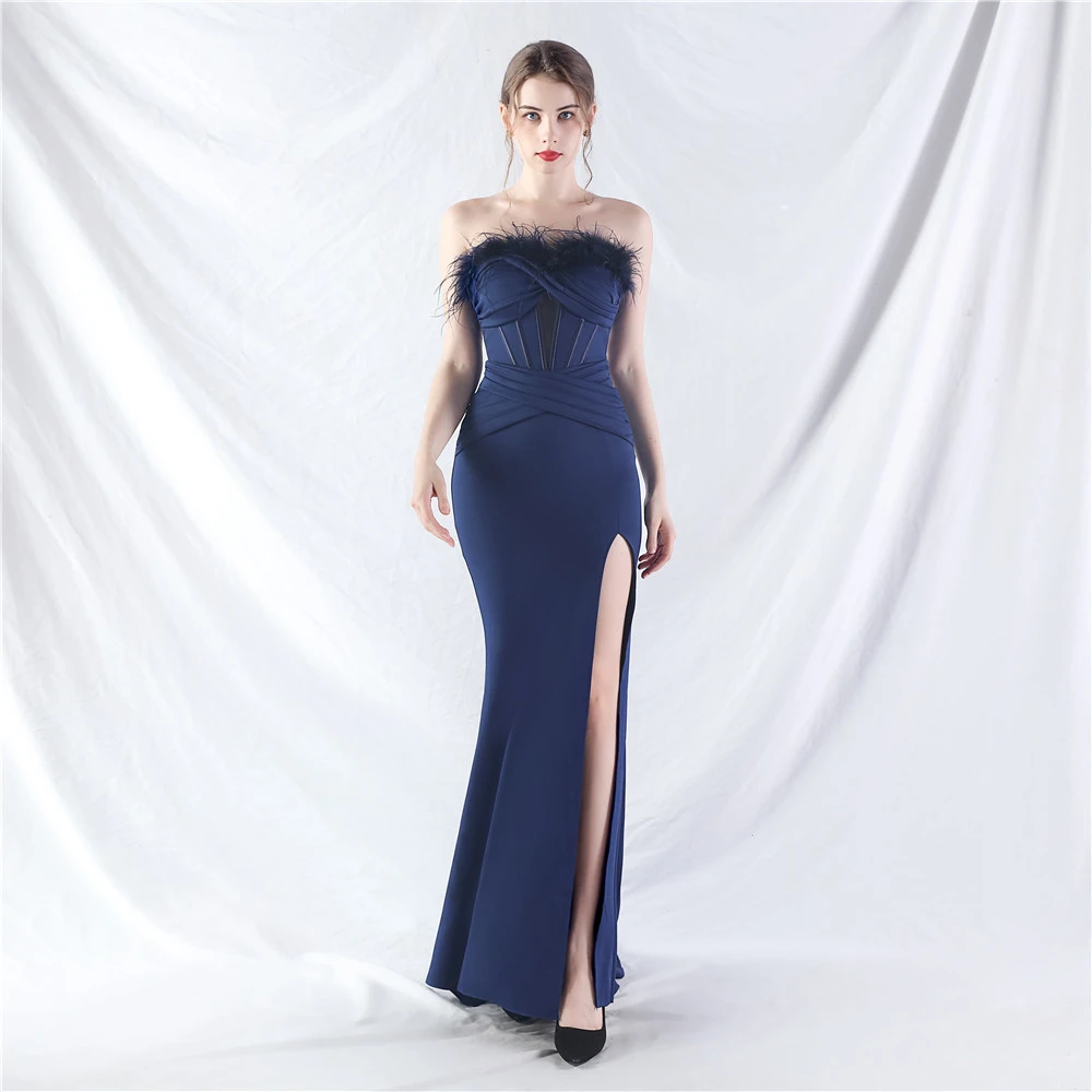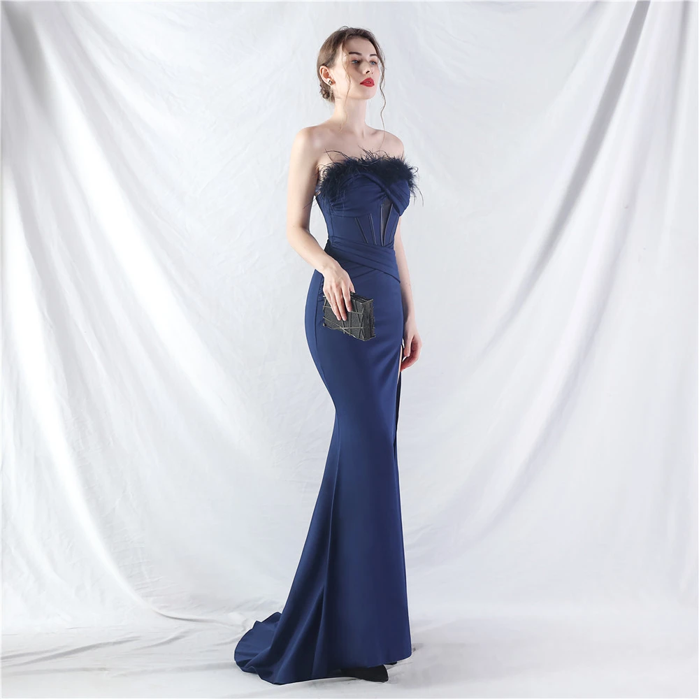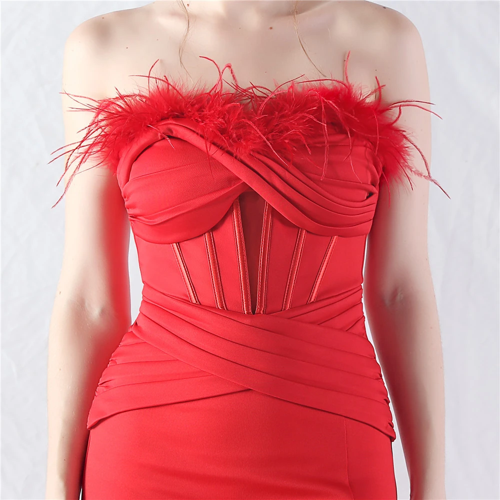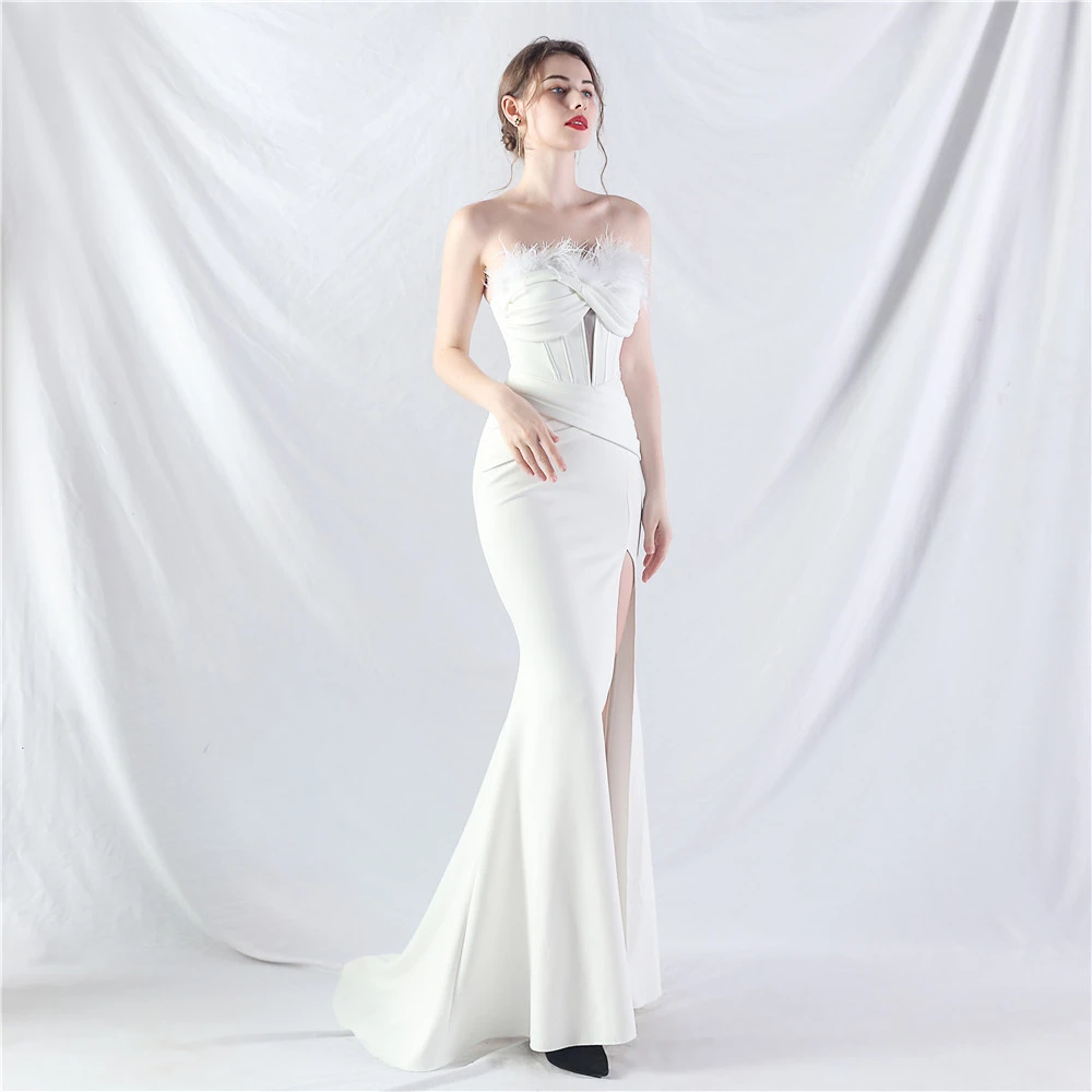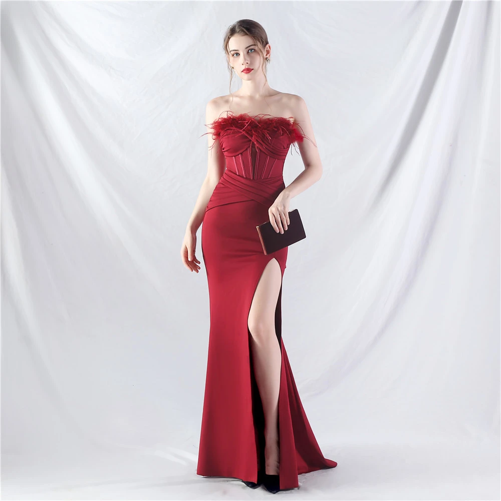 Herringbone Vest Waist-Tightening Satin Wrinkled Craft-Made Ostrich Feather High-End Evening Dress