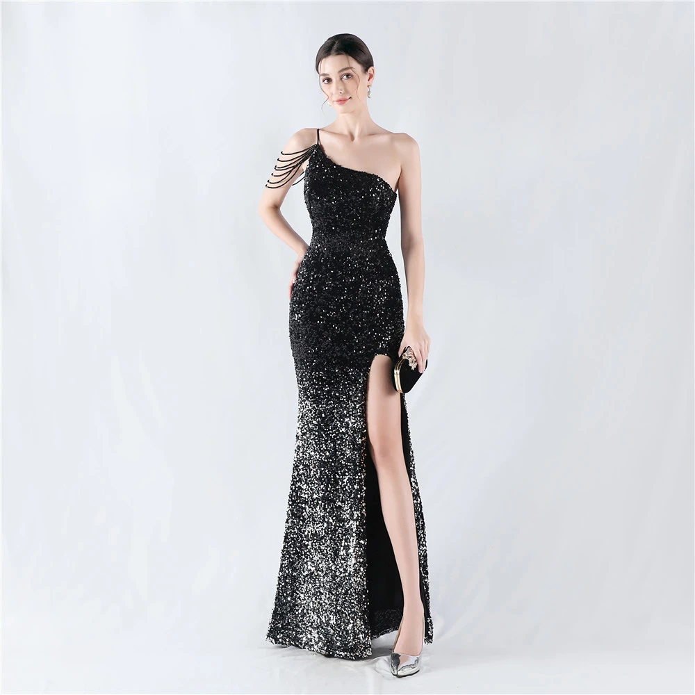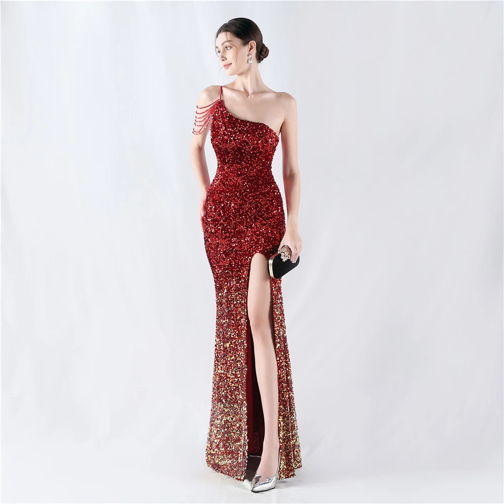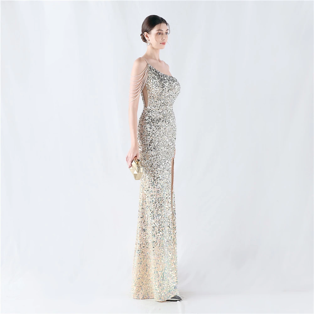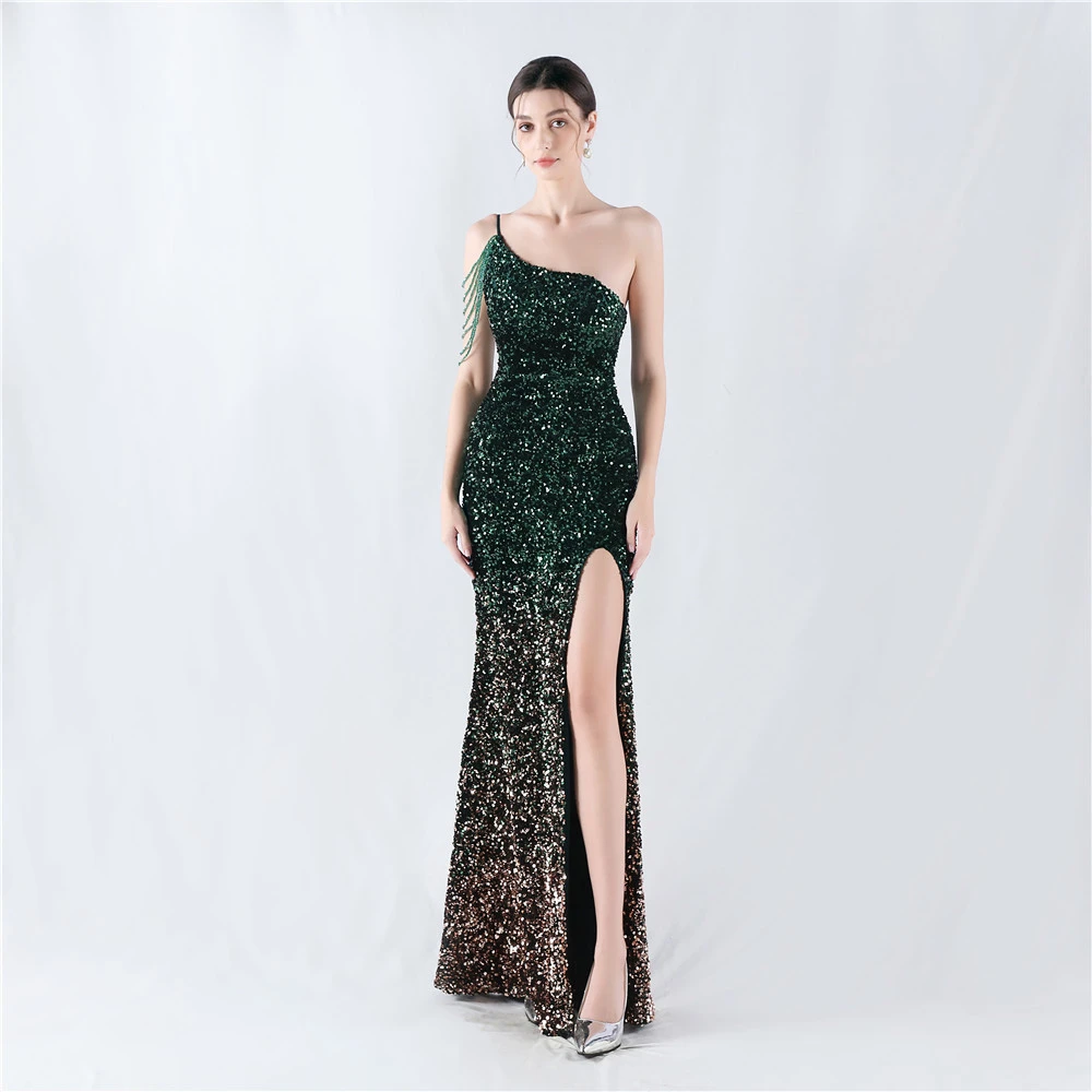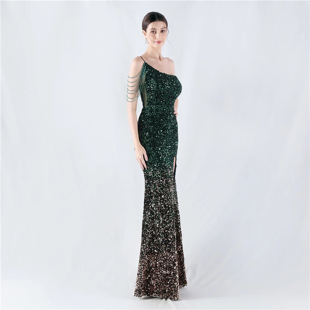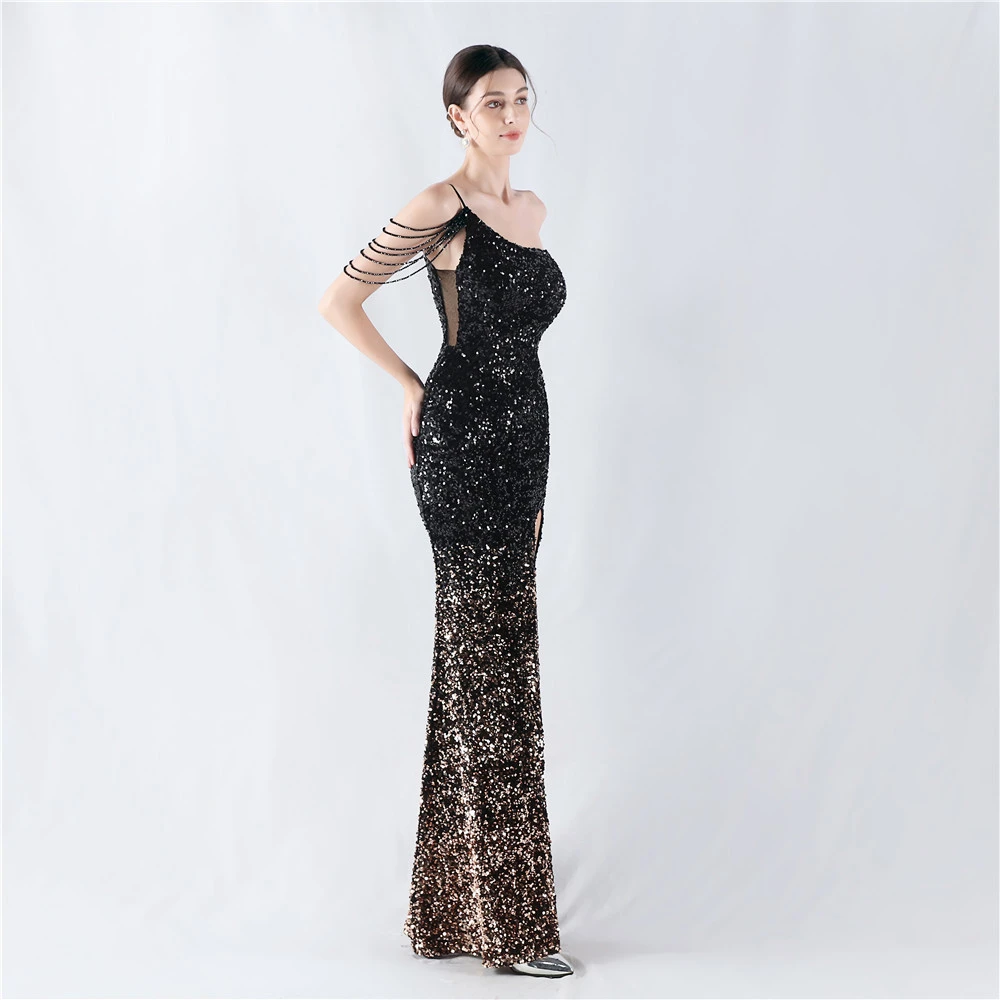 High-Density Gradient Velvet-Bottom Sequined One-Shoulder Beaded Suspender Evening Dress
