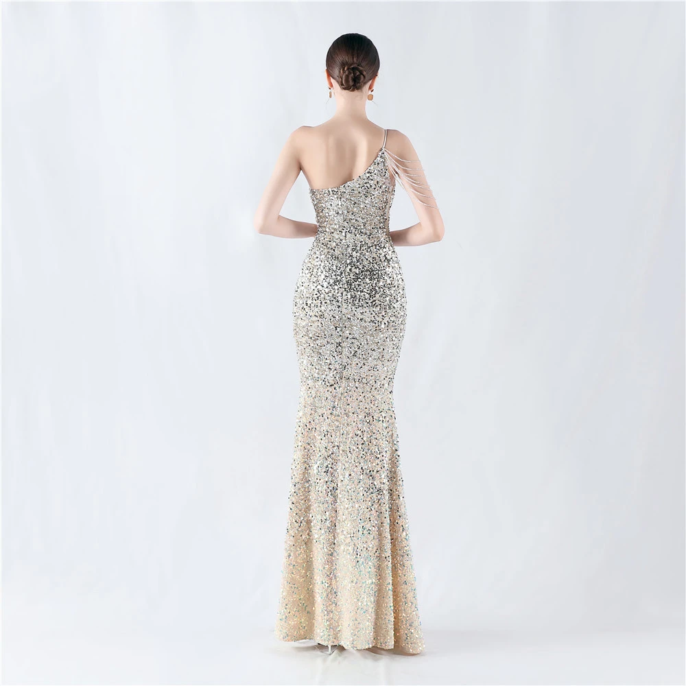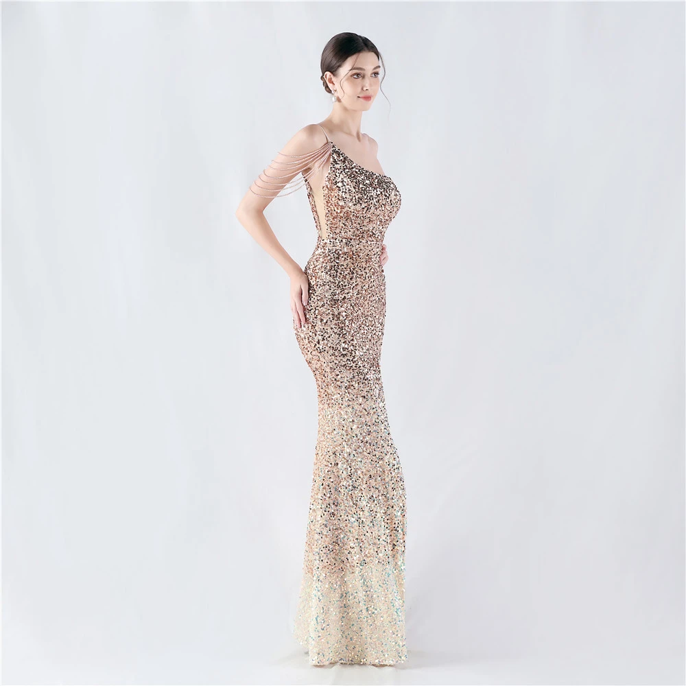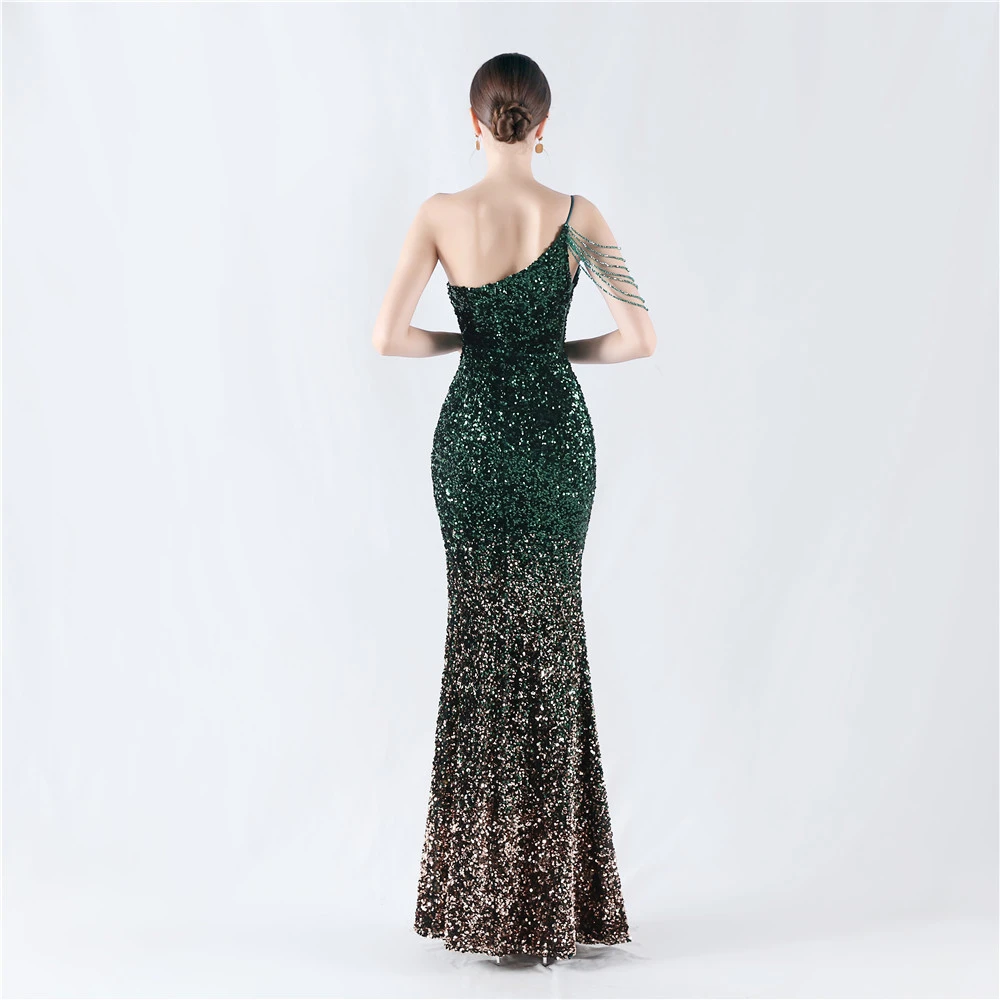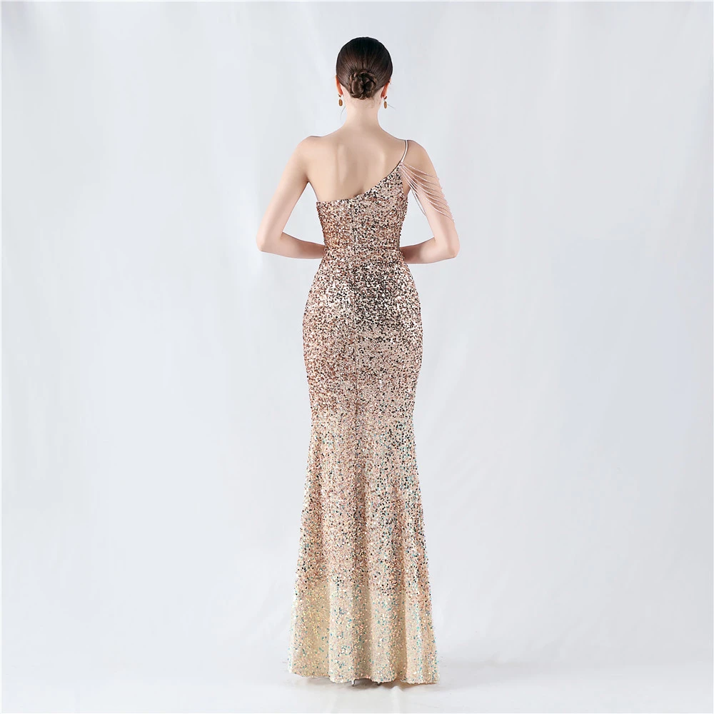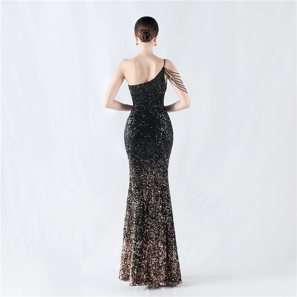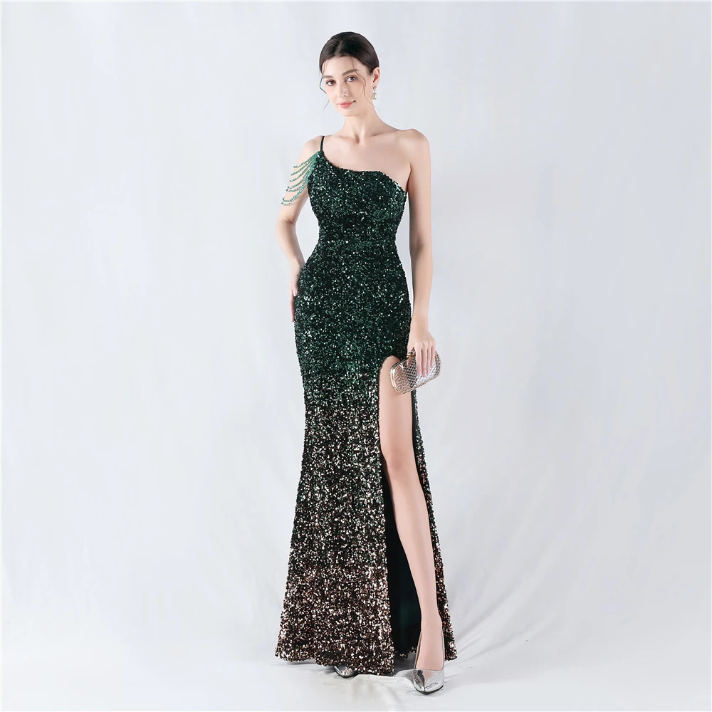 High-Density Gradient Velvet-Bottom Sequined One-Shoulder Beaded Suspender Evening Dress