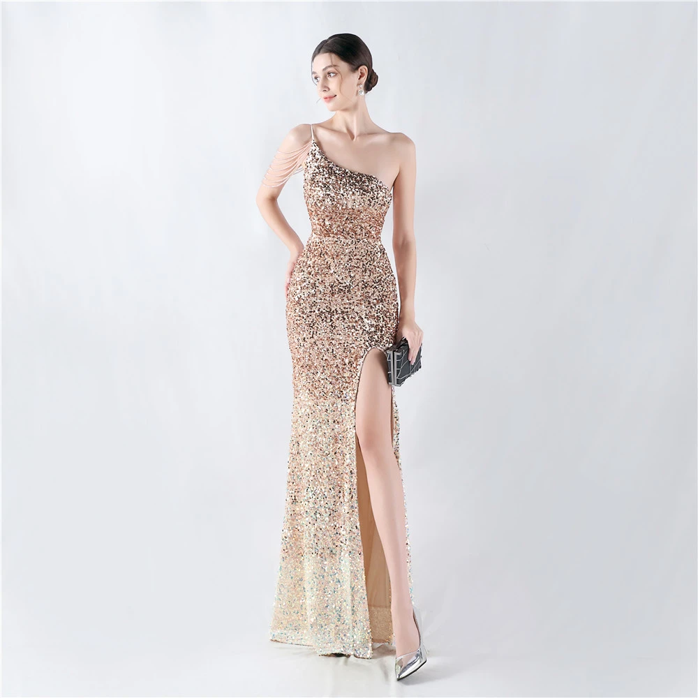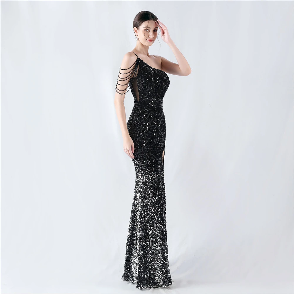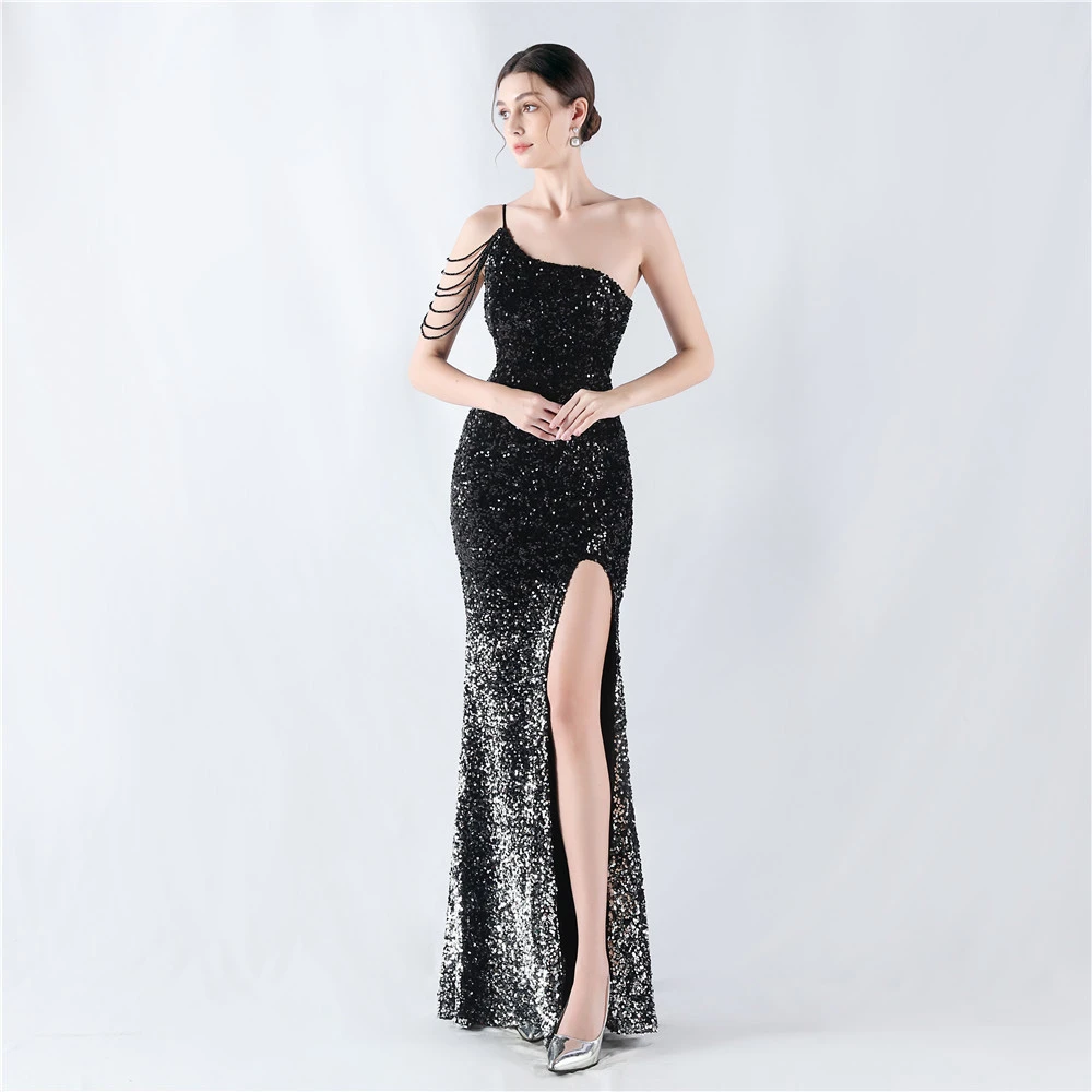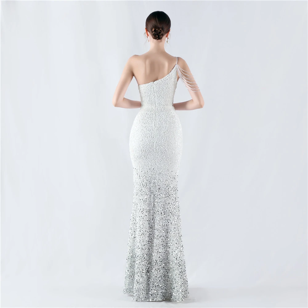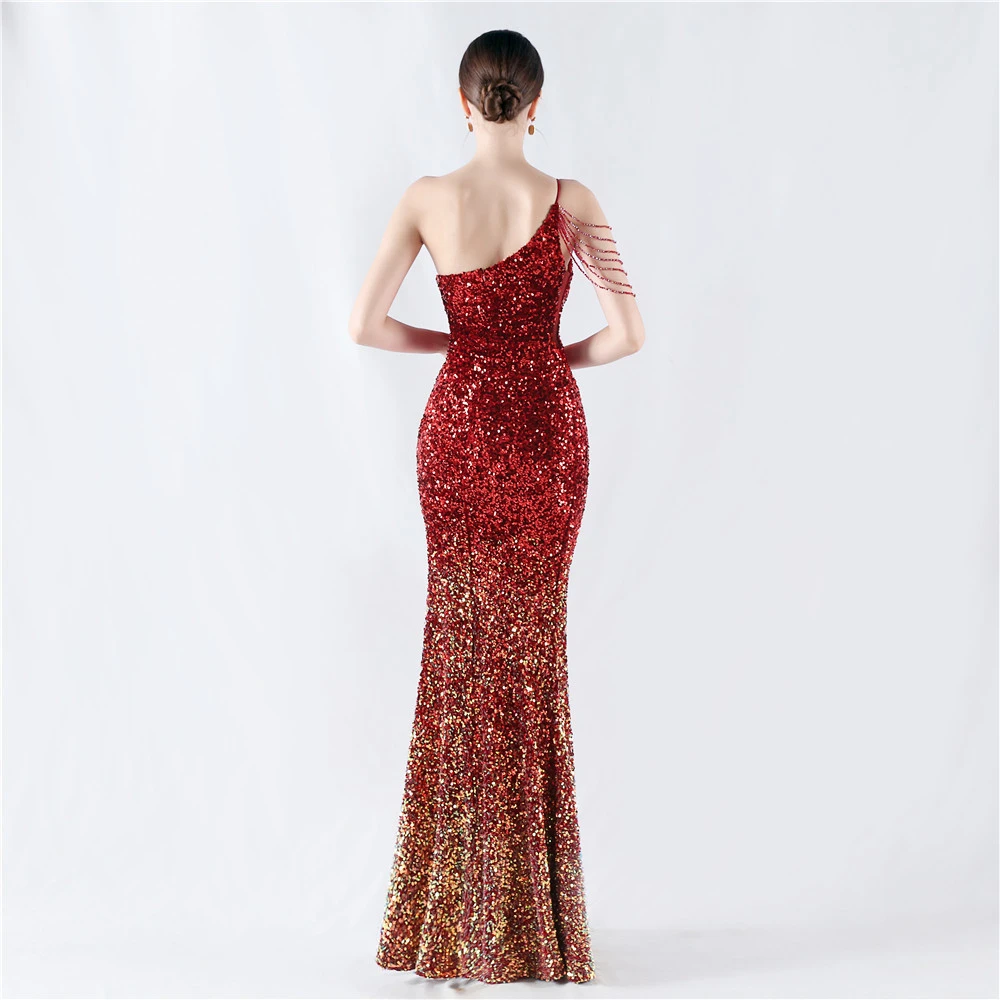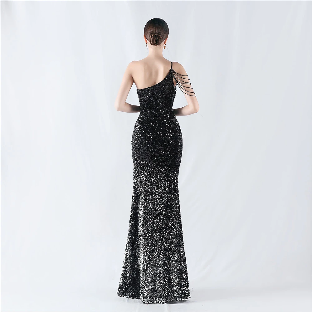 High-Density Gradient Velvet-Bottom Sequined One-Shoulder Beaded Suspender Evening Dress