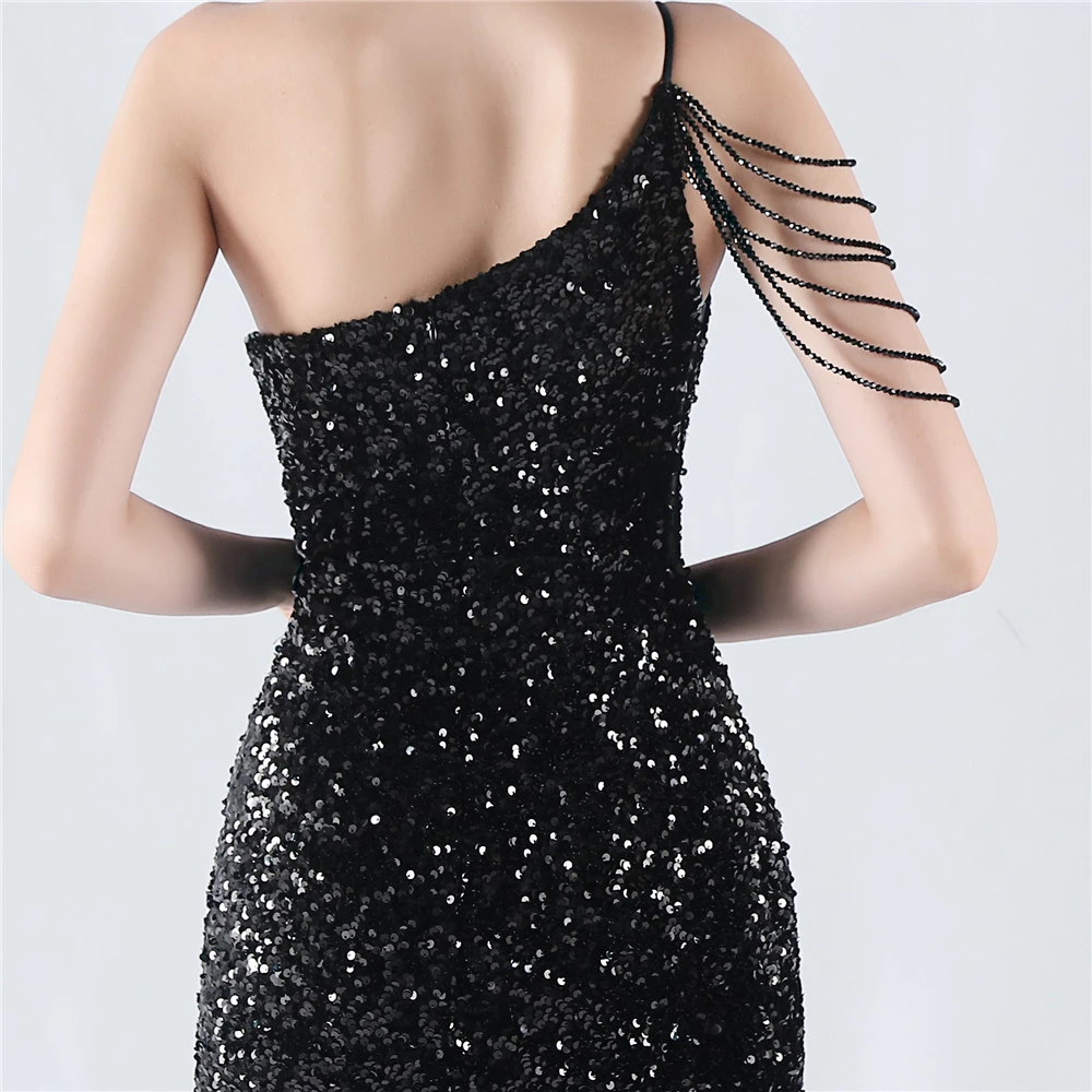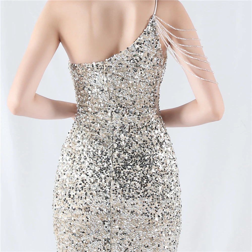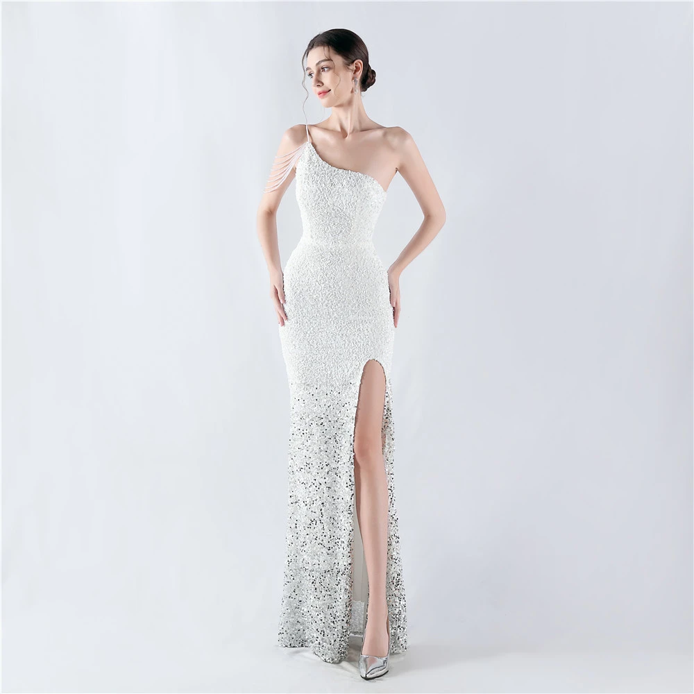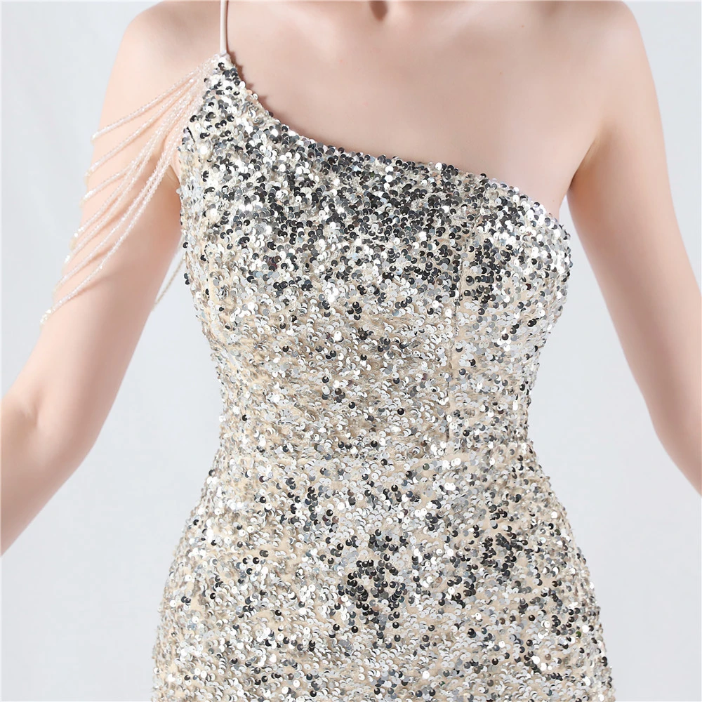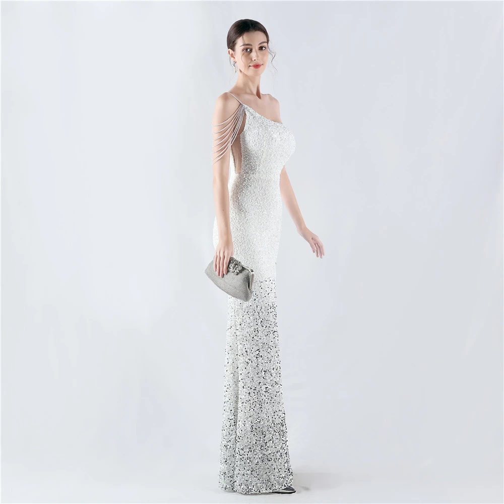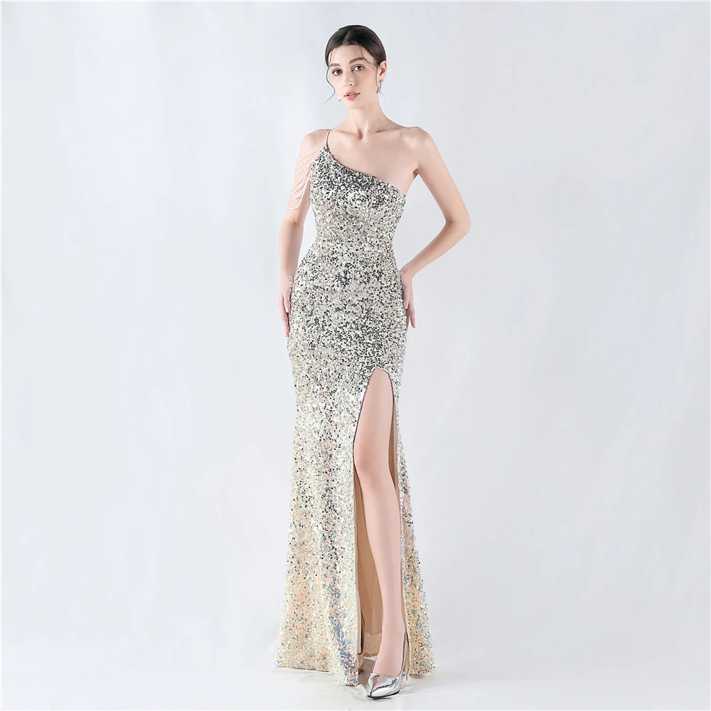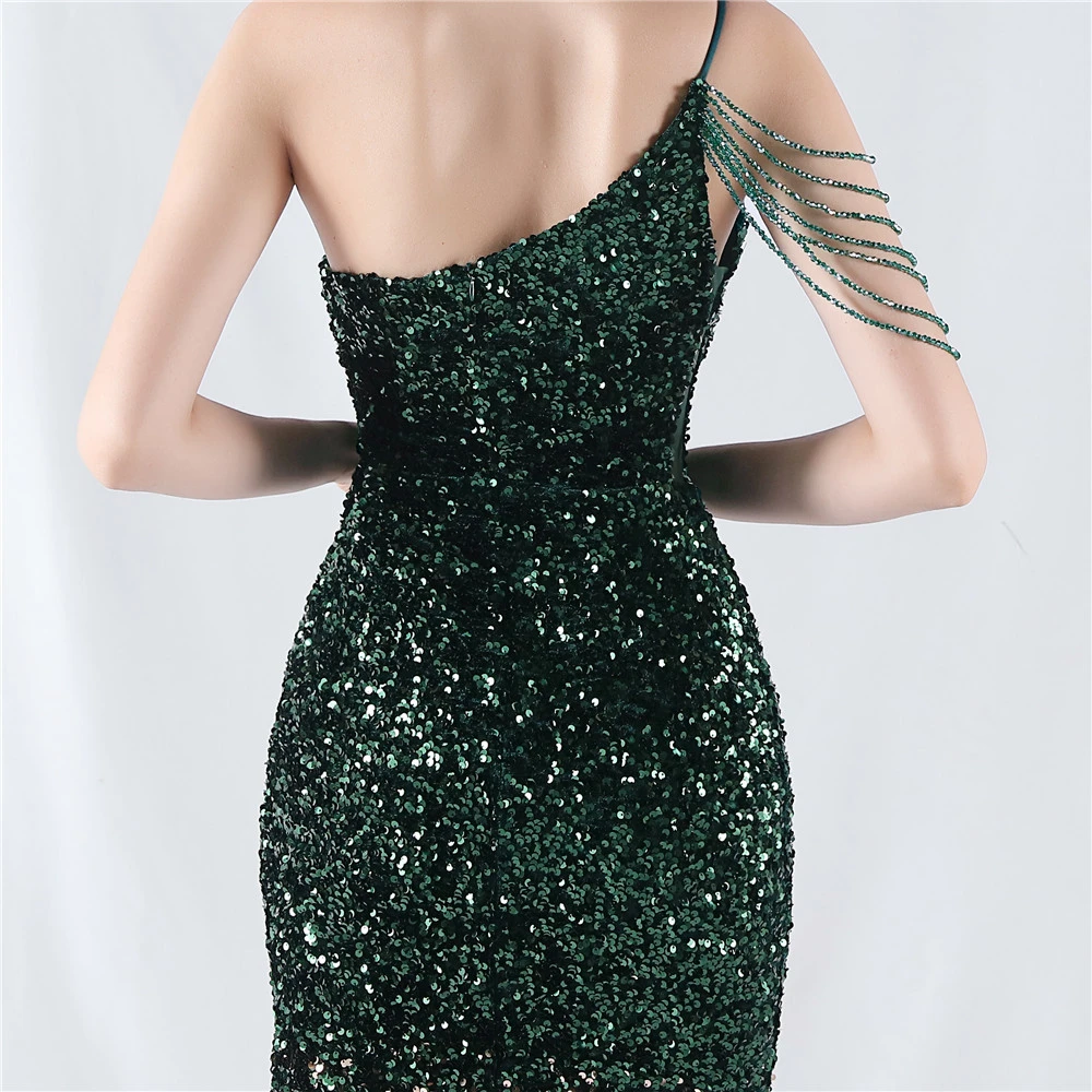 High-Density Gradient Velvet-Bottom Sequined One-Shoulder Beaded Suspender Evening Dress