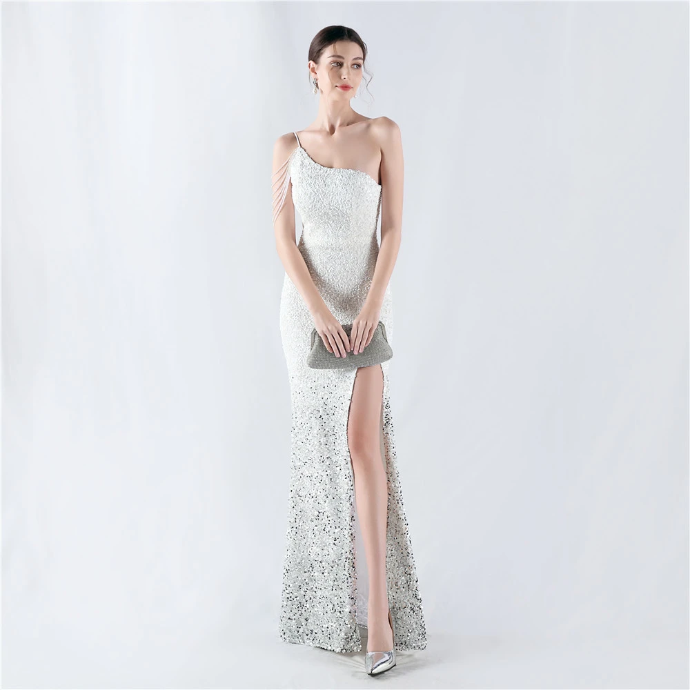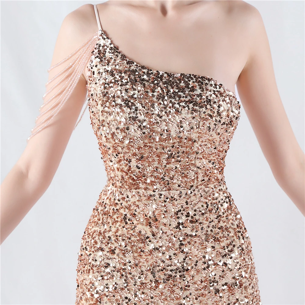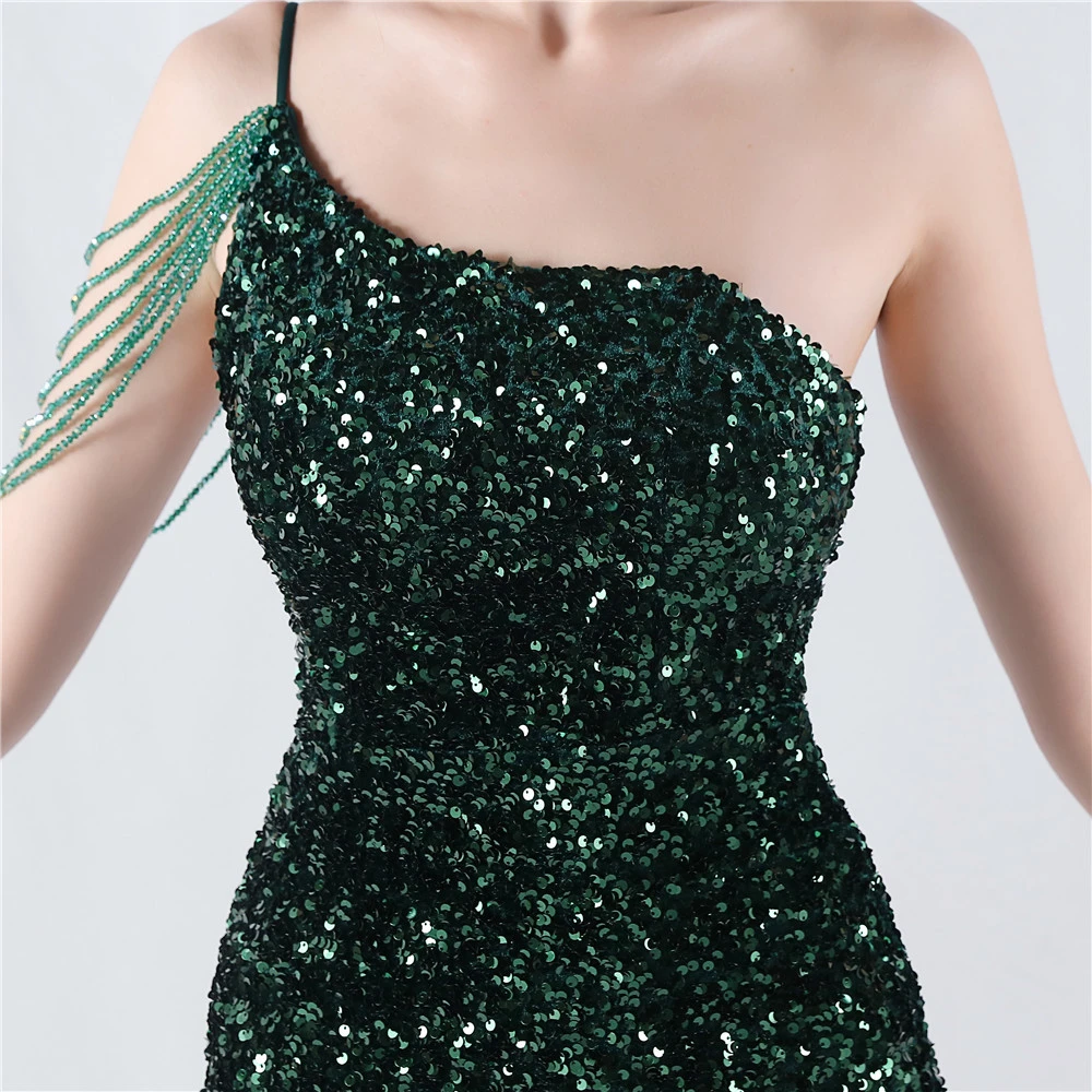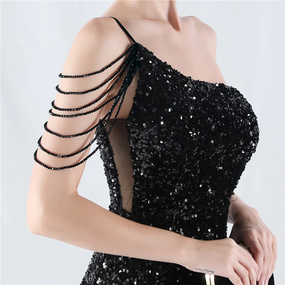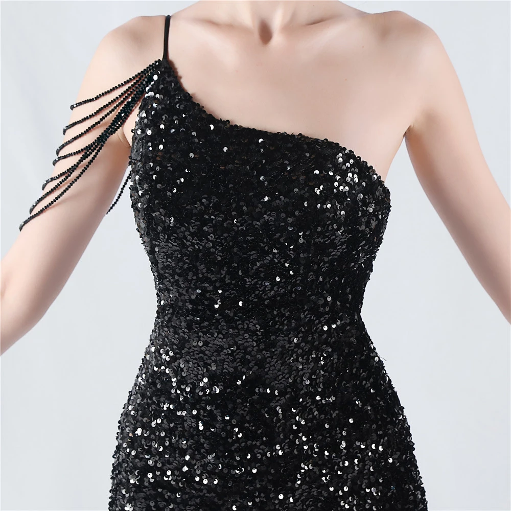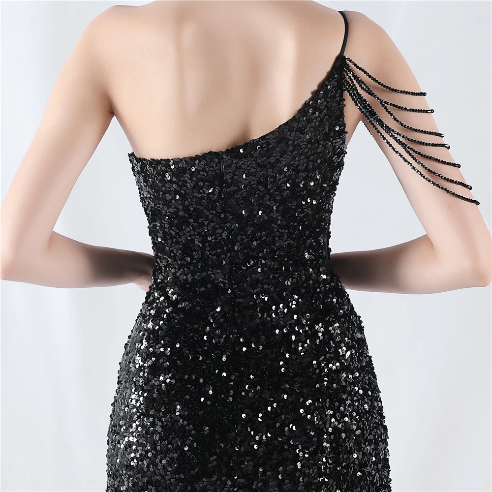 High-Density Gradient Velvet-Bottom Sequined One-Shoulder Beaded Suspender Evening Dress