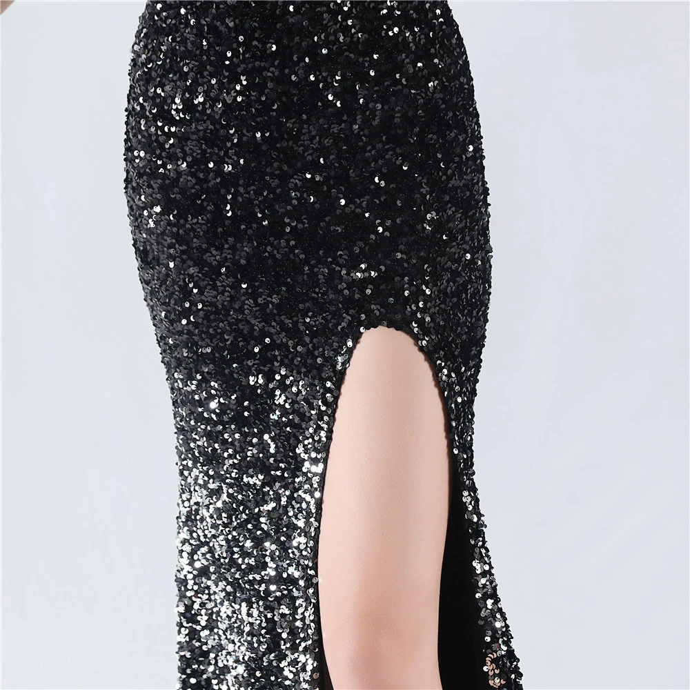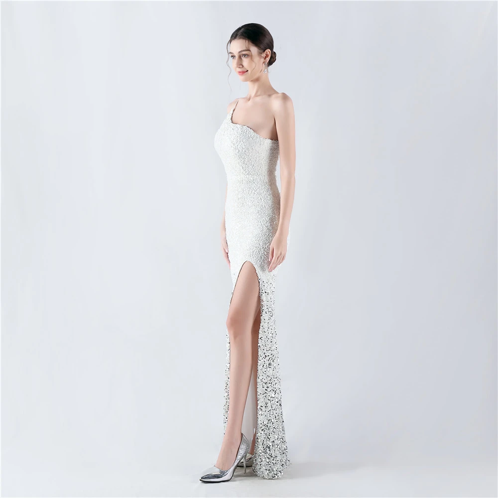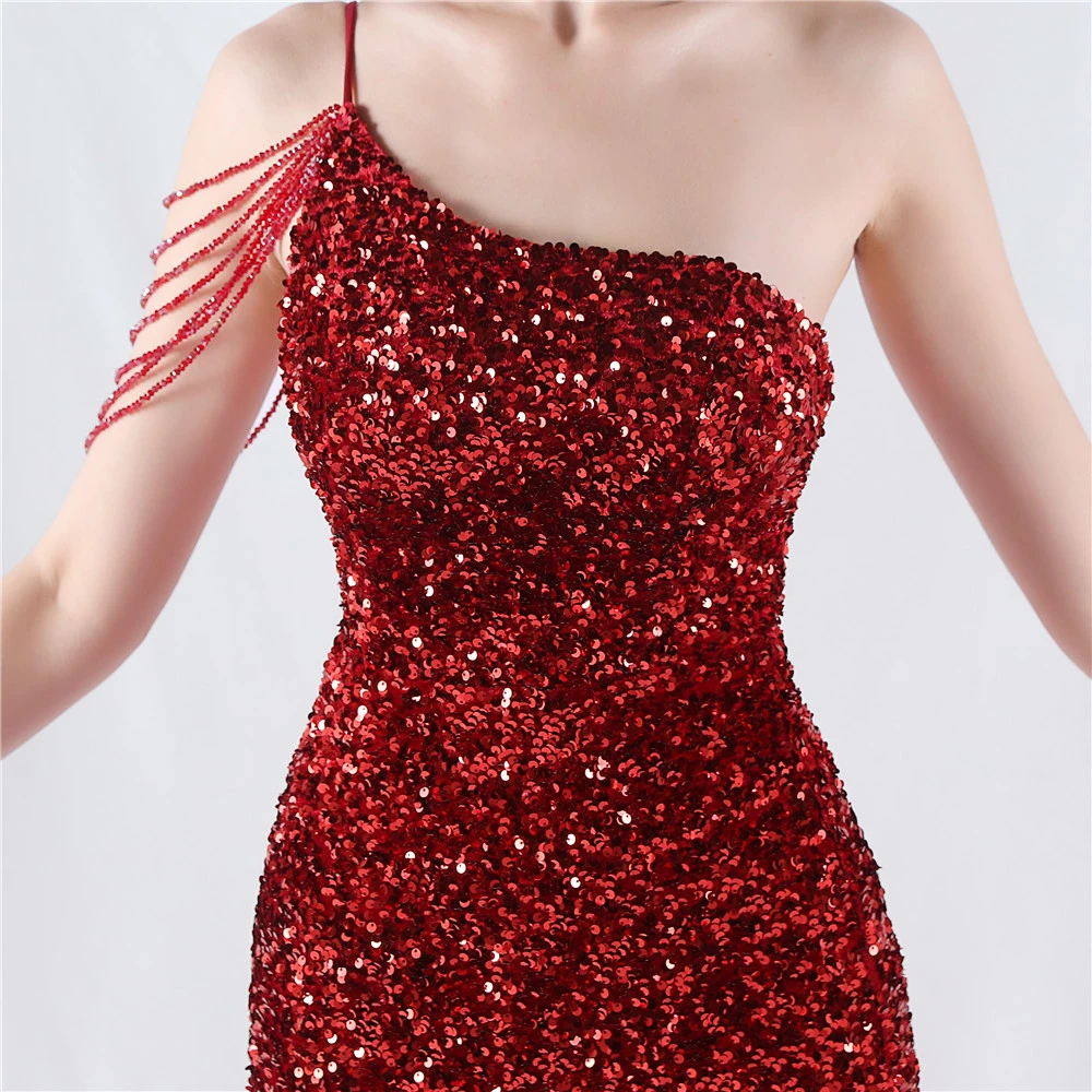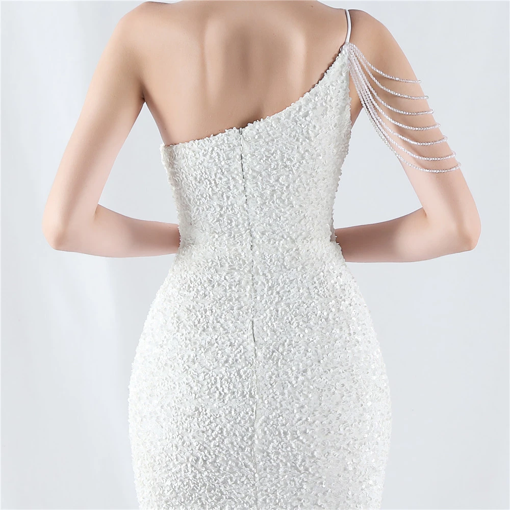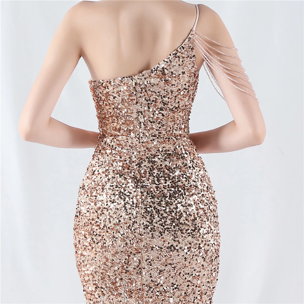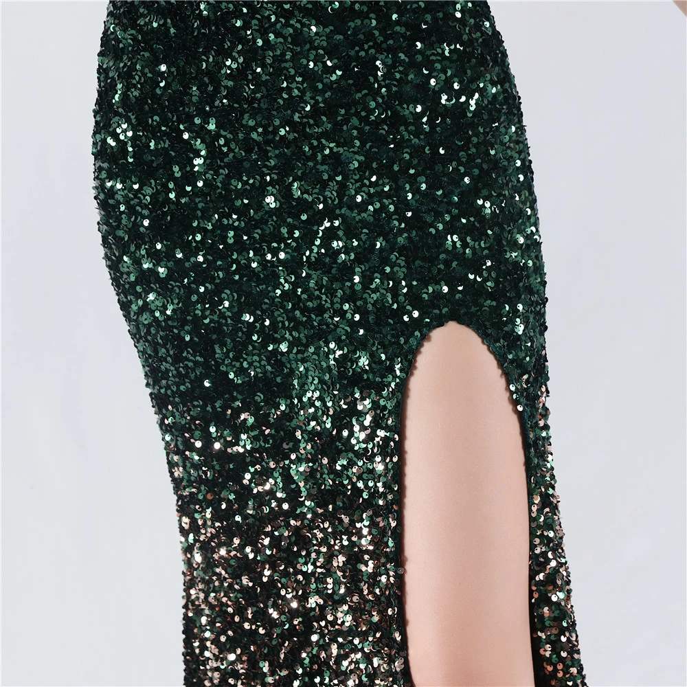 High-Density Gradient Velvet-Bottom Sequined One-Shoulder Beaded Suspender Evening Dress