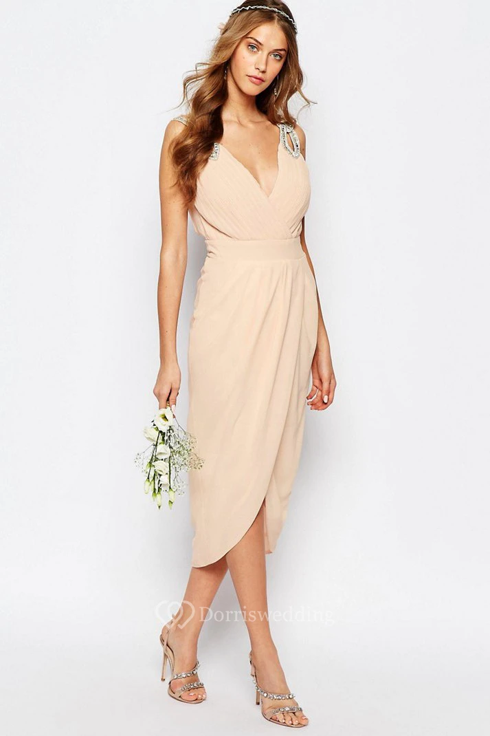 High-Low Beaded Sleeveless V-Neck Chiffon Bridesmaid Dress