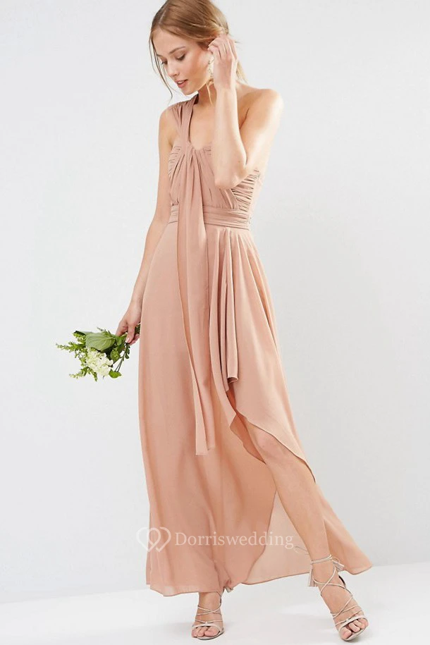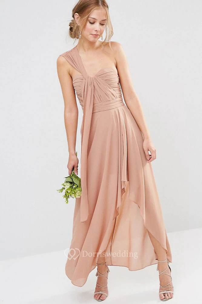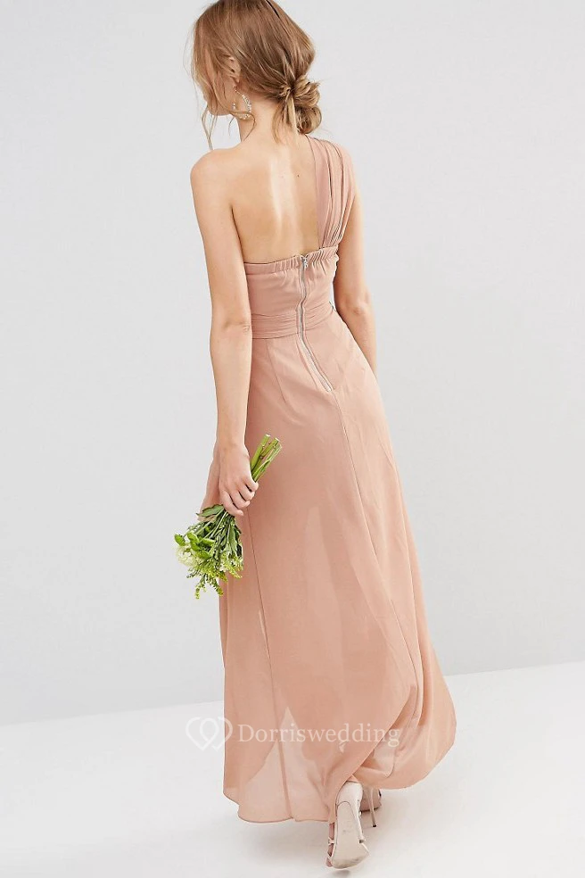 High-Low Sleeveless One-Shoulder Ruched Chiffon Pink Bridesmaid Dress