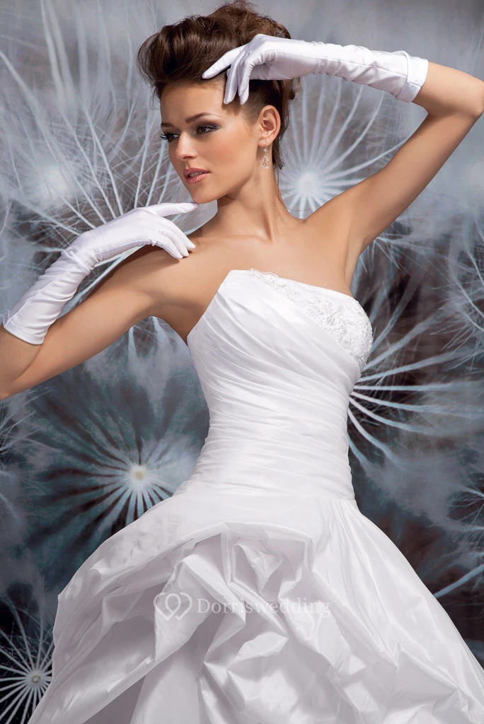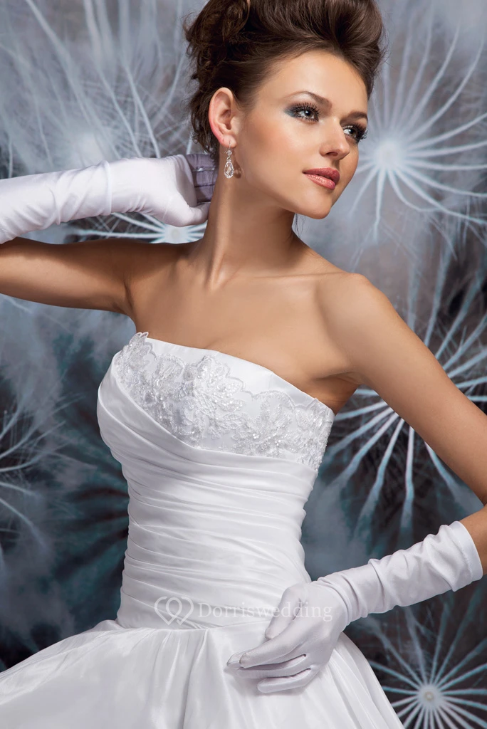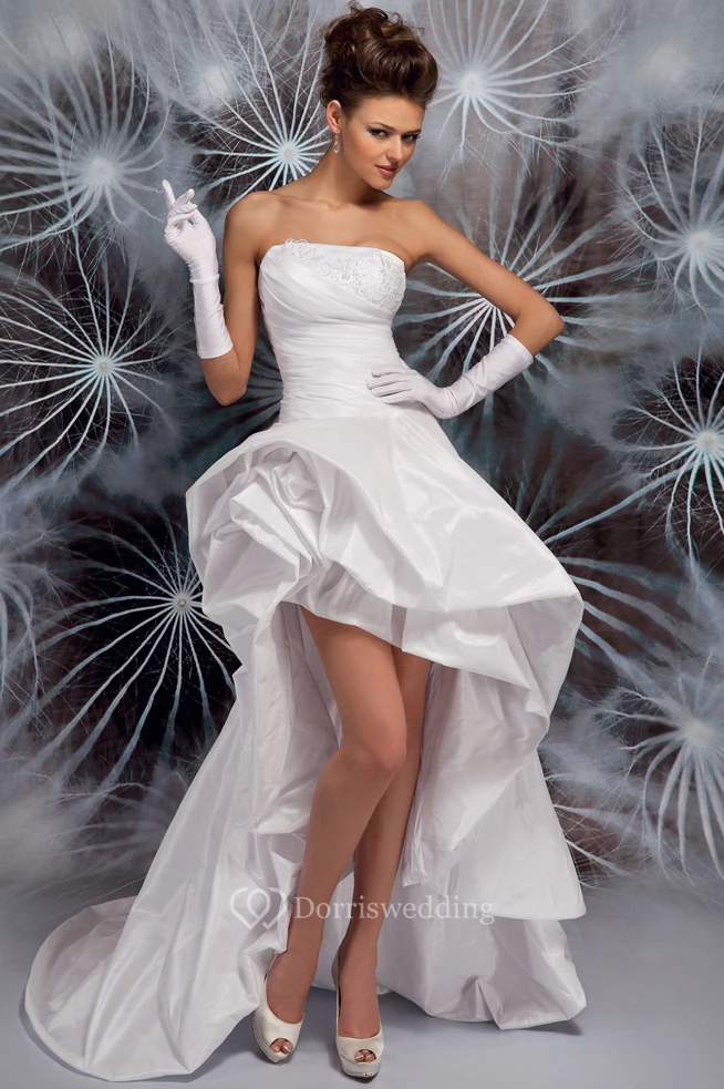 High-Low Strapless Ruffled Appliqued Satin Wedding Dress With Sweep Train