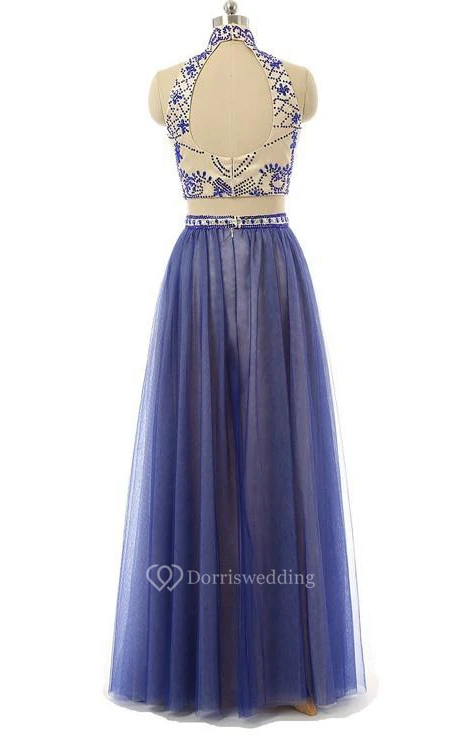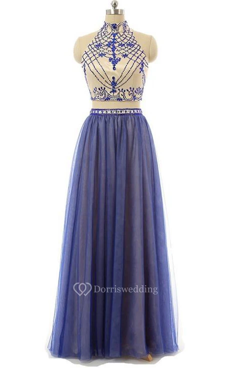 High Neck A-Line Two Pieces Beading Floor-Length Prom Dress