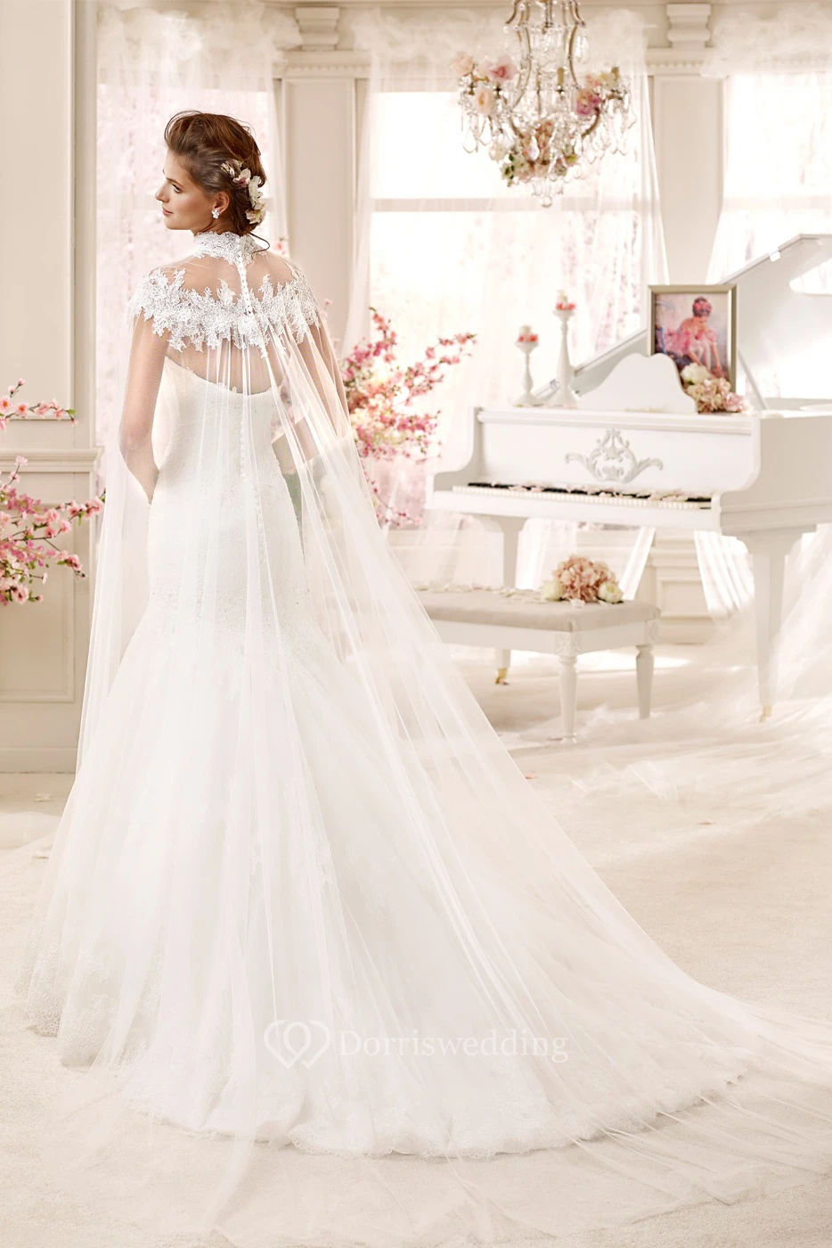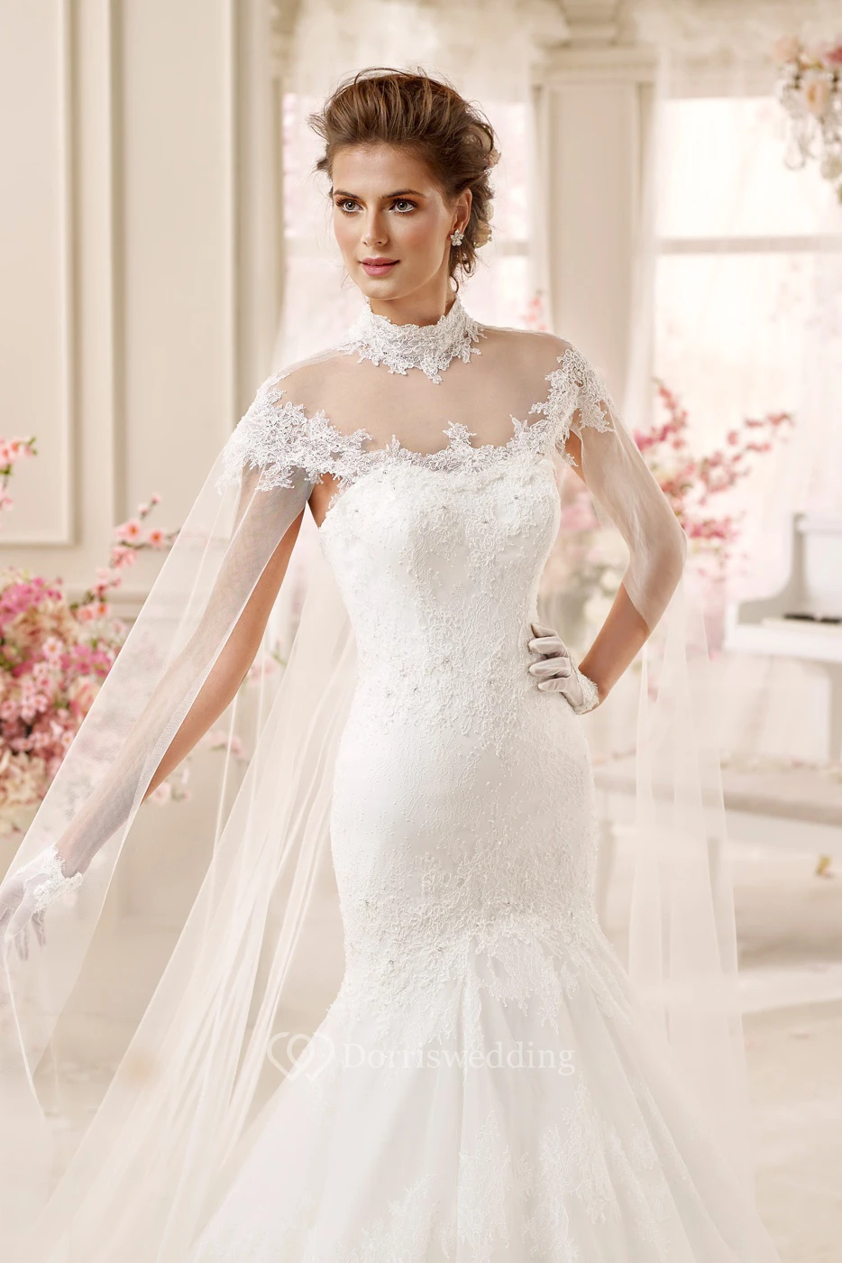 High-neck Applique Mermaid Wedding Dress with Long Tulle Cap