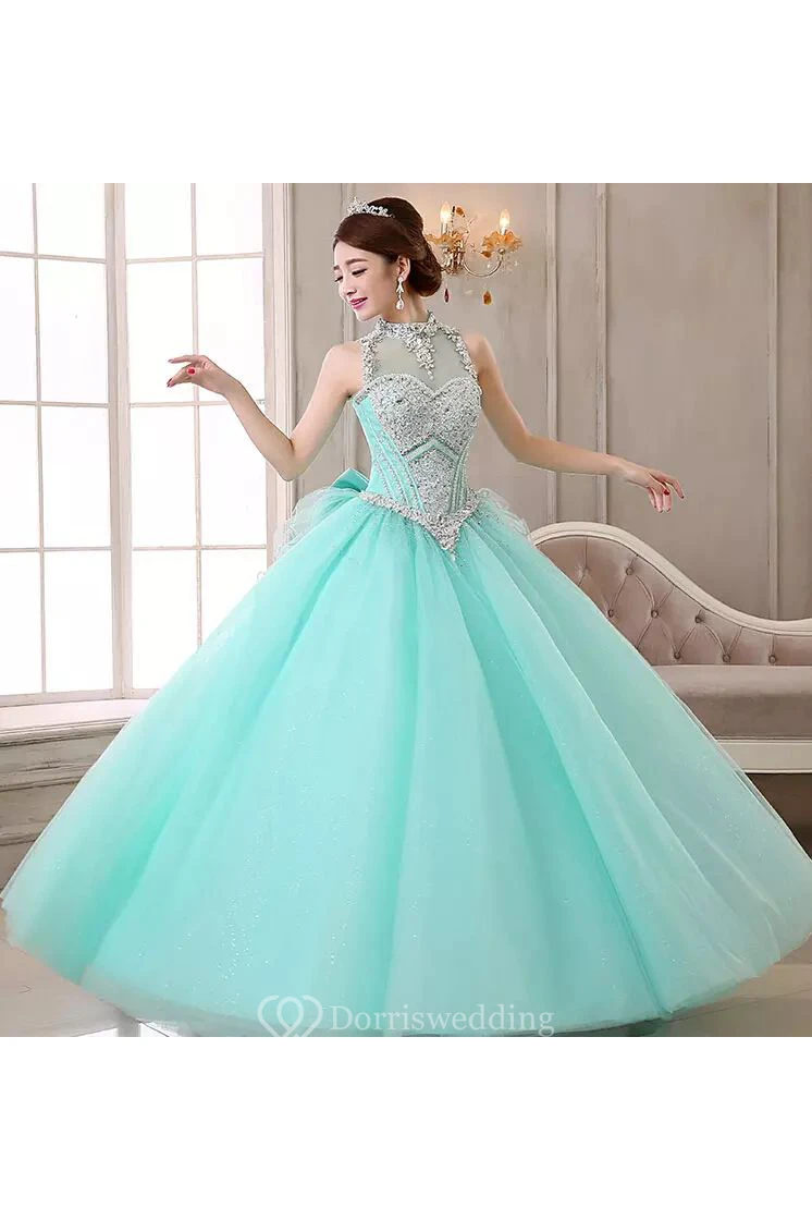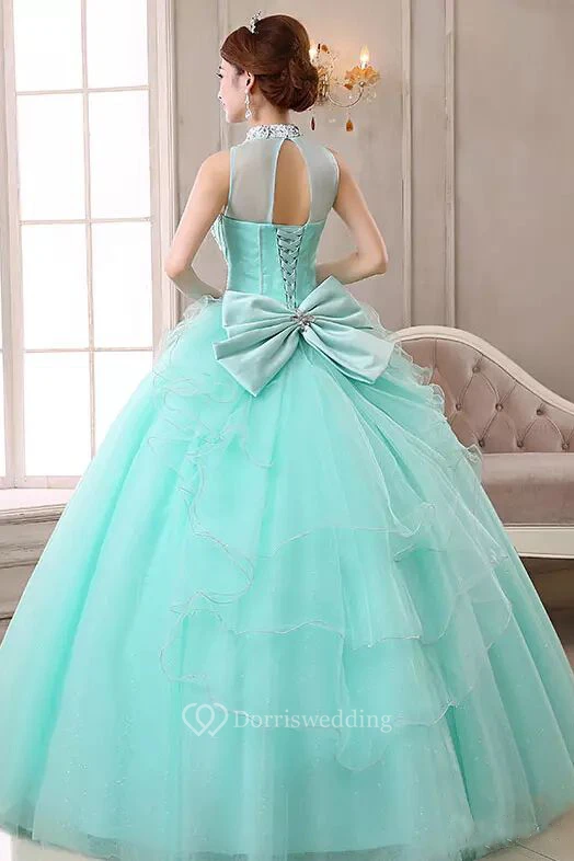 High Neck Ball Gown Floor-length Sleeveless Organza Tulle Prom Dress with Lace-up Keyhole Back