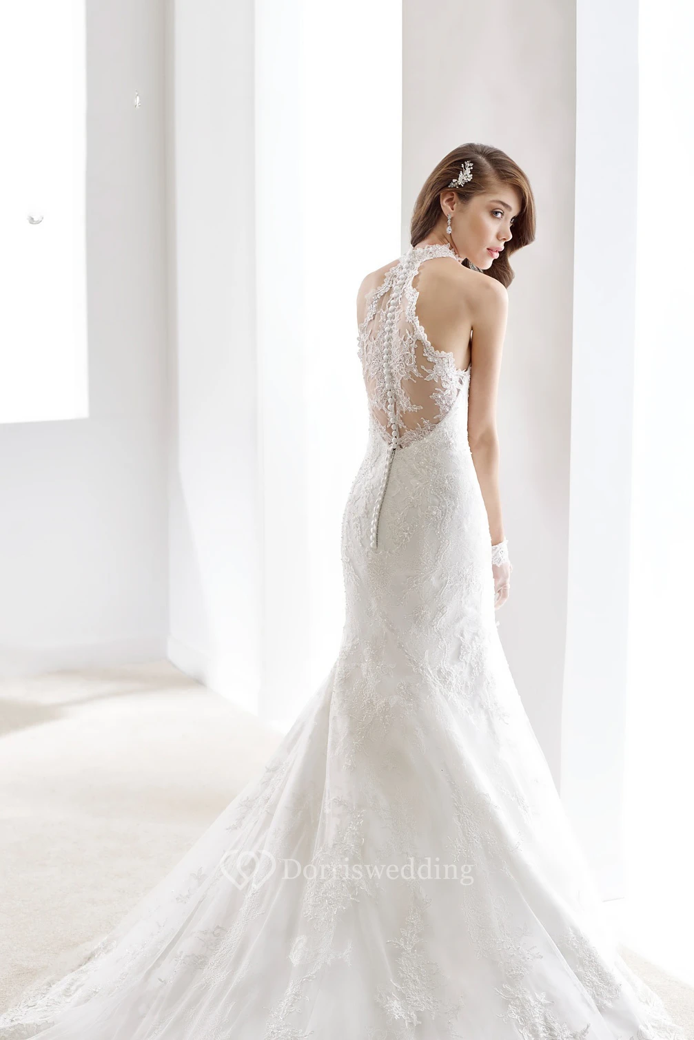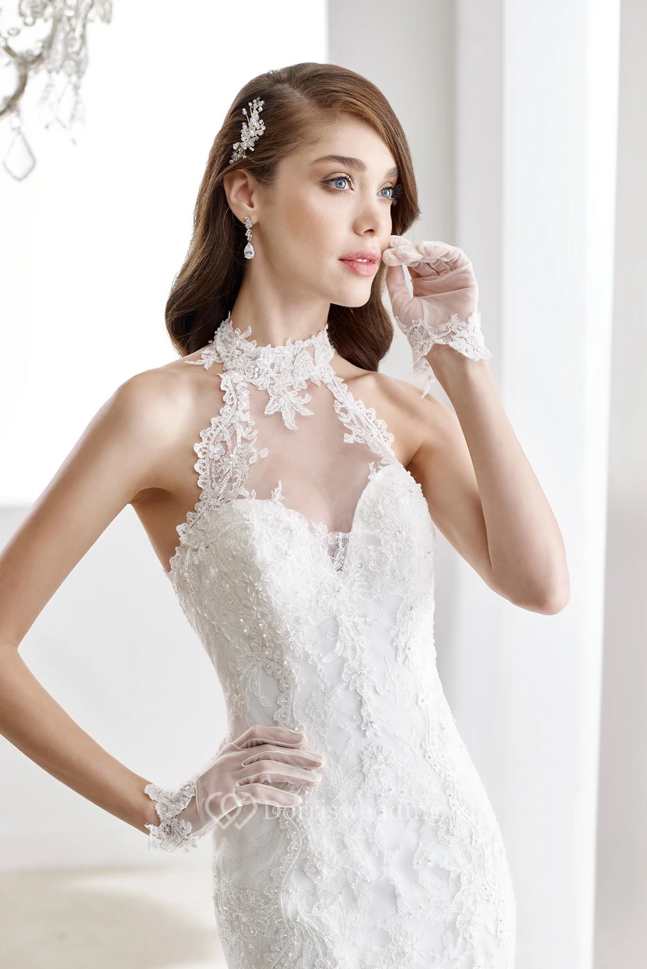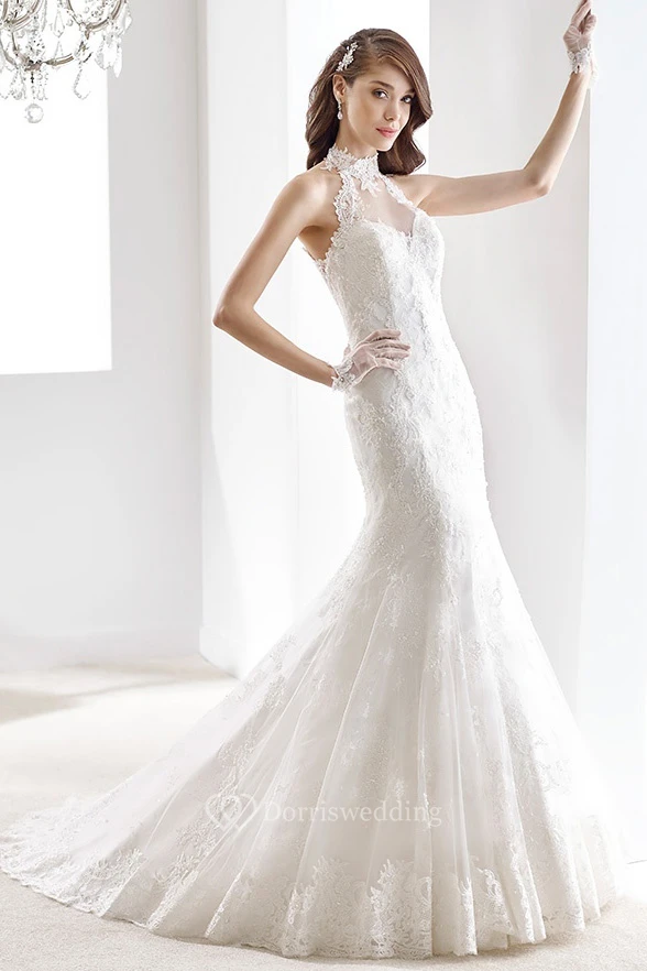 High-neck Brush-train Mermaid Lace Wedding Gown with Illusive Neckline And Back