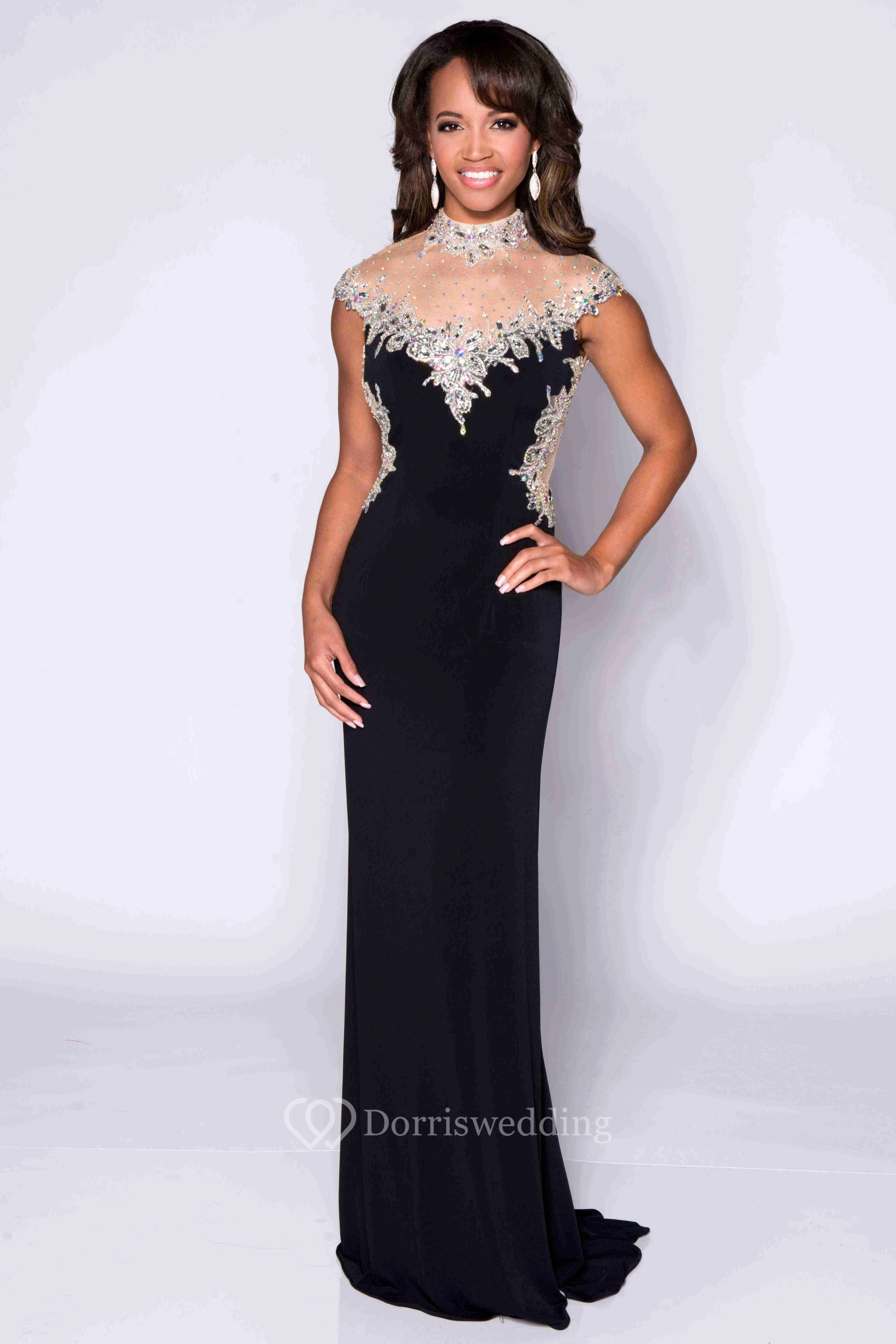 High Neck Cap Sleeve Keyhole Back Jersey Prom Dress With Shining Top