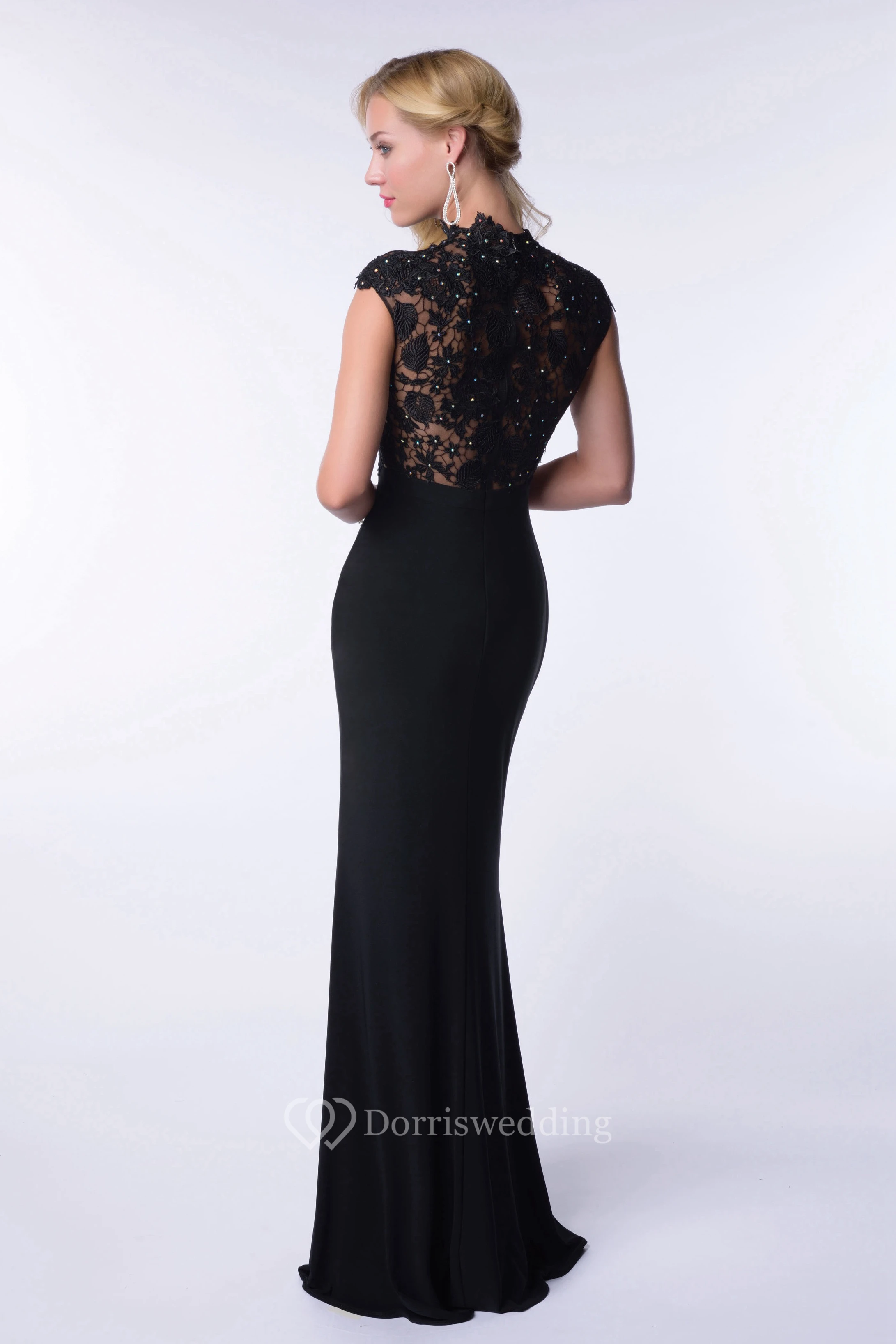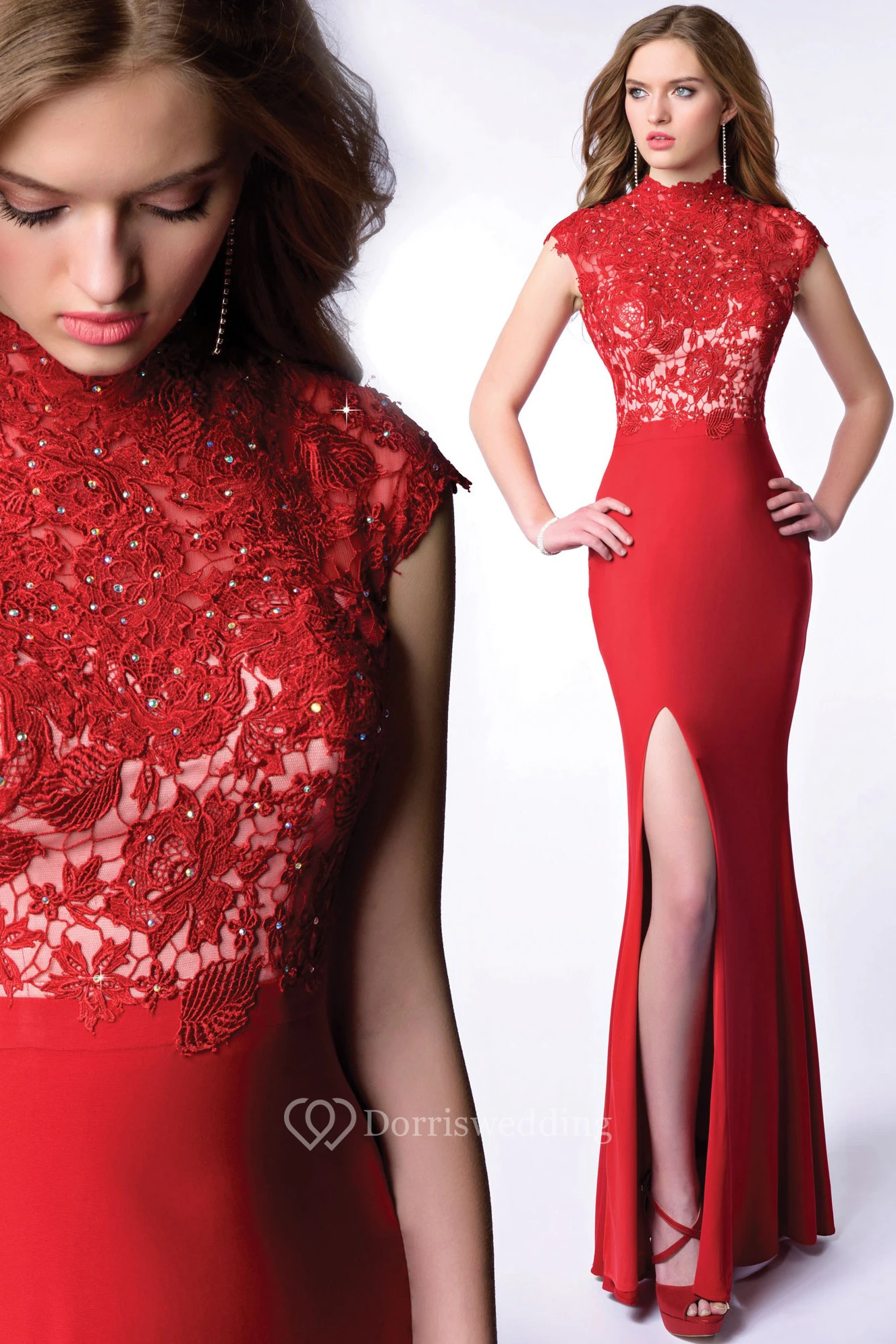 High Neck Cap Sleeve Sheath Jersey Lace Bodice Homecoming Dress With Pearls