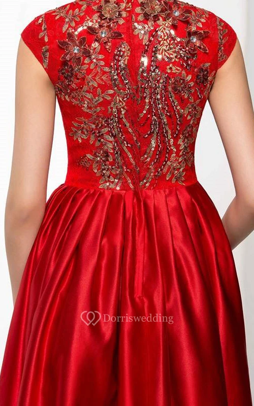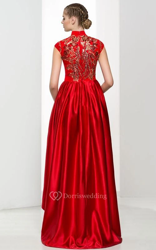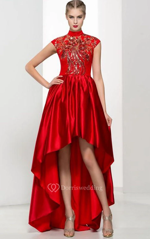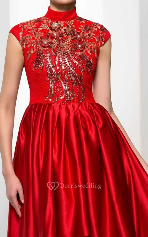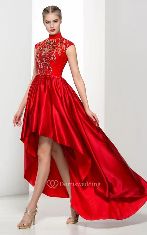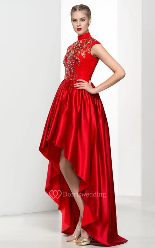 High Neck Cap Sleeves Appliques Beading Asymmetry Prom Dress